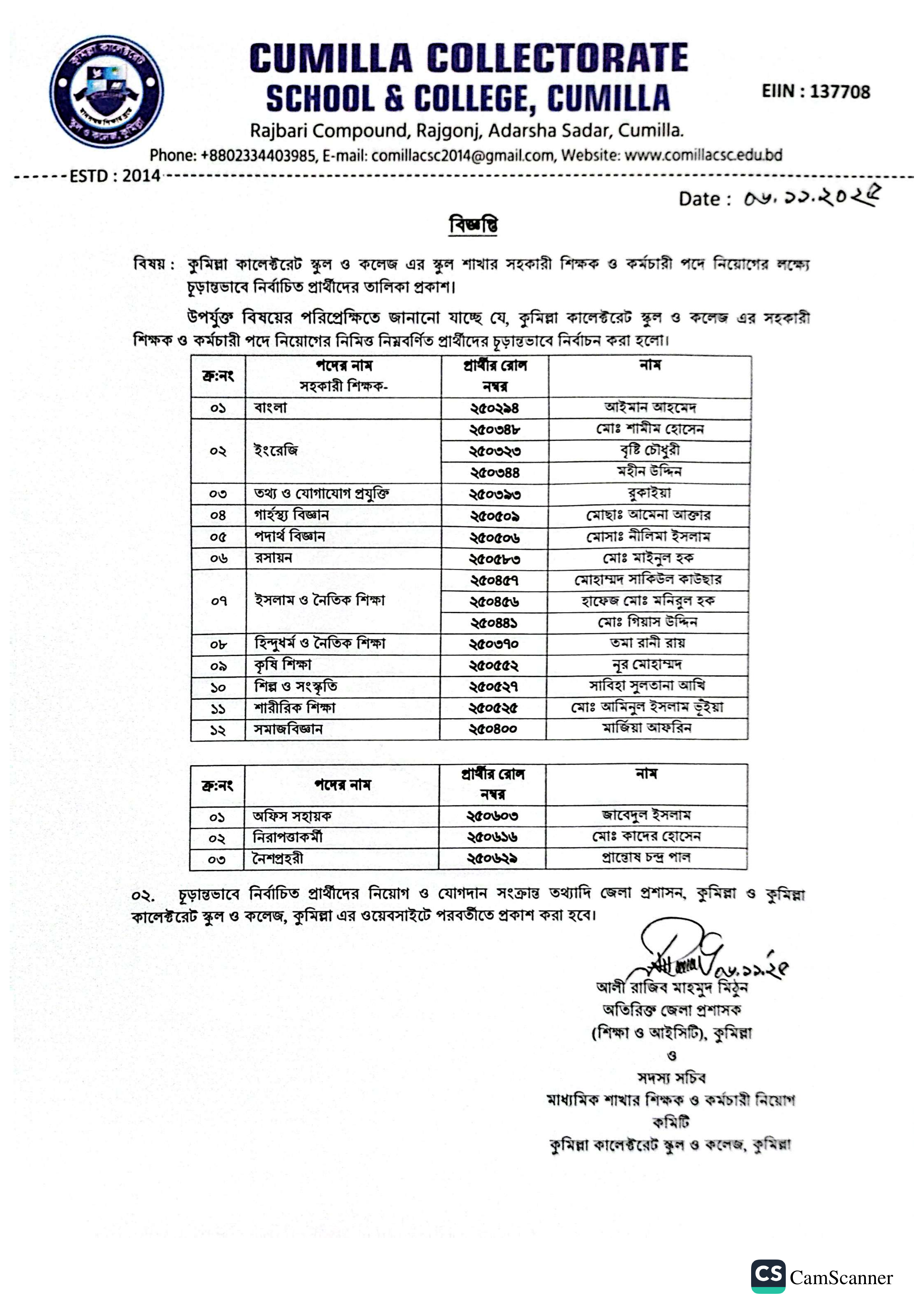 কুমিল্লা কালেক্টরেট স্কুল ও কলেজের সহকারী শিক্ষক ও কর্মচারী পদে নিয়োগের জন্য চূড়ান্তভাবে নির্বাচিত প্রার্থীদের তালিকা প্রকাশ করা হয়েছে। বিজ্ঞপ্তি অনুযায়ী, স্কুল শাখার সহকারী শিক্ষক ও কর্মচারী পদে নিয়োগের নিমিত্ত প্রার্থীদের চূড়ান্তভাবে নির্বাচন করা হয়েছে।
