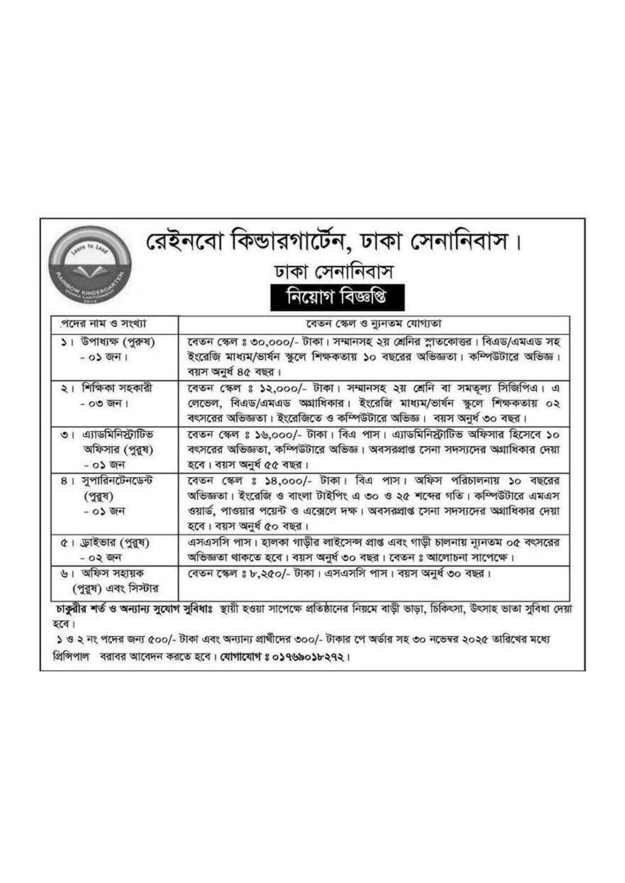 - শিক্ষিকা সহকারী: ৩ জন। বেতন স্কেল: ১২,০০০/- টাকা। সম্মানসহ ২য় শ্রেণীর স্নাতক/স্নাতকোত্তর, বিএড/এমএড অগ্রাধিকার। ইংরেজি মাধ্যম/ভার্সন স্কুলে শিক্ষকতায় ০২ বছরের অভিজ্ঞতা। ইংরেজি ও কম্পিউটারে অভিজ্ঞ। বয়স অনূর্ধ্ব ৩০ বছর।