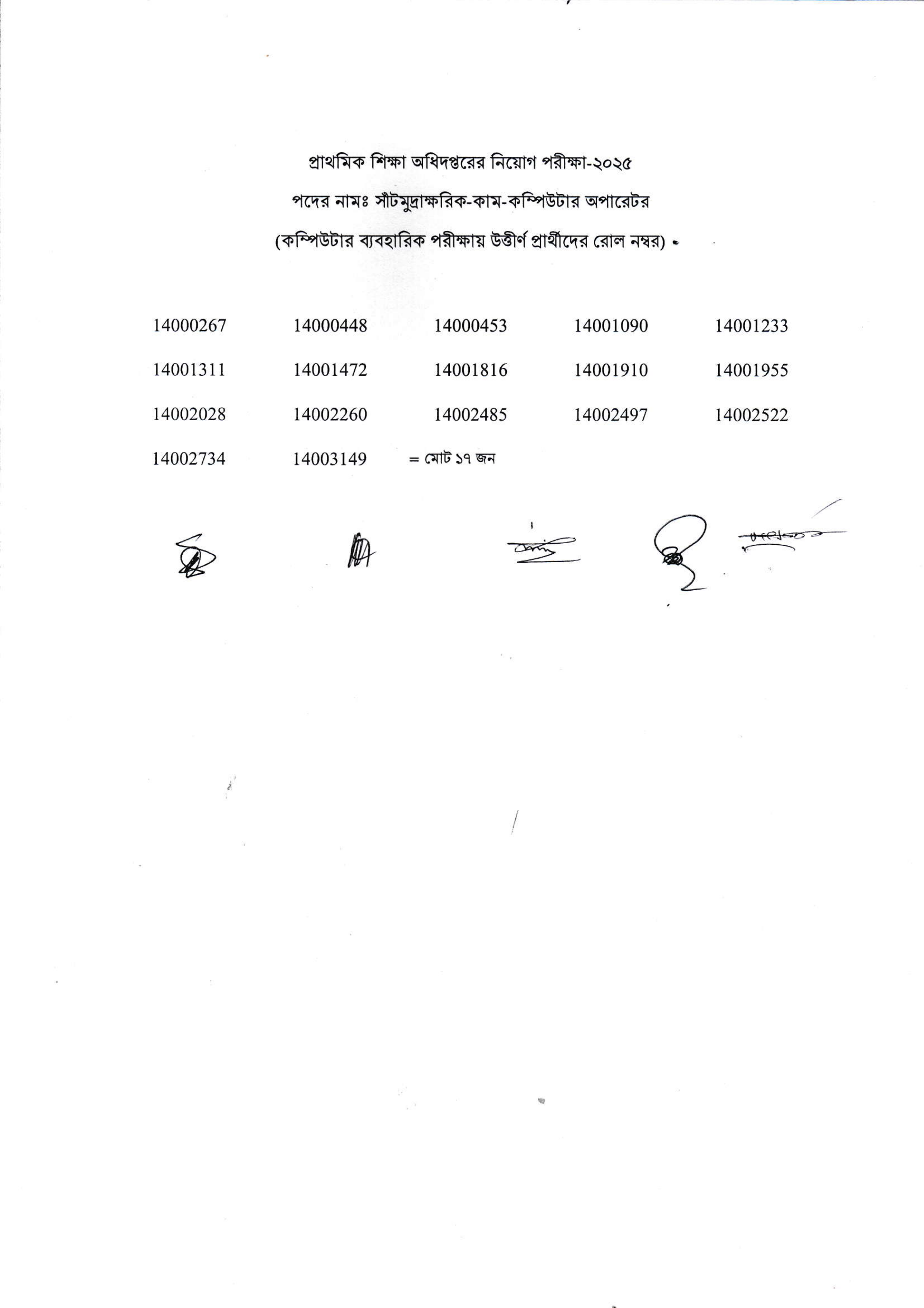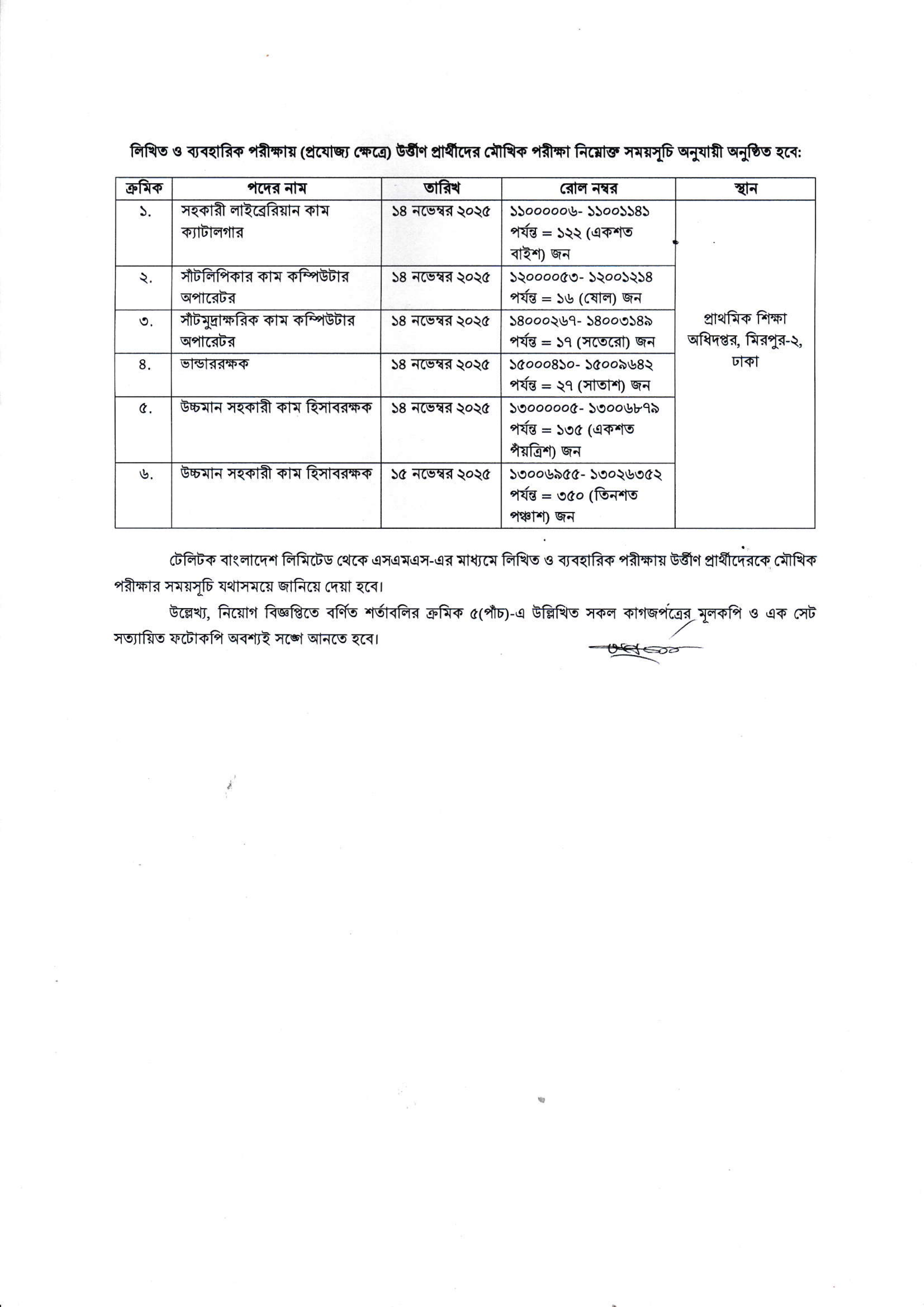 - এছাড়াও, কম্পিউটার ব্যবহারিক পরীক্ষায় উত্তীর্ণ আরও একটি পদের জন্য মোট ১৭ জন প্রার্থী মৌখিক পরীক্ষার জন্য নির্বাচিত হয়েছেন, যার পরীক্ষা ১৪ নভেম্বর ২০২৫ তারিখে অনুষ্ঠিত হবে।