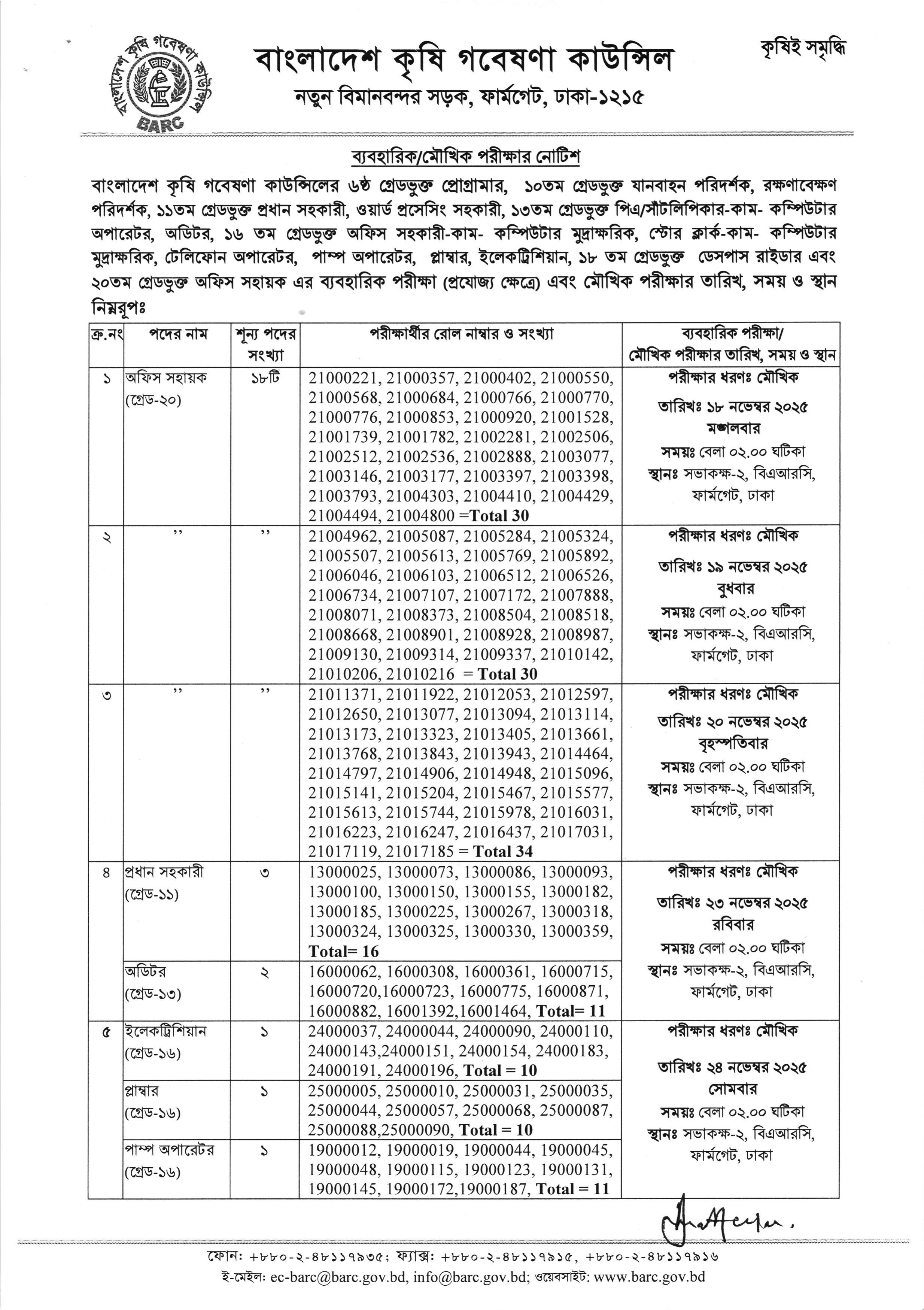 বাংলাদেশ কৃষি গবেষণা কাউন্সিল (BARC) তাদের রাজস্ব খাতভুক্ত শূন্য পদসমূহে জনবল নিয়োগের জন্য অনুষ্ঠিত লিখিত পরীক্ষায় উত্তীর্ণ মোট ২৪৫ জন প্রার্থীর ব্যবহারিক (প্রযোজ্য ক্ষেত্রে) ও মৌখিক পরীক্ষার সময়সূচী প্রকাশ করেছে।