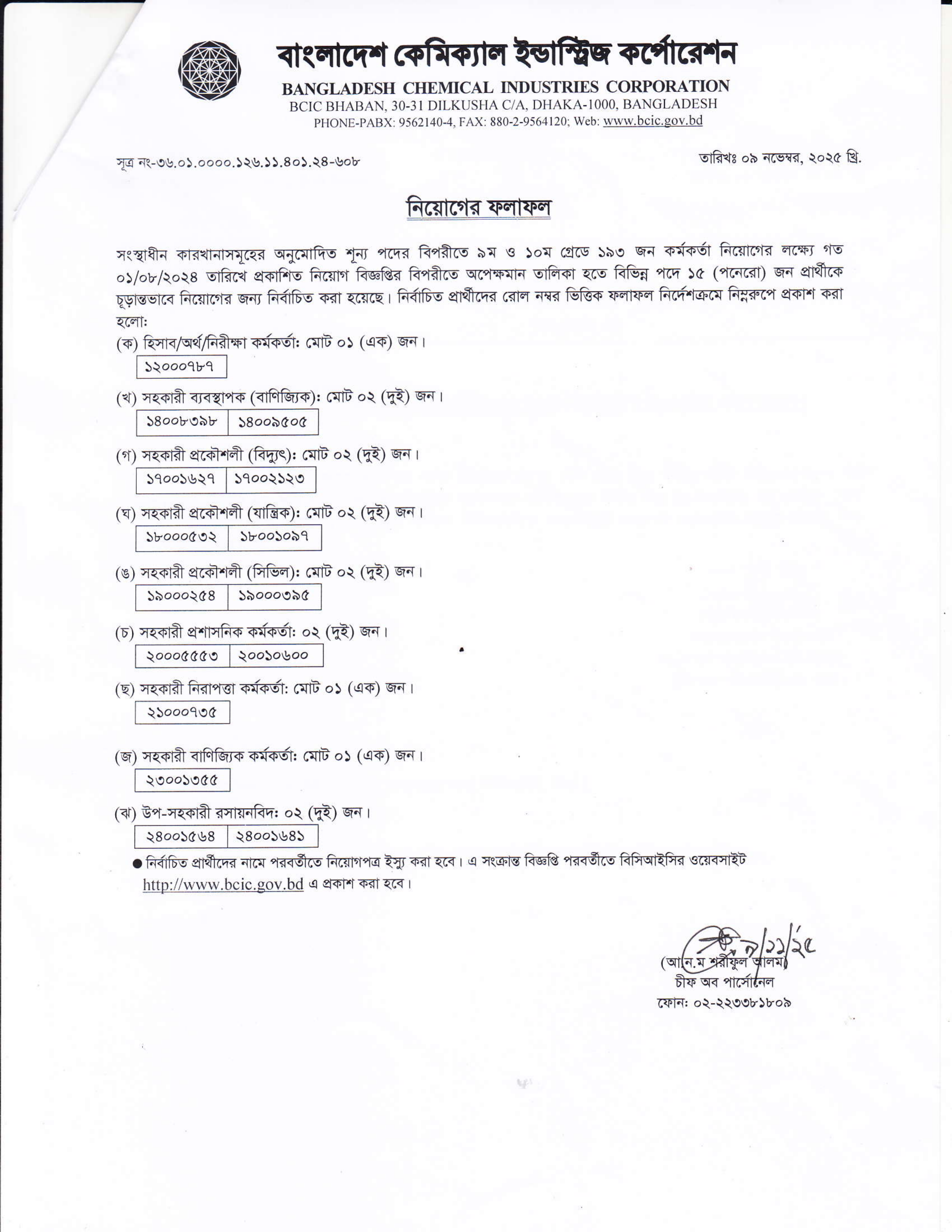 বাংলাদেশ কেমিক্যাল ইন্ডাস্ট্রিজ কর্পোরেশন (BCIC) কর্তৃক সংস্থাধীন কারখানাসমূহের অনুমোদিত শূন্য পদের বিপরীতে ৯ম ও ১০ম গ্রেডে বিভিন্ন পদে ১৫ (পনেরো) জন কর্মকর্তা নিয়োগের চূড়ান্ত ফলাফল প্রকাশ করা হয়েছে।