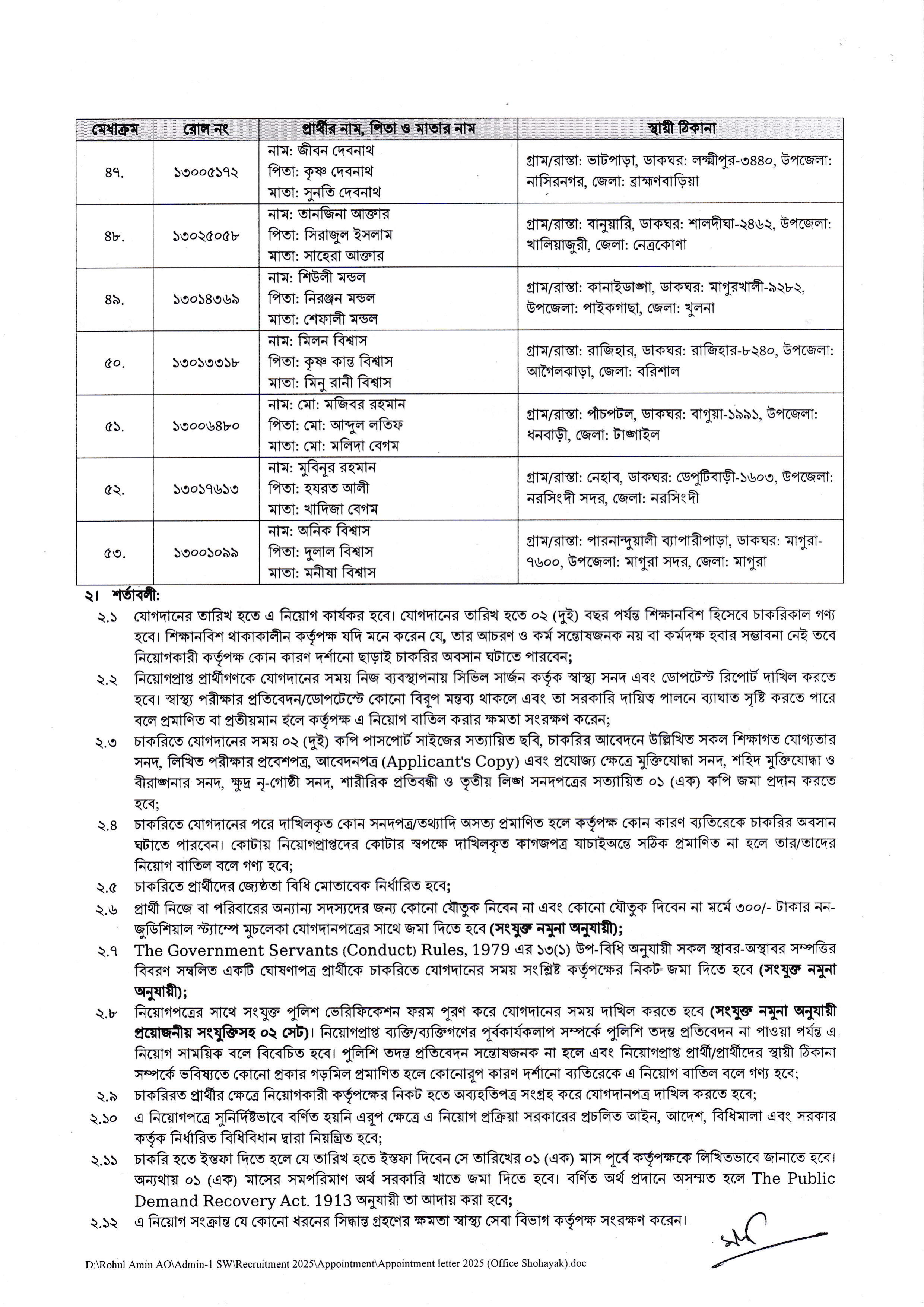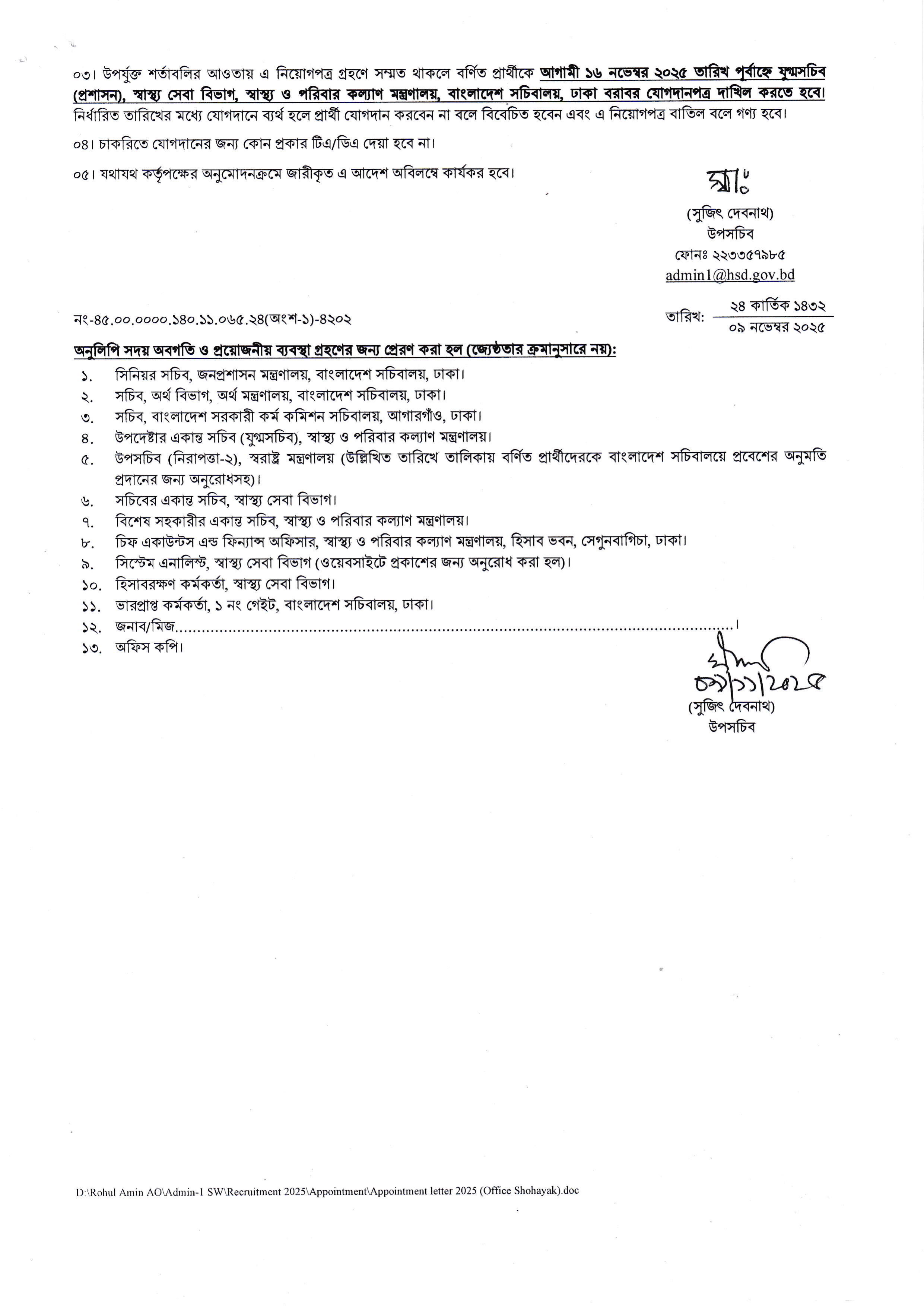 • নিয়োগপ্রাপ্ত প্রার্থীদের আগামী ১৬ নভেম্বর ২০২৫ তারিখের মধ্যে যুগ্মসচিব (প্রশাসন), স্বাস্থ্য সেবা বিভাগ, স্বাস্থ্য ও পরিবার কল্যাণ মন্ত্রণালয়, বাংলাদেশ সচিবালয়, ঢাকা বরাবর যোগদানপত্র দাখিল করতে হবে।