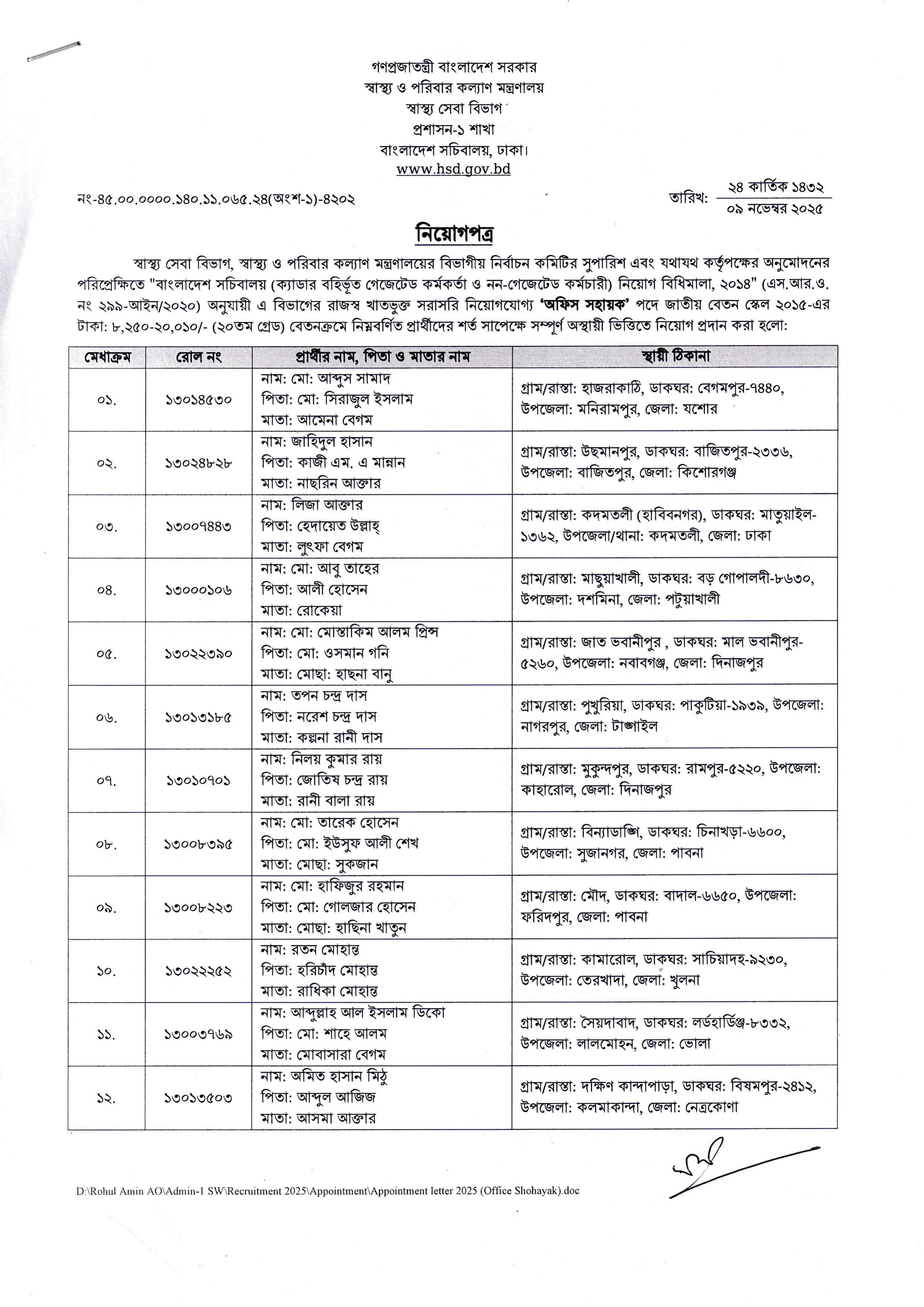 স্বাস্থ্য ও পরিবার কল্যাণ মন্ত্রণালয়ের স্বাস্থ্য সেবা বিভাগের অধীনে রাজস্ব খাতভুক্ত অফিস সহায়ক পদে মোট ৫৩ (তিপ্পান্ন) জন প্রার্থীকে সম্পূর্ণ অস্থায়ী ভিত্তিতে নিয়োগ প্রদান করা হয়েছে। এই নিয়োগপত্র অনুযায়ী, নির্বাচিত প্রার্থীরা জাতীয় বেতন স্কেল ২০১৫-এর টাকা: ৮,২৫০-২০,০১০/- (২০তম গ্রেড) বেতনক্রমে নিয়োগ পেয়েছেন।