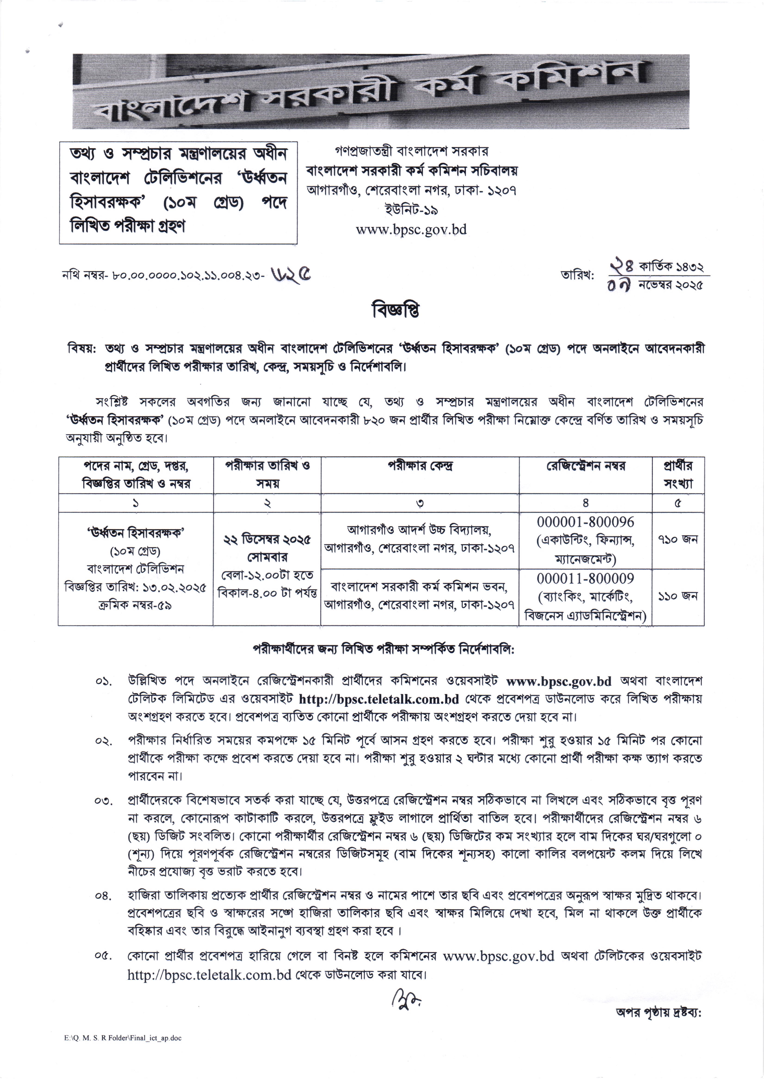 বাংলাদেশ সরকারী কর্ম কমিশন কর্তৃক তথ্য ও সম্প্রচার মন্ত্রণালয়ের অধীন বাংলাদেশ টেলিভিশনের “উর্ধ্বতন হিসাবরক্ষক” (১০ম গ্রেড) পদের লিখিত পরীক্ষার তারিখ, কেন্দ্র, সময়সূচি ও নির্দেশাবলি প্রকাশ করা হয়েছে। এই পদের জন্য অনলাইনে আবেদনকারী ৮২০ জন প্রার্থীর লিখিত পরীক্ষা অনুষ্ঠিত হবে।