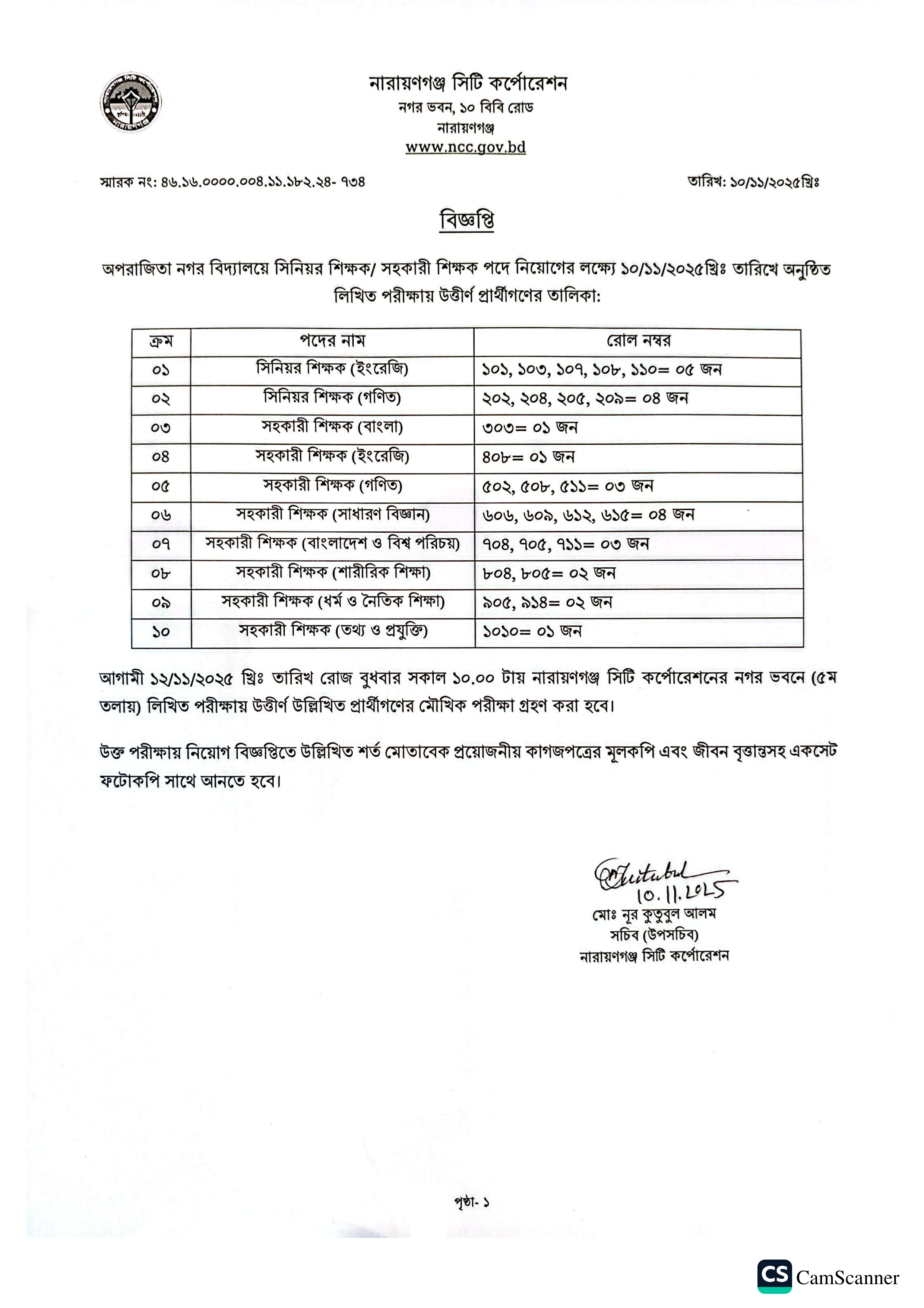 নারায়ণগঞ্জ সিটি কর্পোরেশন কর্তৃক অপরাজিতা নগর বিদ্যালয়ে সিনিয়র শিক্ষক/ সহকারী শিক্ষক পদে নিয়োগের লক্ষ্যে অনুষ্ঠিত লিখিত পরীক্ষার ফলাফল প্রকাশিত হয়েছে। লিখিত পরীক্ষায় উত্তীর্ণ প্রার্থীদের মৌখিক পরীক্ষার তারিখ ও সময় ঘোষণা করা হয়েছে।