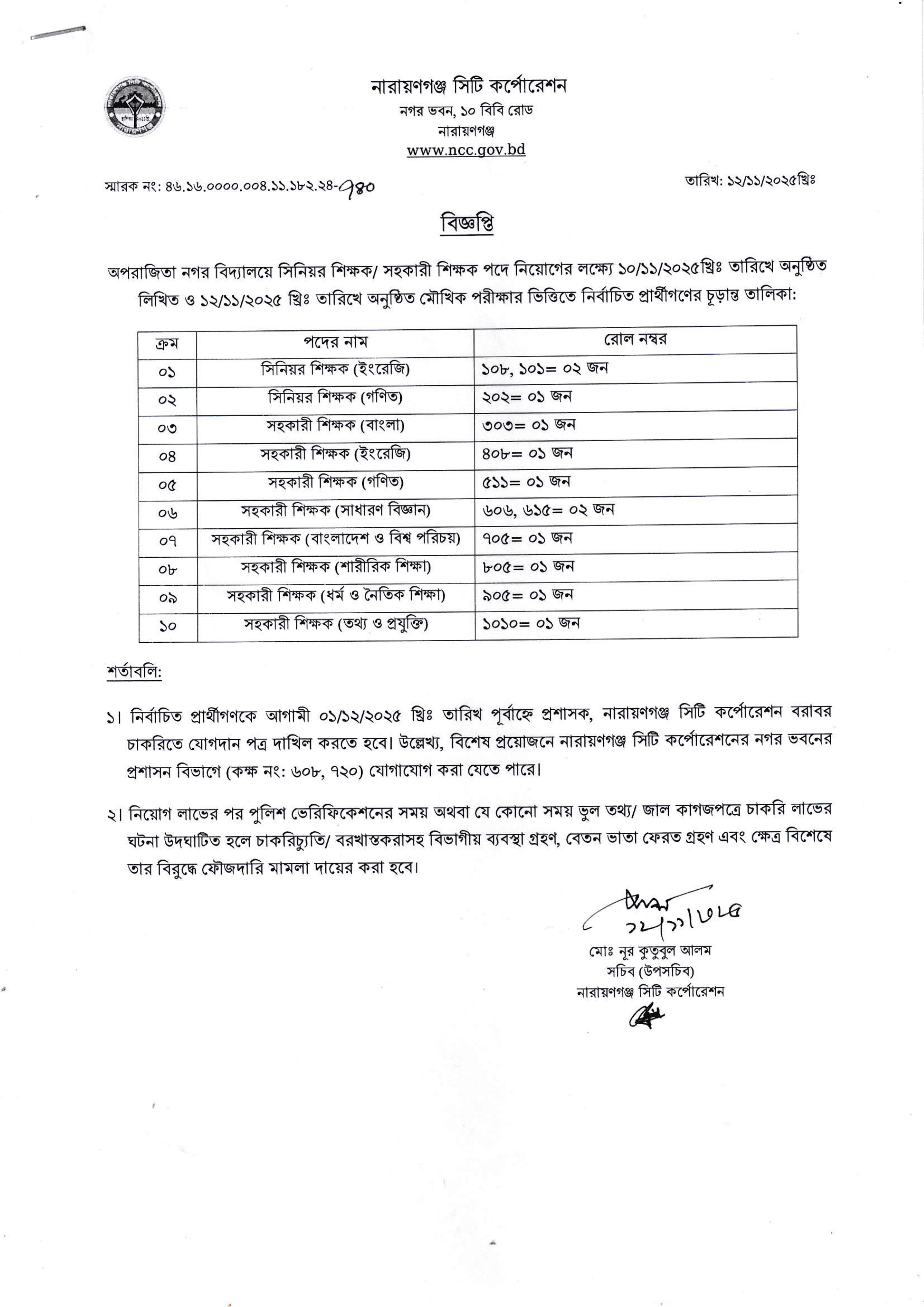 নির্বাচিত প্রার্থীগণকে আগামী ০১/১২/২০২৫ খ্রিঃ তারিখ পূর্বাহ্ন প্রশাসক, নারায়ণগঞ্জ সিটি কর্পোরেশন বরাবর চাকরিতে যোগদান পত্র দাখিল করতে হবে। বিশেষ প্রয়োজনে নারায়ণগঞ্জ সিটি কর্পোরেশনের নগর ভবনের প্রশাসন বিভাগে যোগাযোগ করা যেতে পারে।
