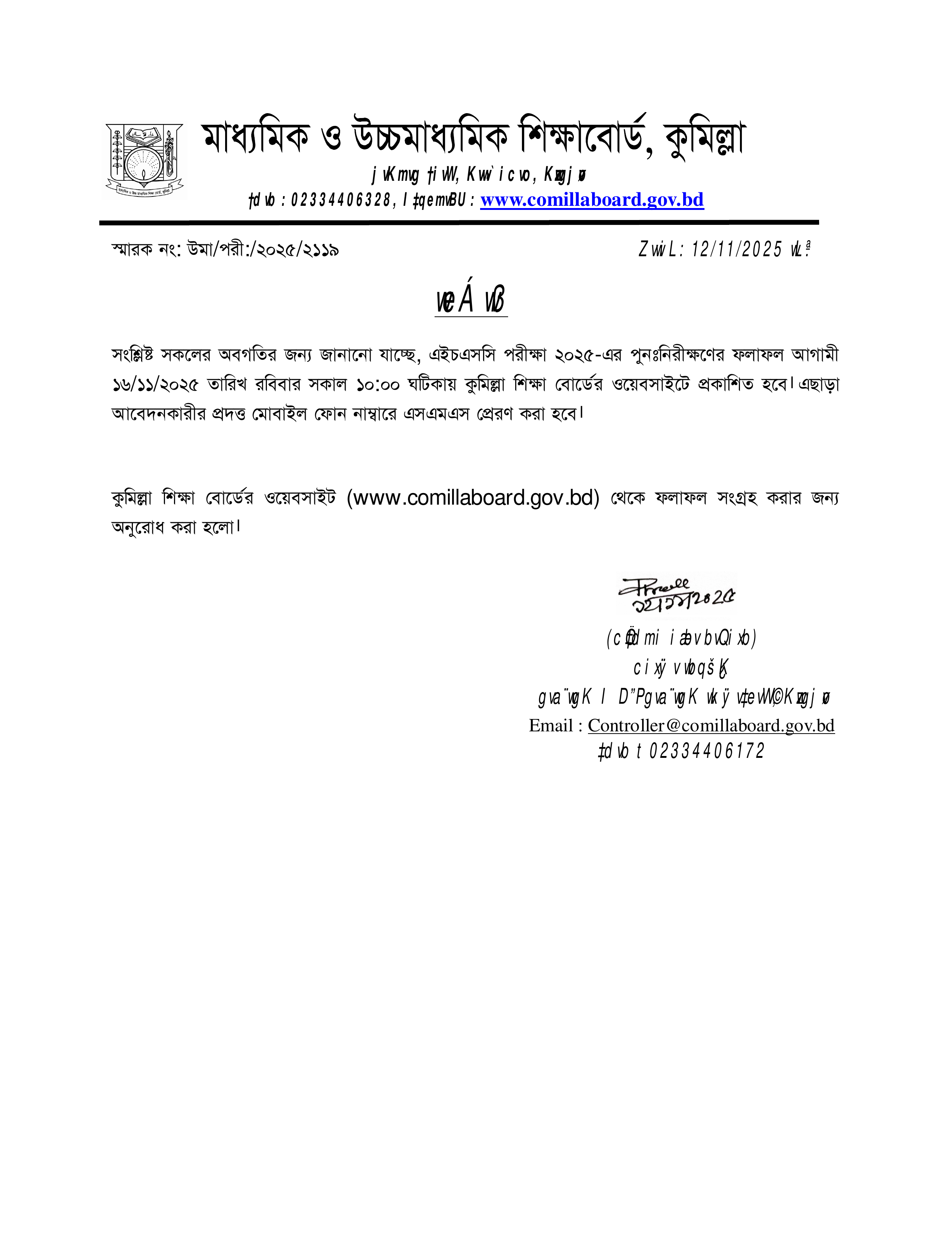 ফলাফল আগামী ১৬/১১/২০২৫ তারিখ রবিবার সকাল ১০:০০ ঘটিকায় কুমিল্লা শিক্ষা বোর্ডের ওয়েবসাইটে প্রকাশ করা হবে। আবেদনকারীগণ বোর্ডের ওয়েবসাইট থেকে ফলাফল সংগ্রহ করতে পারবেন।
