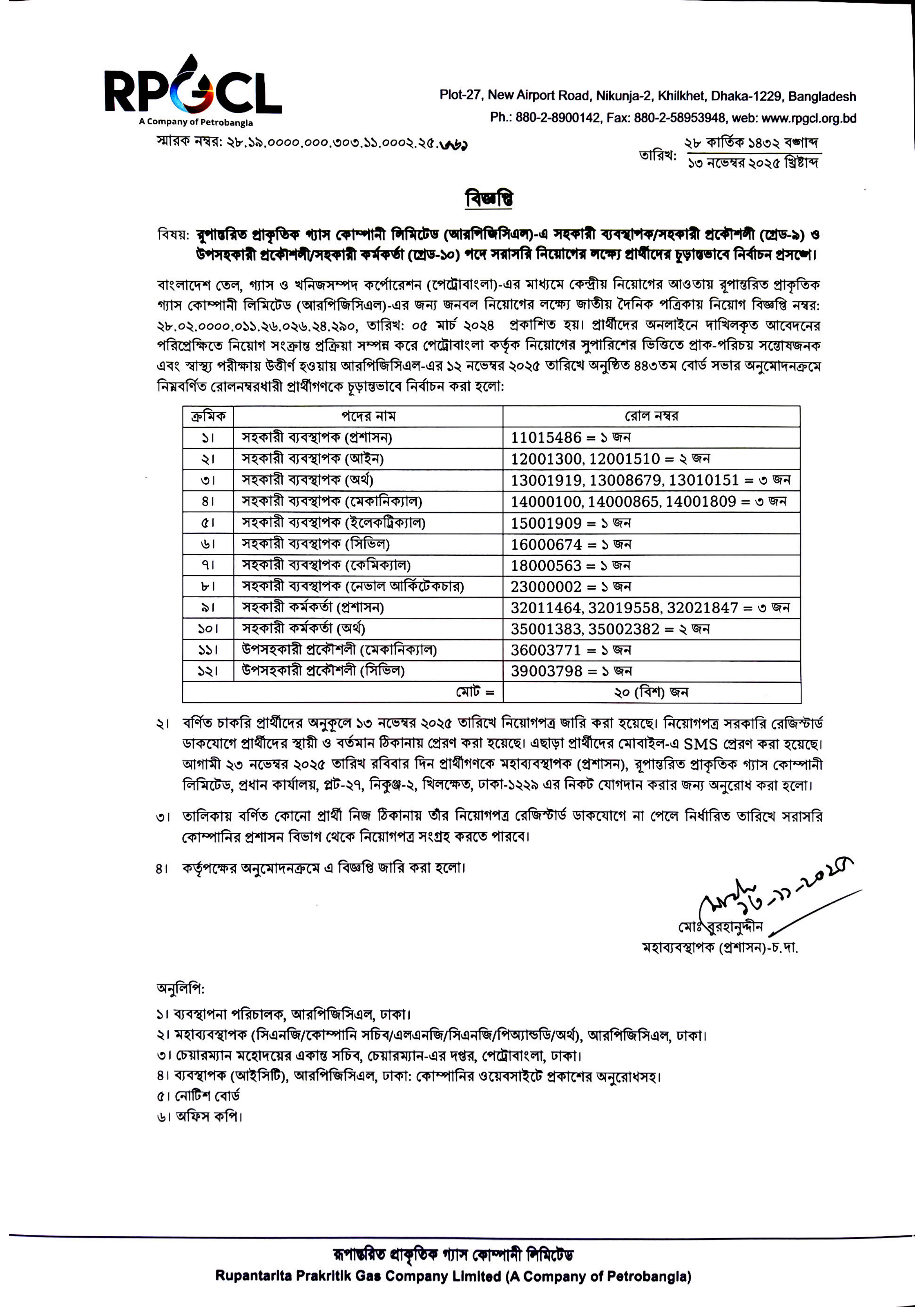 রুপান্তরিত প্রাকৃতিক গ্যাস কোম্পানী লিমিটেড (আরপিজিসিএল)-এর সহকারী ব্যবস্থাপক/সহকারী প্রকৌশলী (গ্রেড-৯) এবং উপসহকারী প্রকৌশলী/সহকারী কর্মকর্তা (গ্রেড-১০) পদে সরাসরি নিয়োগের লক্ষ্যে মোট ২০ জন প্রার্থীকে চূড়ান্তভাবে নির্বাচিত করা হয়েছে।