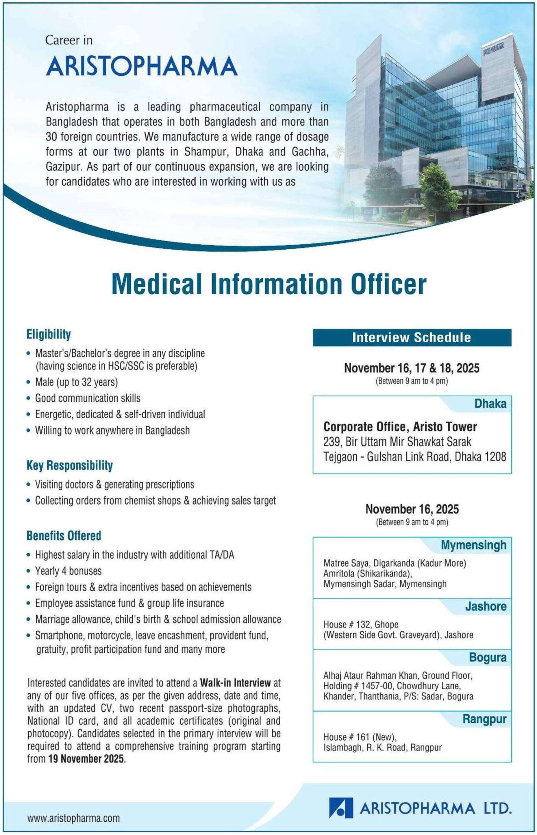 সরাসরি সাক্ষাৎকারে অ্যারিস্টোফার্মা- তে চাকরির সুবর্ণ সুযোগ