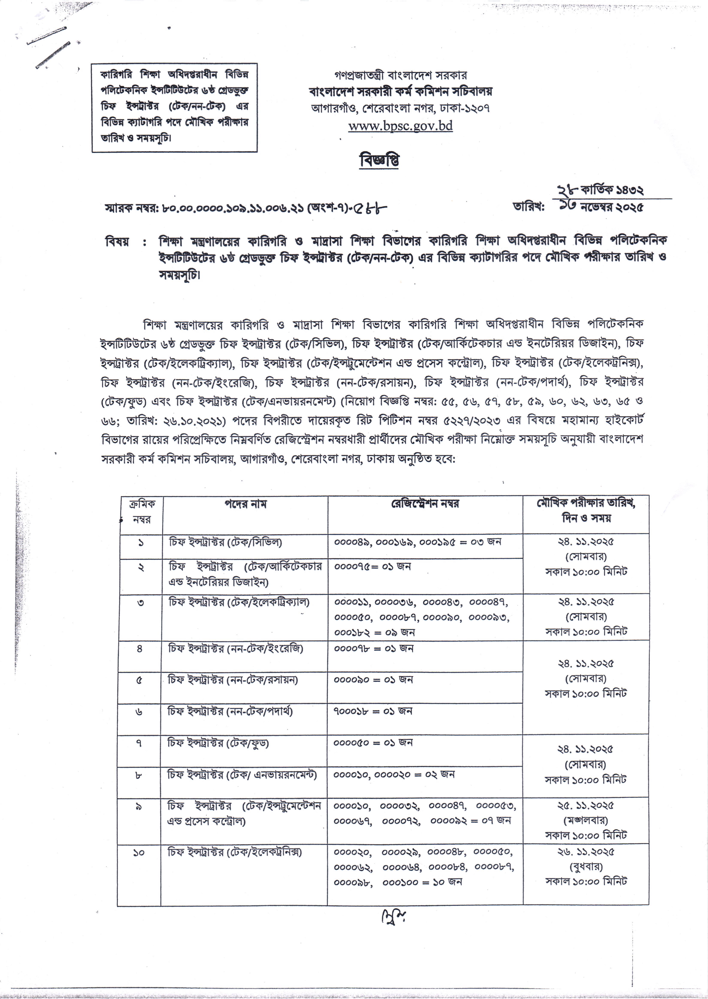 বাংলাদেশ সরকারী কর্ম কমিশন (BPSC) কর্তৃক শিক্ষা মন্ত্রণালয়ের কারিগরি ও মাদ্রাসা শিক্ষা বিভাগের কারিগরি শিক্ষা অধিদপ্তরাধীন বিভিন্ন পলিটেকনিক ইন্সটিটিউটের ৬ষ্ঠ গ্রেডভুক্ত চিফ ইন্সট্রাক্টর (টেক/নন-টেক) পদের মৌখিক পরীক্ষার সময়সূচি প্রকাশ করা হয়েছে।