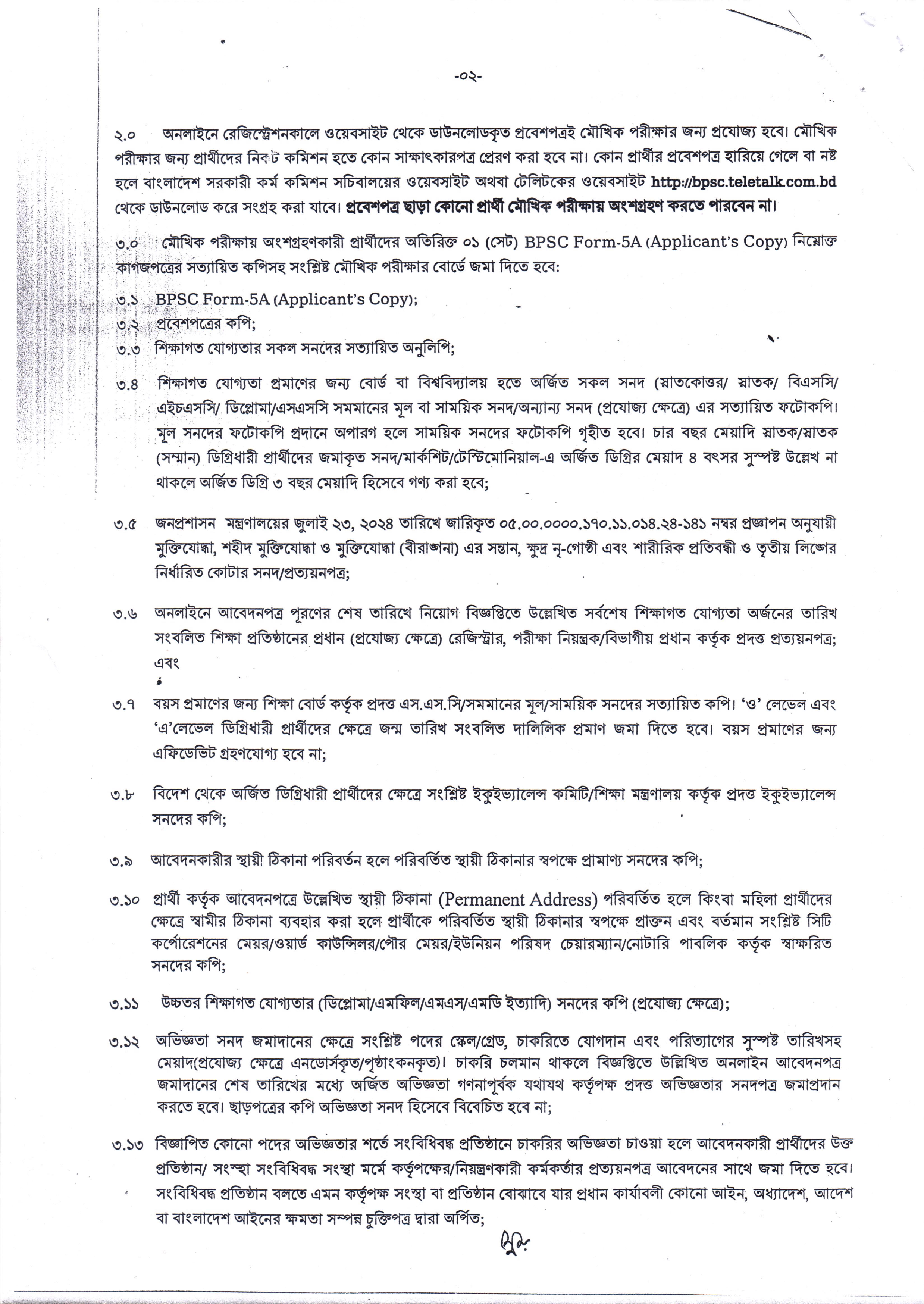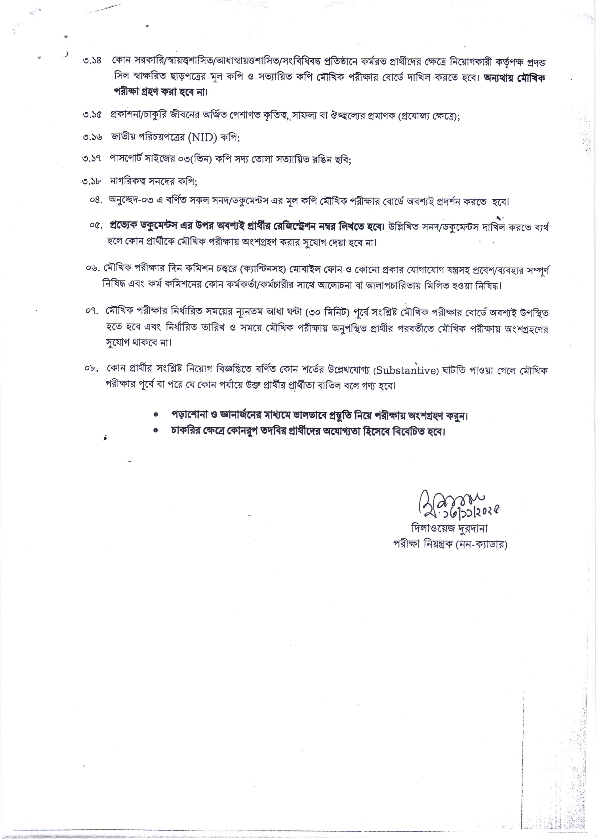 প্রার্থীদের অনলাইনে রেজিস্ট্রেশনকালে ডাউনলোডকৃত প্রবেশপত্র, শিক্ষাগত যোগ্যতার সকল সনদ ও এর সত্যায়িত অনুলিপি, বয়সের প্রমাণপত্র (এস.এস.সি/সমমানের মূল/সাময়িক সনদ), জাতীয় পরিচয়পত্র, ০৩ (তিন) কপি সদ্য তোলা সত্যায়িত রঙিন ছবি এবং অন্যান্য প্রয়োজনীয় কাগজপত্রসহ মৌখিক পরীক্ষার কমপক্ষে ৩০ মিনিট পূর্বে উপস্থিত থাকতে হবে। সরকারি/স্বায়ত্তশাসিত প্রতিষ্ঠানে কর্মরত প্রার্থীদের ক্ষেত্রে নিয়োগকারী কর্তৃপক্ষ প্রদত্ত ছাড়পত্রের মূল কপি দাখিল করা আবশ্যক। প্রবেশপত্র ছাড়া কোনো প্রার্থী মৌখিক পরীক্ষায় অংশগ্রহণ করতে পারবেন না।
