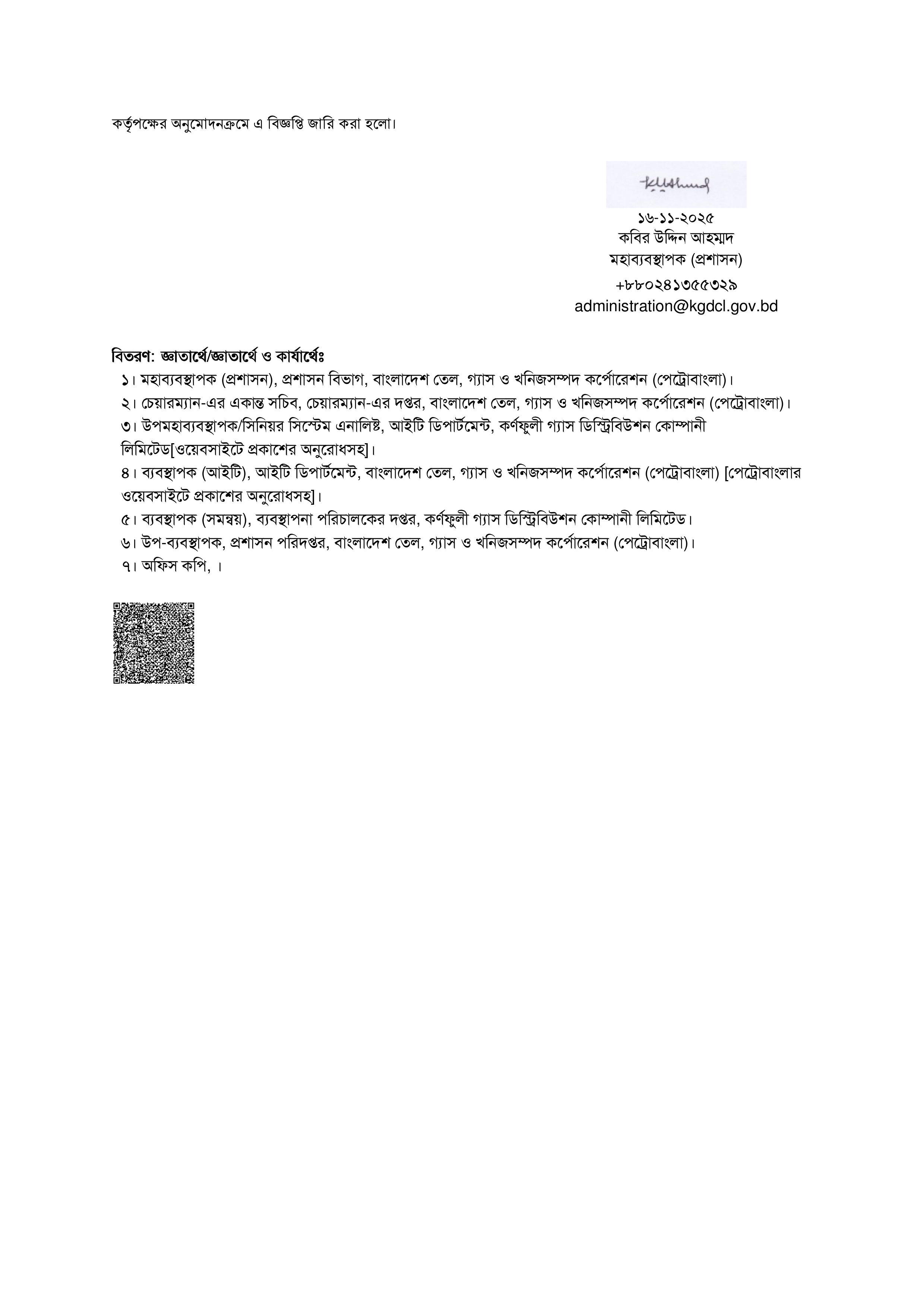 চূড়ান্তভাবে নির্বাচিত কোনো প্রার্থী নিজ ঠিকানায় তাঁর নিয়োগপত্র না পেলে, আগামী ২০.১১.২০২৫ তারিখ (বৃহস্পতিবার) বিকাল ৫.০০ ঘটিকার মধ্যে কেজিডিসিএল প্রধান কার্যালয়ের প্রশাসন ডিপার্টমেন্টে উপস্থিত হয়ে নিয়োগপত্র সংগ্রহ করতে পারবেন।