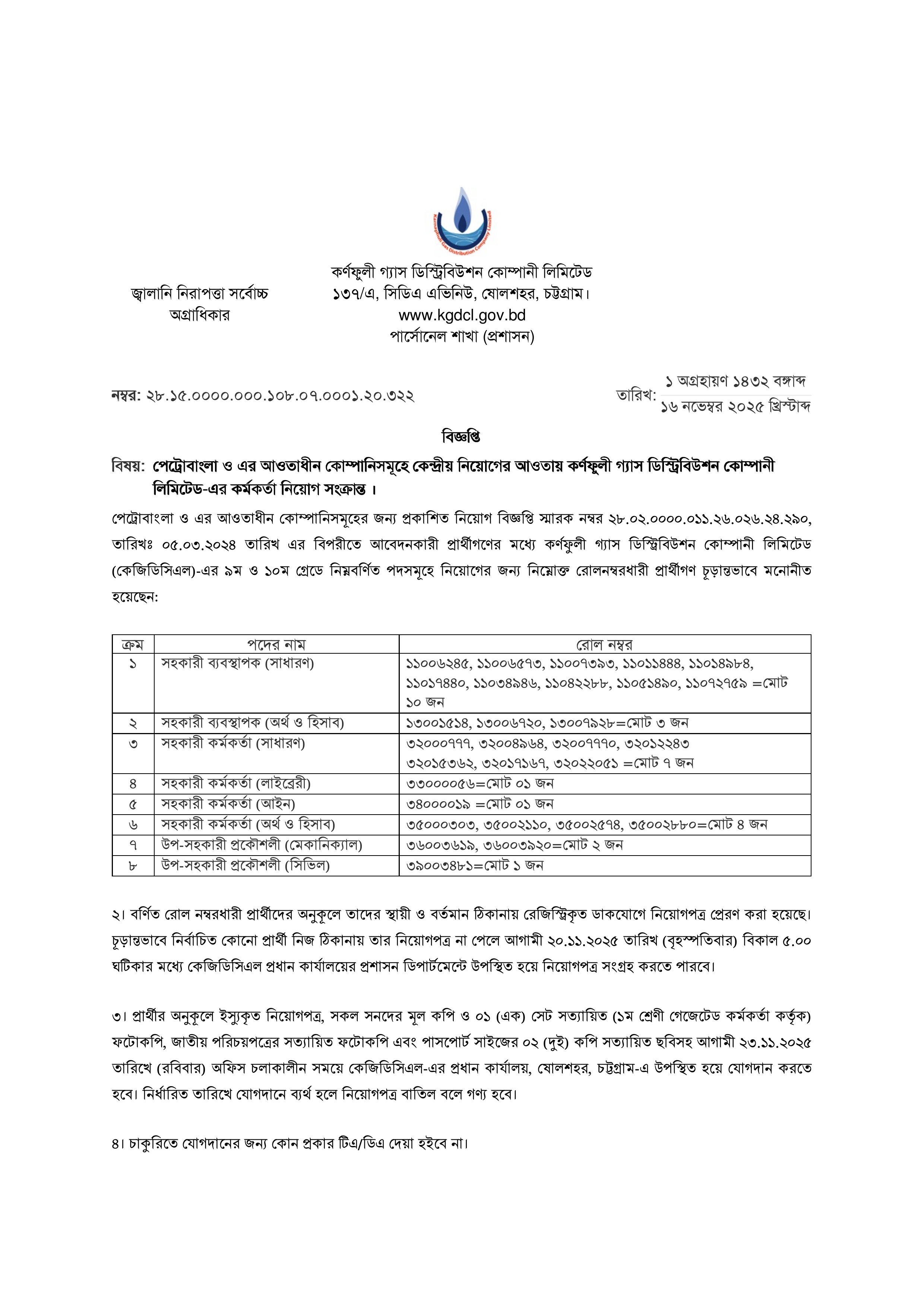 পেট্রোবাংলা ও এর আওতাধীন কোম্পানিসমূহের কেন্দ্রীয় নিয়োগের আওতায় কর্ণফুলী গ্যাস ডিস্ট্রিবিউশন কোম্পানী লিমিটেড (কেজিডিসিএল)-এর ৯ম ও ১০ম গ্রেডে বিভিন্ন পদে কর্মকর্তা নিয়োগের চূড়ান্ত ফলাফল প্রকাশিত হয়েছে। সর্বমোট ২৯ জন প্রার্থীকে চূড়ান্তভাবে মনোনীত করা হয়েছে।