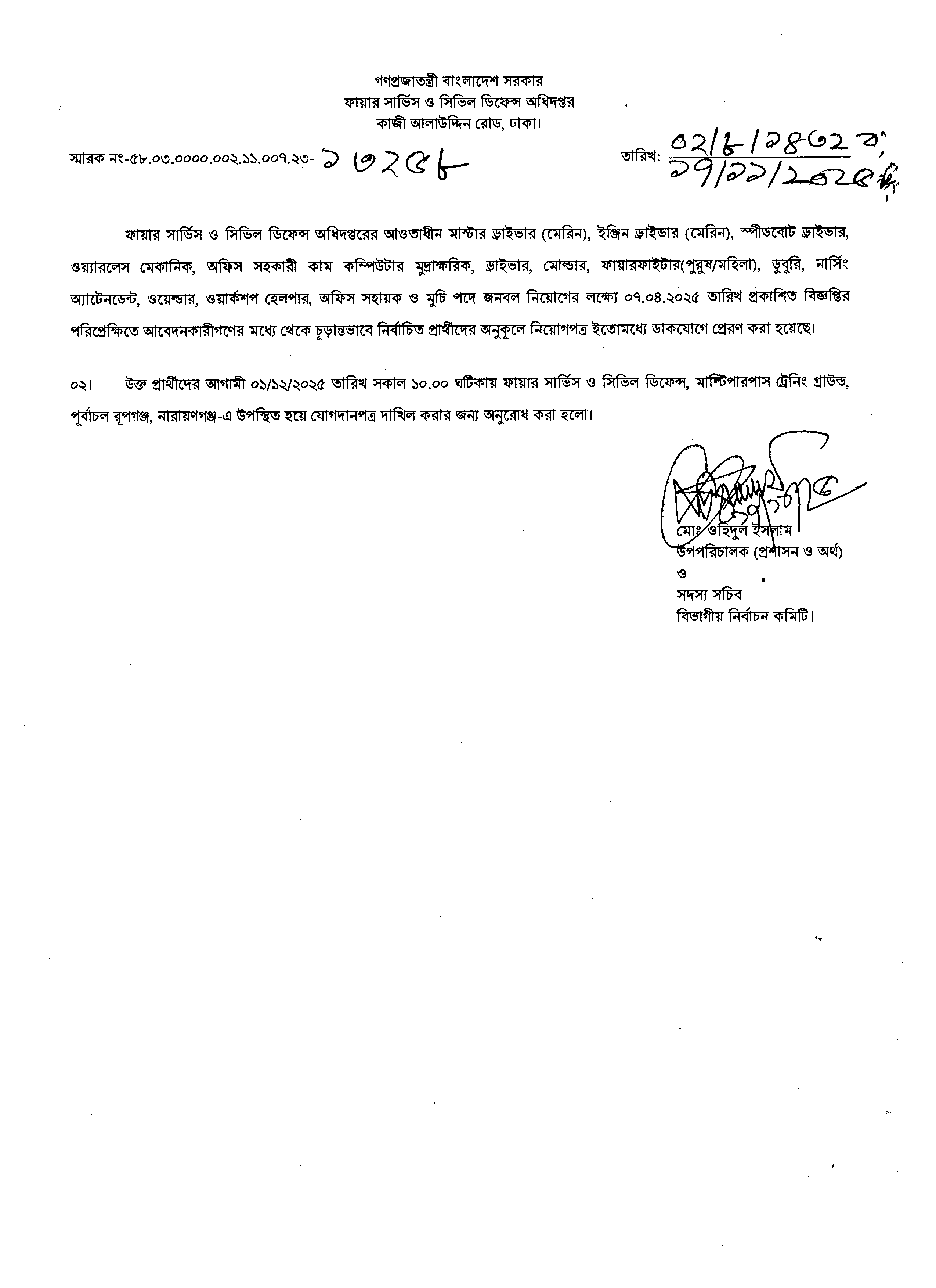 উক্ত প্রার্থীদের আগামী ০১/১২/২০২৫ তারিখ সকাল ১০.০০ ঘটিকায় ফায়ার সার্ভিস ও সিভিল ডিফেন্স, মাল্টিপারপাস ট্রেনিং গ্রাউন্ড, পূর্বাচল রূপগঞ্জ, নারায়ণগঞ্জ-এ উপস্থিত হয়ে যোগদানপত্র দাখিল করার জন্য অনুরোধ করা হয়েছে।