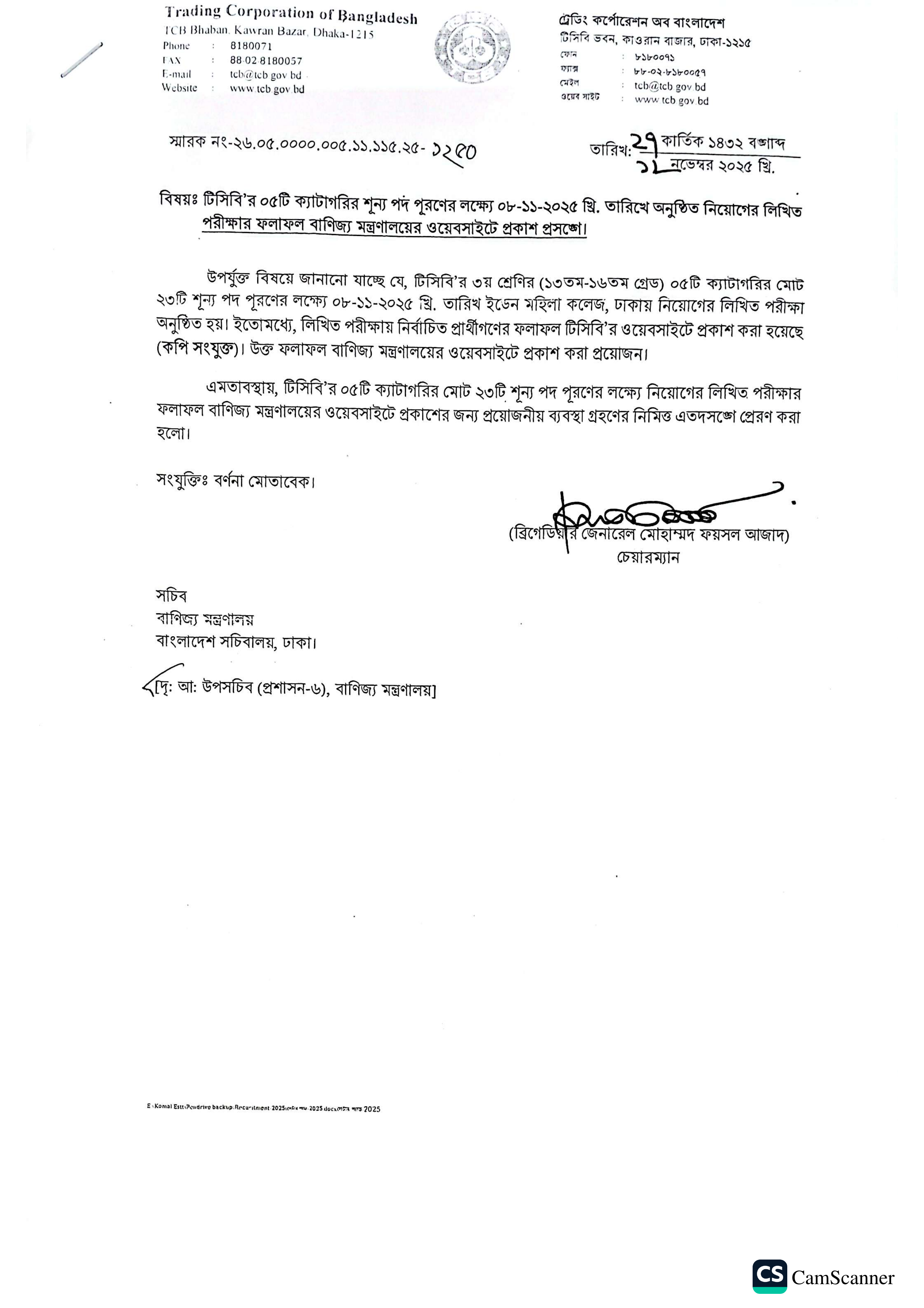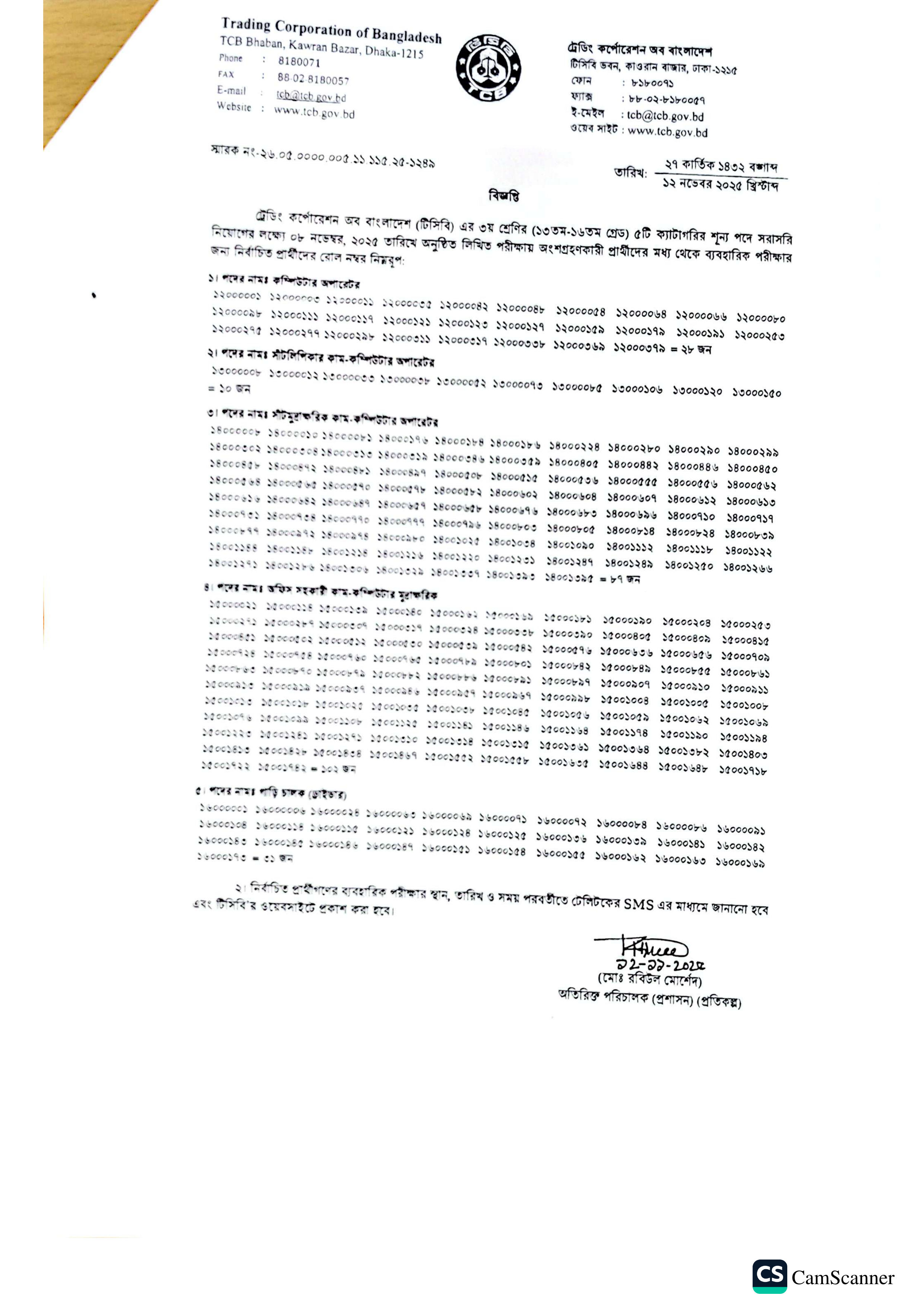ট্রেডিং কর্পোরেশন অব বাংলাদেশ (টিসিবি)-এর ৩য় শ্রেণির (১৩তম-১৬তম গ্রেড) ৫টি ক্যাটাগরির শূন্য পদে সরাসরি নিয়োগের লক্ষ্যে ০৮ নভেম্বর, ২০২৫ খ্রি. তারিখে অনুষ্ঠিত লিখিত পরীক্ষার ফলাফল প্রকাশিত হয়েছে। লিখিত পরীক্ষায় উত্তীর্ণ প্রার্থীদের মধ্য থেকে ব্যবহারিক পরীক্ষার জন্য নিম্নলিখিত পদের বিপরীতে নির্বাচিত প্রার্থীদের তালিকা প্রকাশ করা হয়েছে:
