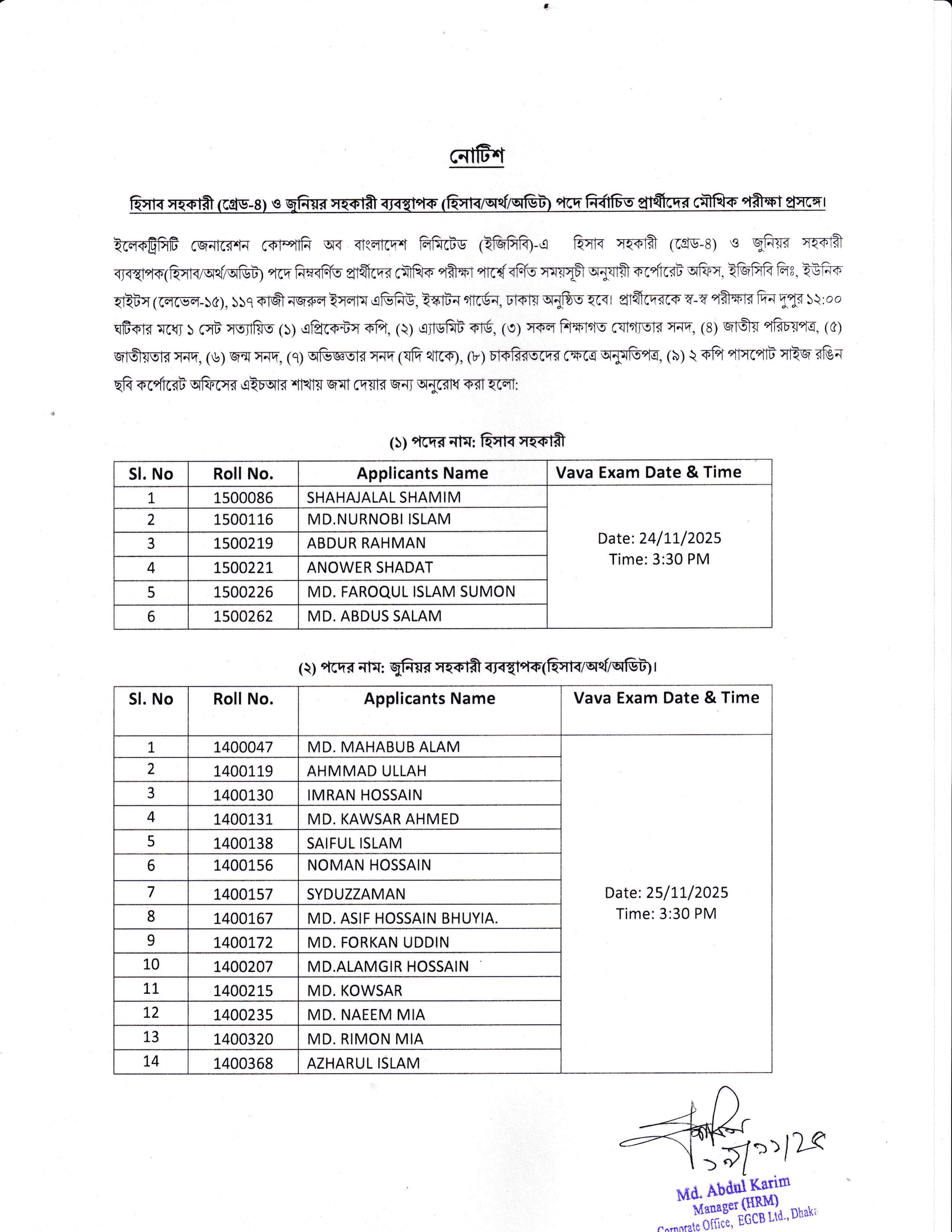 ইলেকট্রসিট জেনারেশন কোম্পানি অব বাংলাদেশ লিমিটেড (ইজিসিবি)-এর হিসাব সহকারী (গ্রেড-৪) এবং জুনিয়র সহকারী ব্যবস্থাপক (হিসাব/অর্থ/অডিট) পদে নির্বাচিত প্রার্থীদের মৌখিক পরীক্ষার সময়সূচী প্রকাশিত হয়েছে।