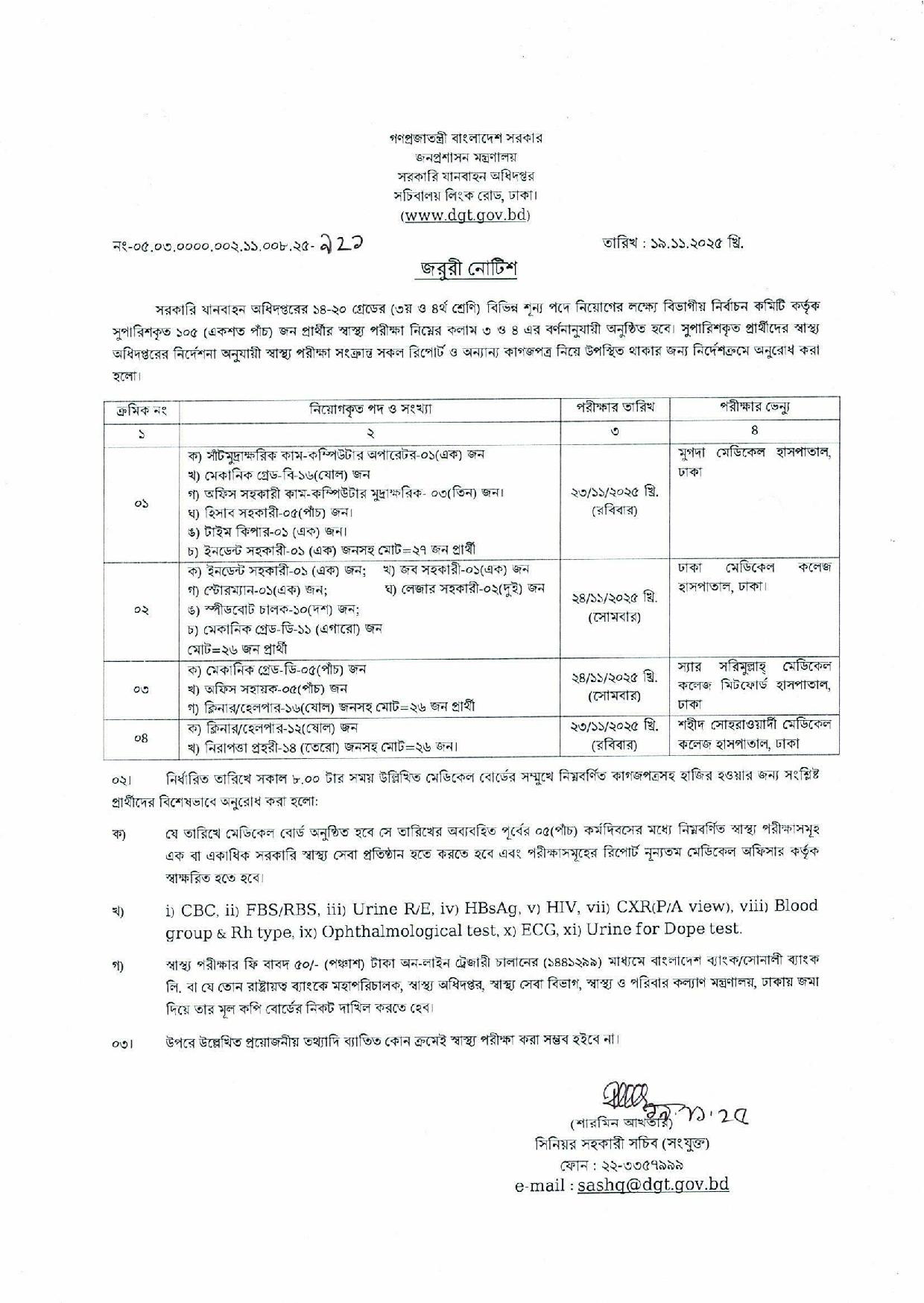 সরকারি যানবাহন অধিদপ্তরের চাকরির স্বাস্থ্য পরীক্ষা সময়সূচি প্রকাশ