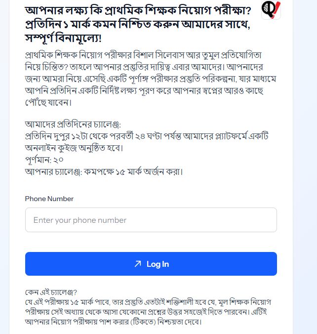 সম্পূর্ণ ফ্রি—শুধুমাত্র নাম ও মোবাইল নম্বর দিয়ে কুইজে অংশগ্রহণ করতে পারবেন। পরীক্ষামূলকভাবে আজ থেকে কুইজ চ্যালেঞ্জটি শুরু হয়েছে। খুব দ্রুতই এটি বিস্তার লাভ করবে এবং পুরস্কারের ব্যবস্থা করা হবে।