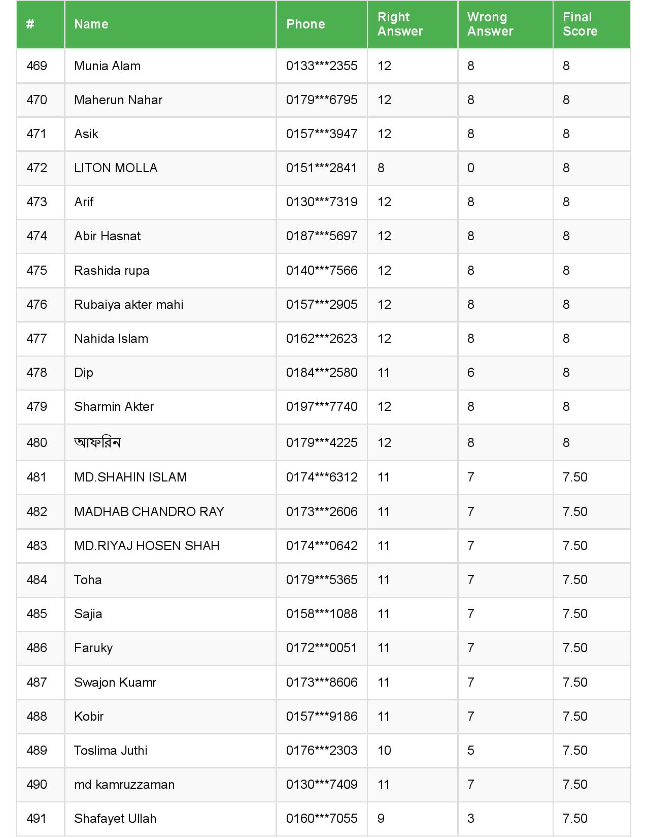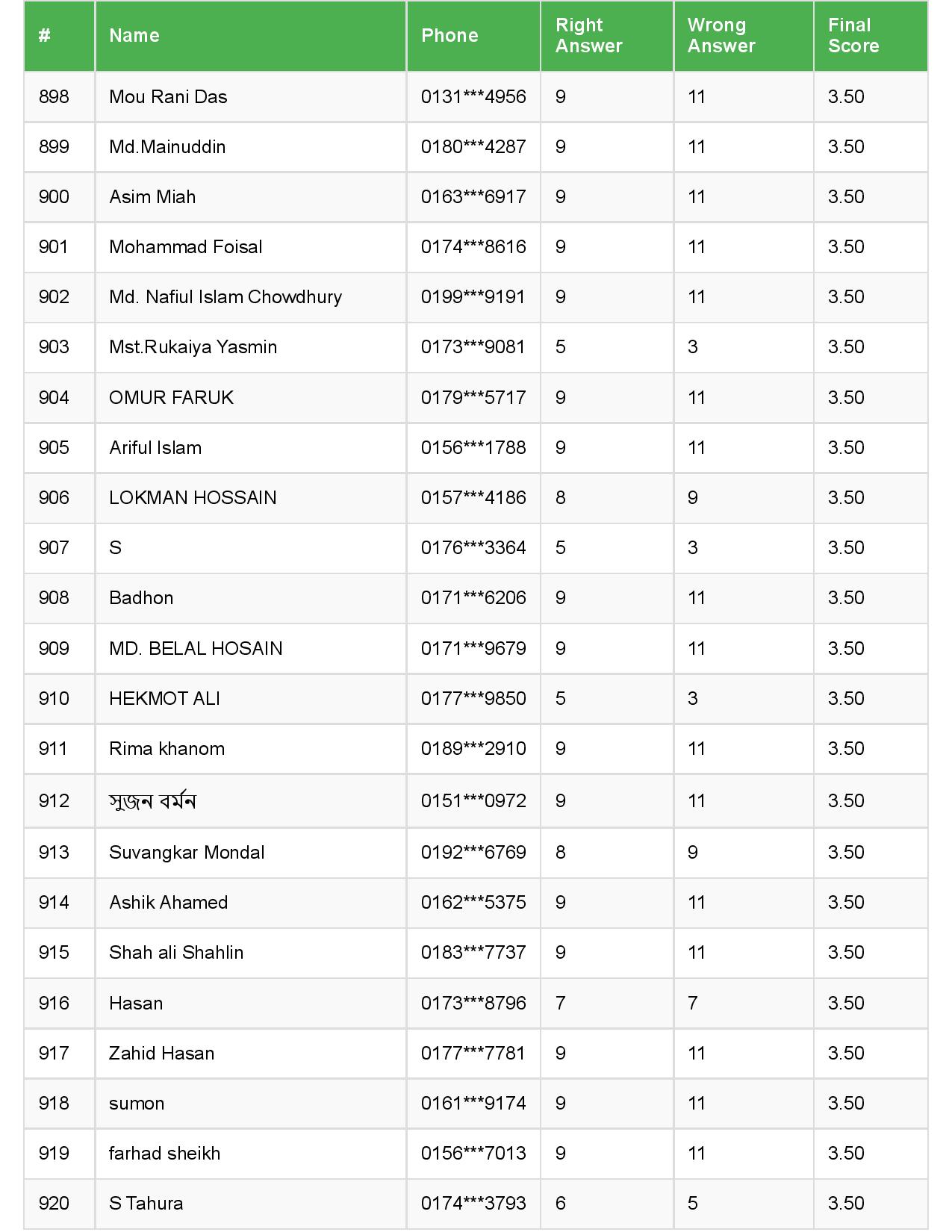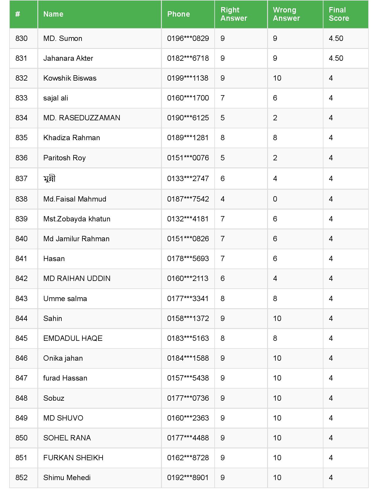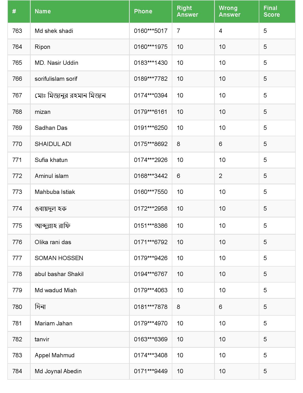 | 10 | Md.Asadullah | 0130***4331 | 18 | 2 | 17 |