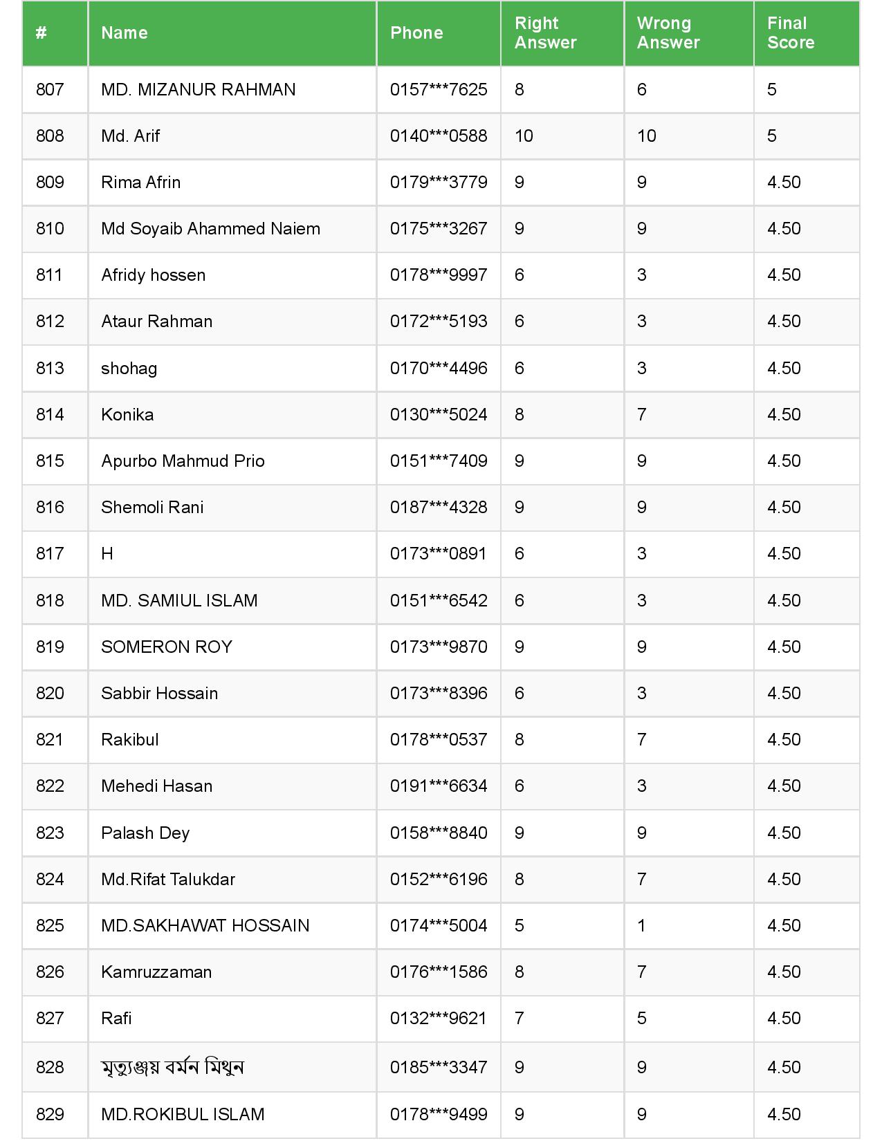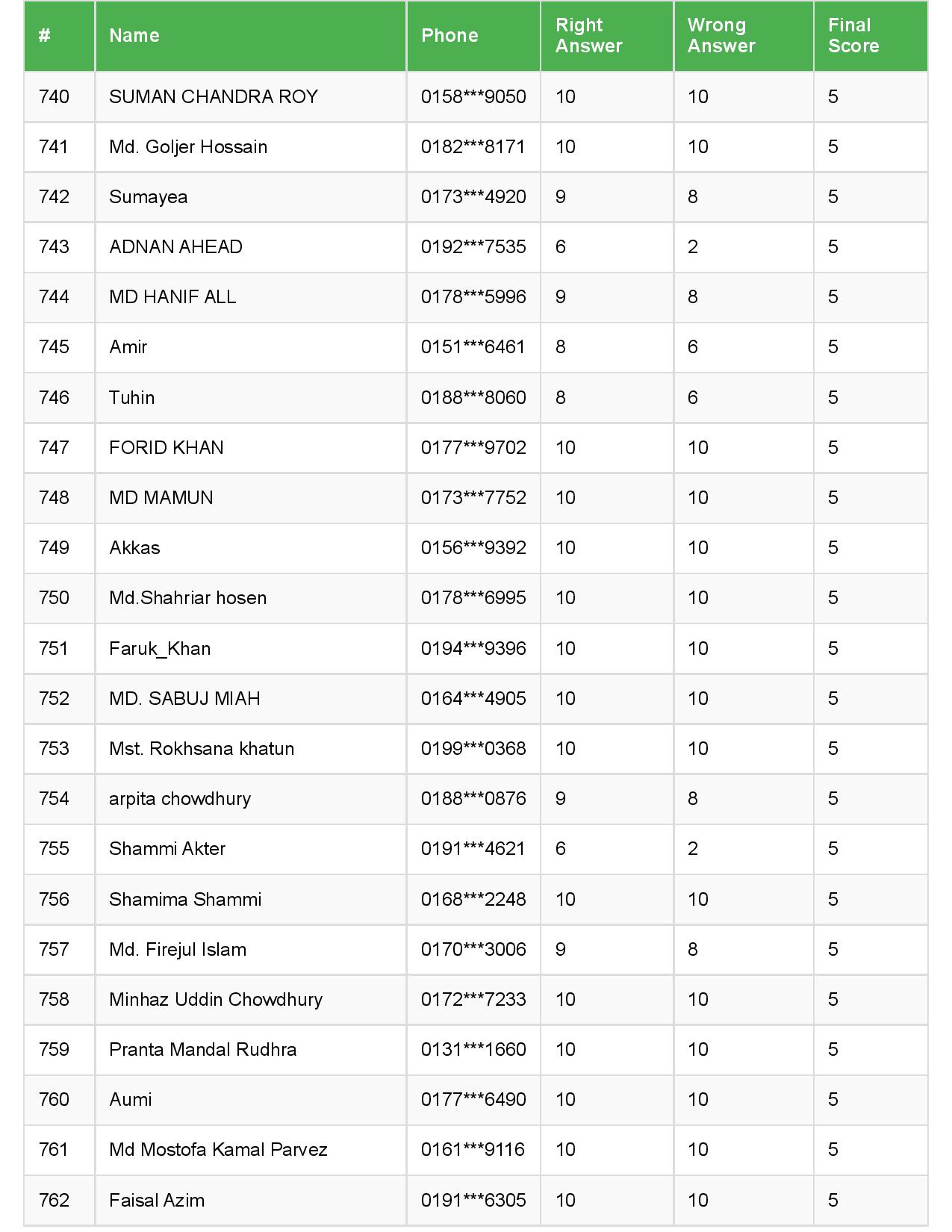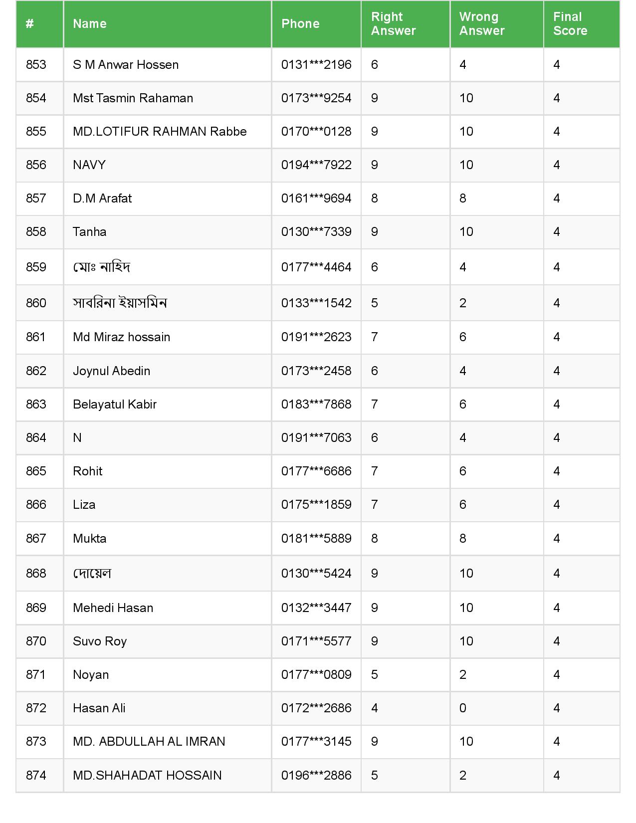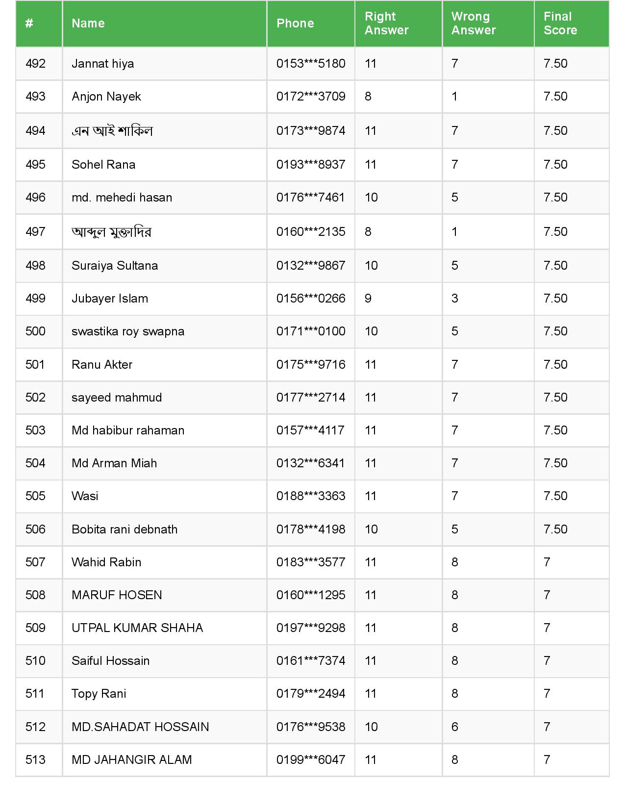 | 10 | Md.Asadullah | 0130***4331 | 18 | 2 | 17 |