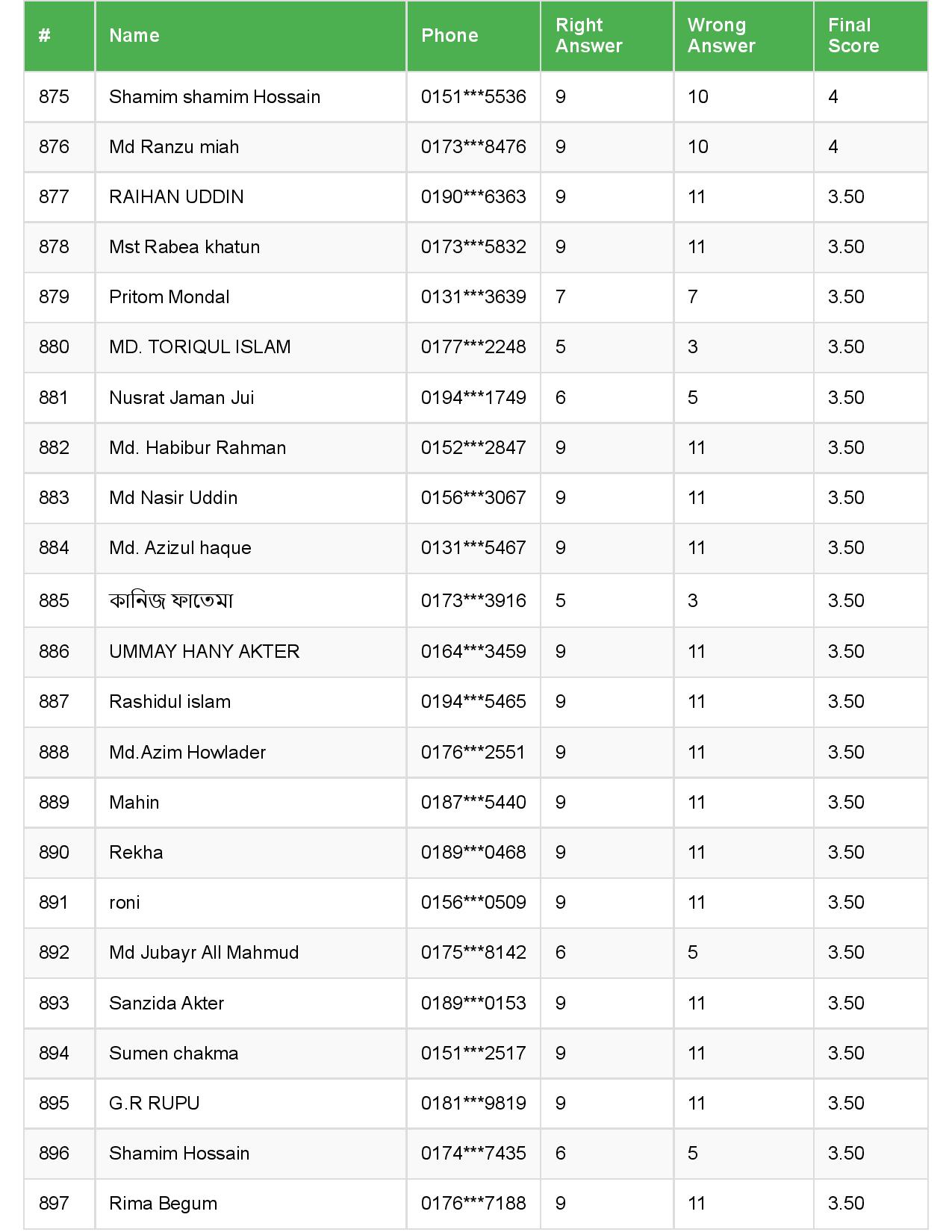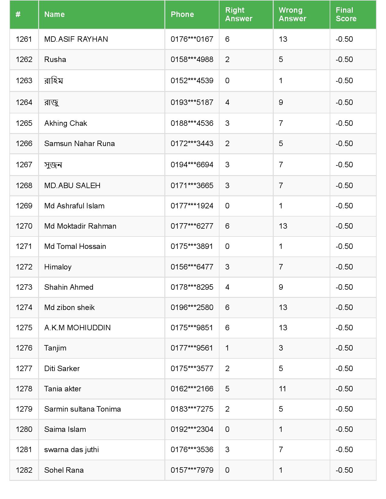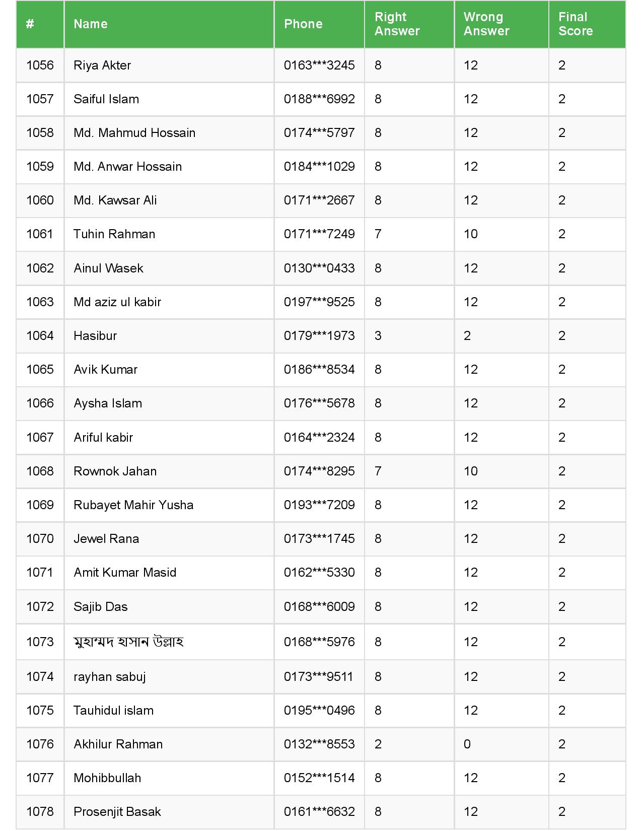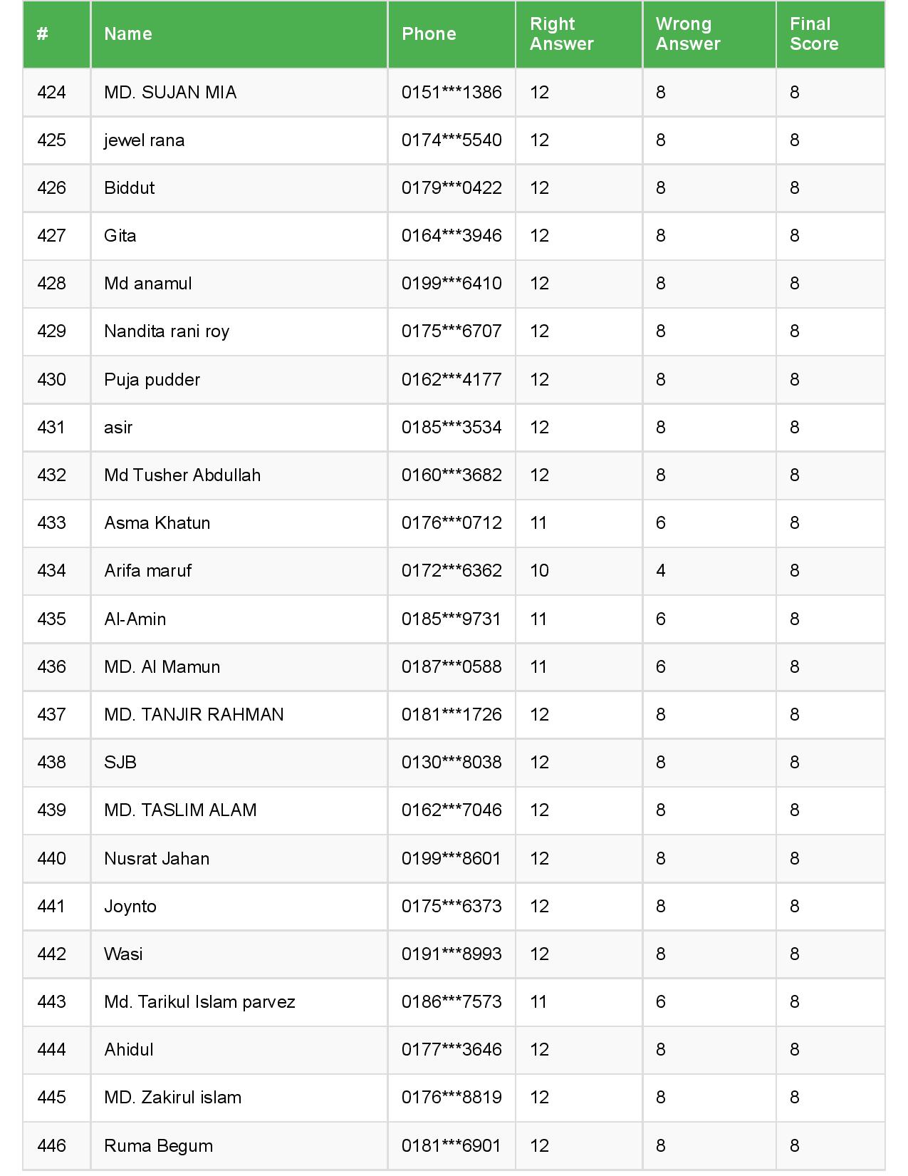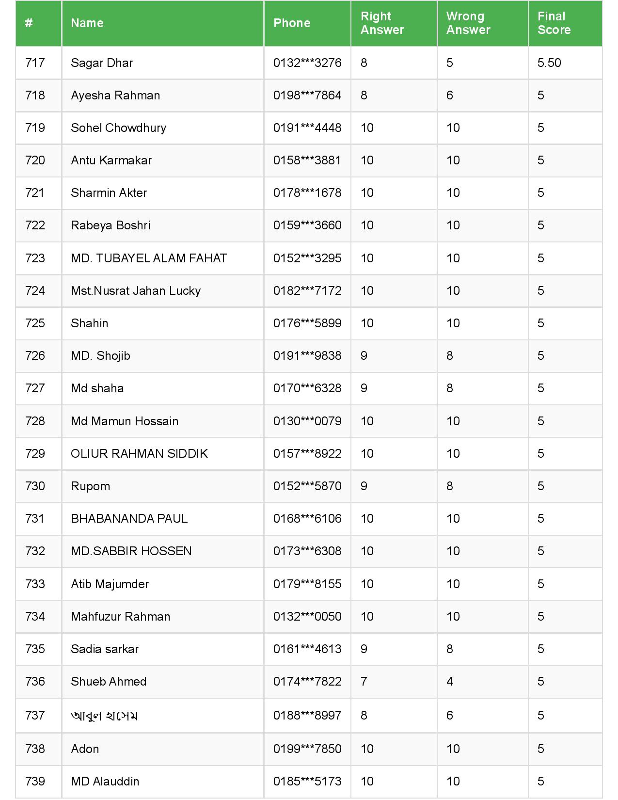 | 10 | Md.Asadullah | 0130***4331 | 18 | 2 | 17 |