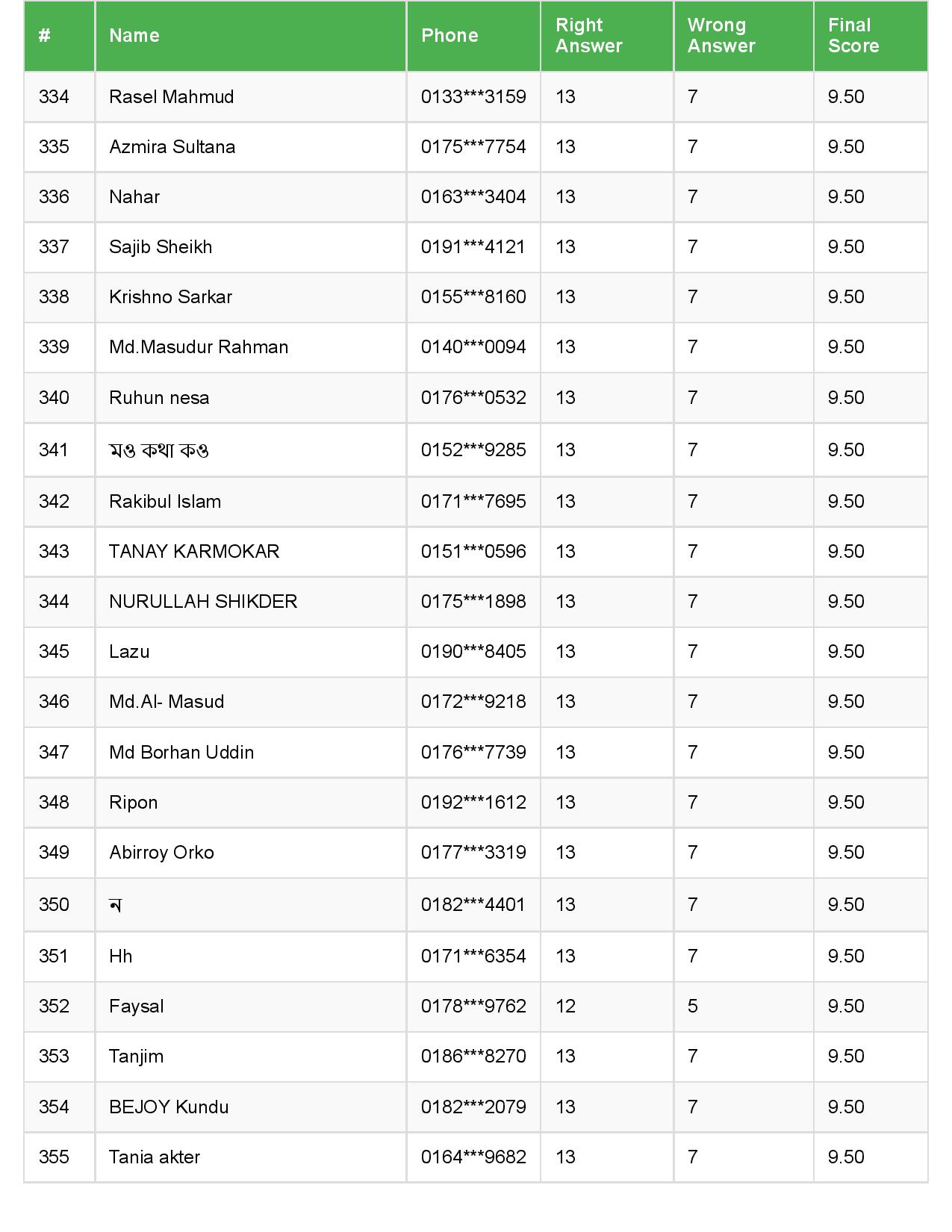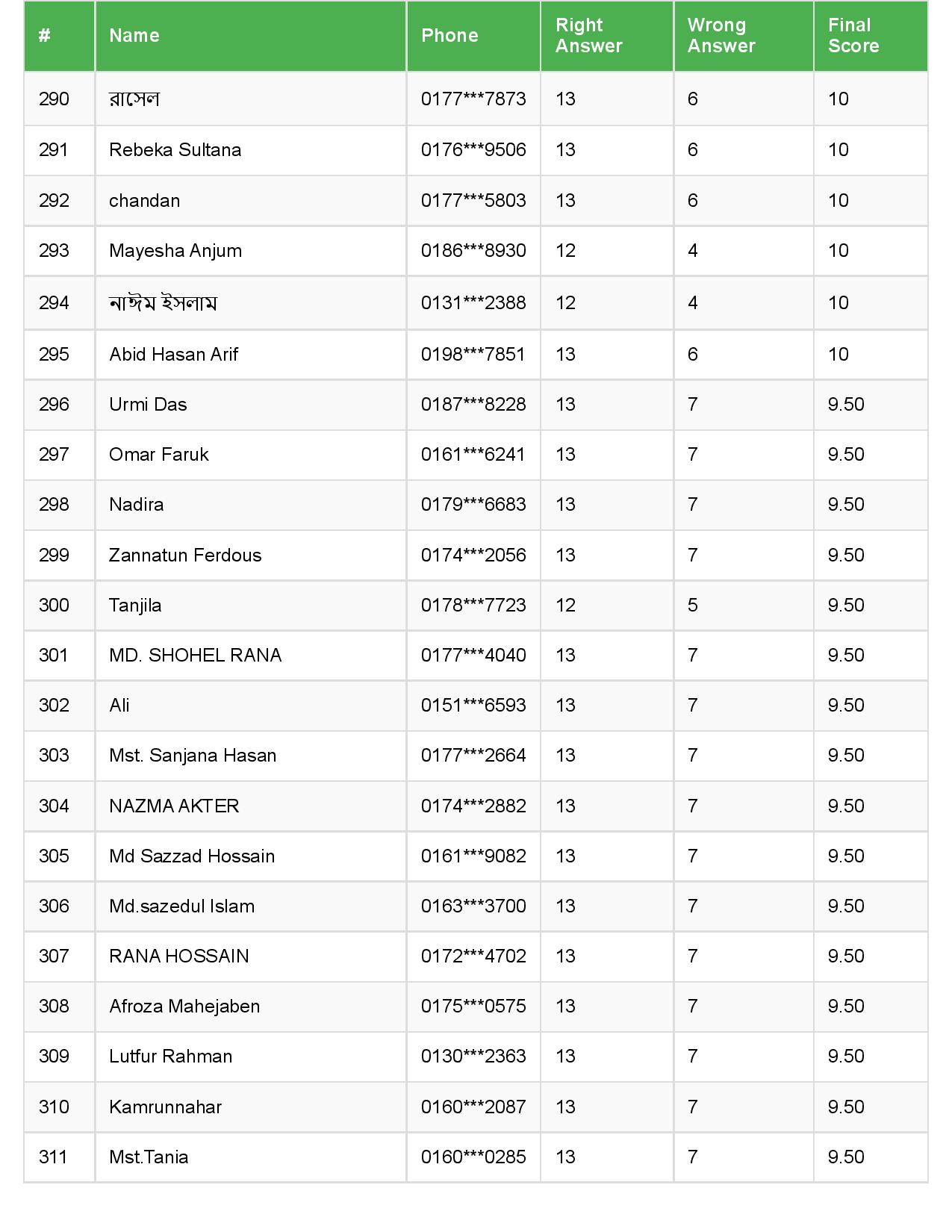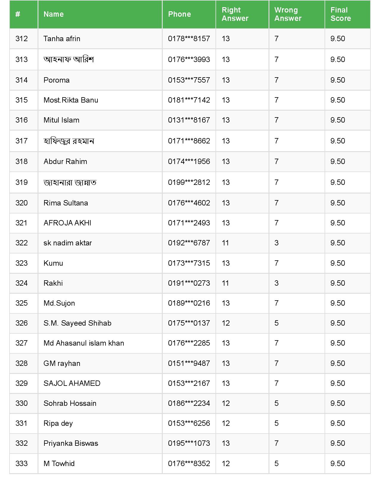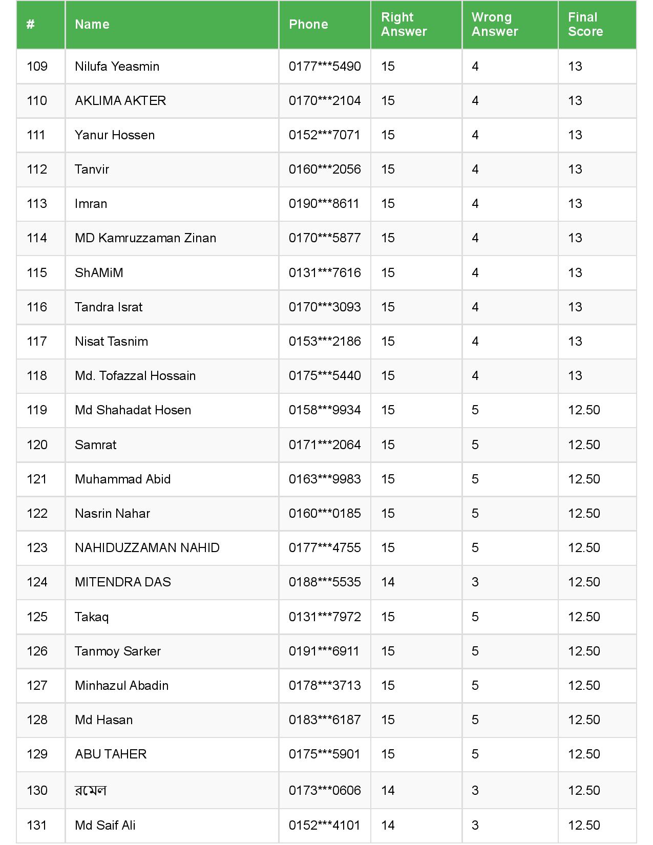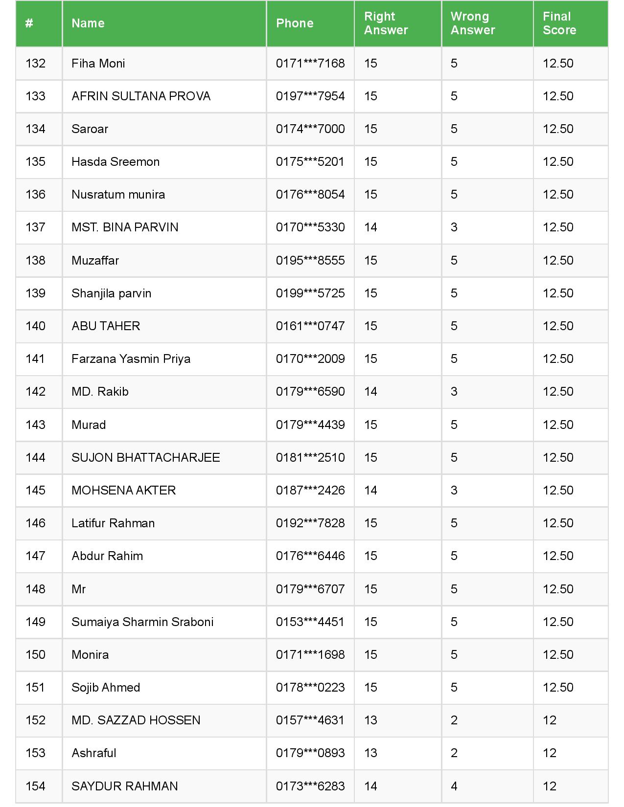 | 25 | Rabeya | 0130***3413 | 17 | 3 | 15.50 |