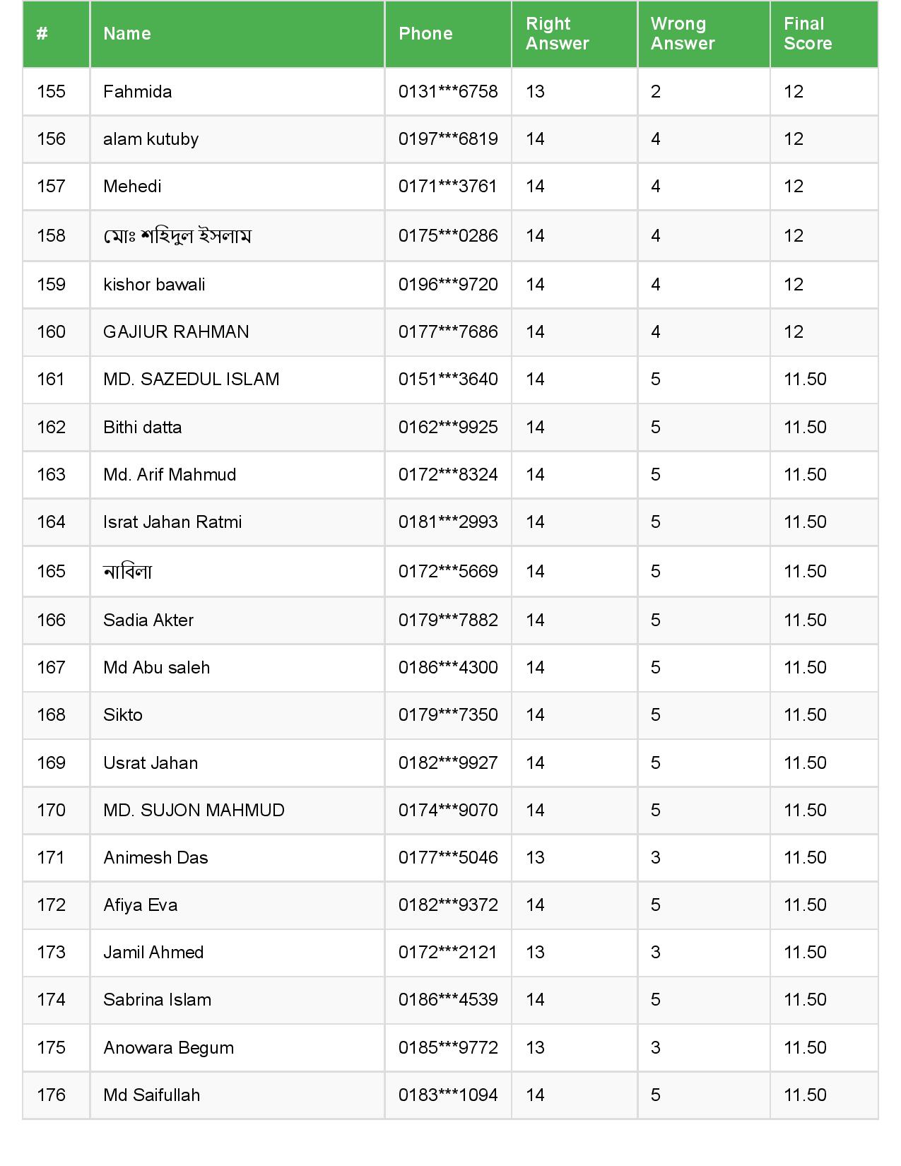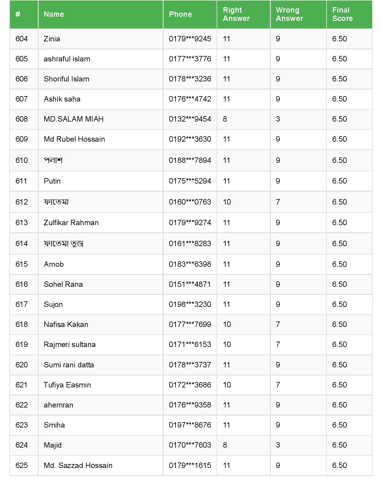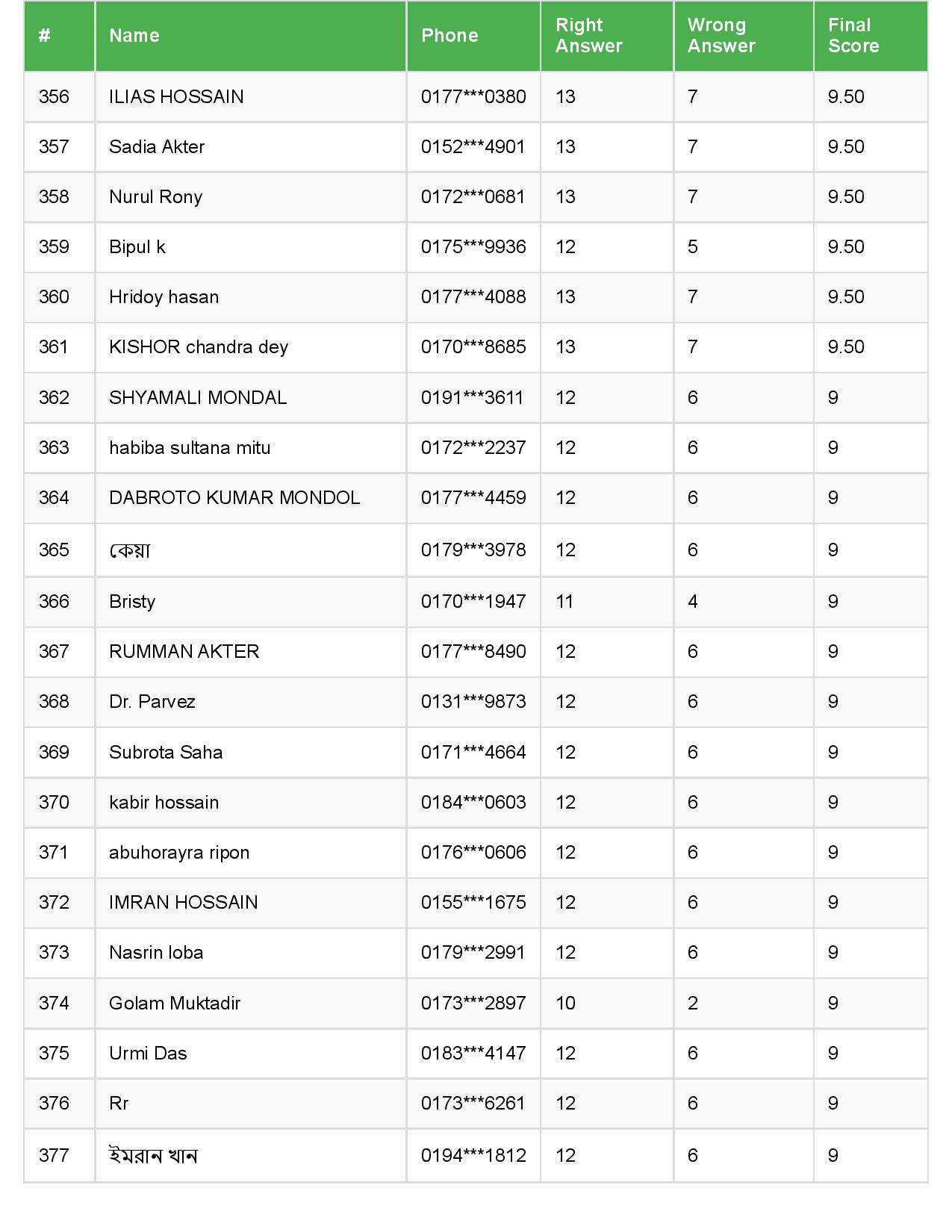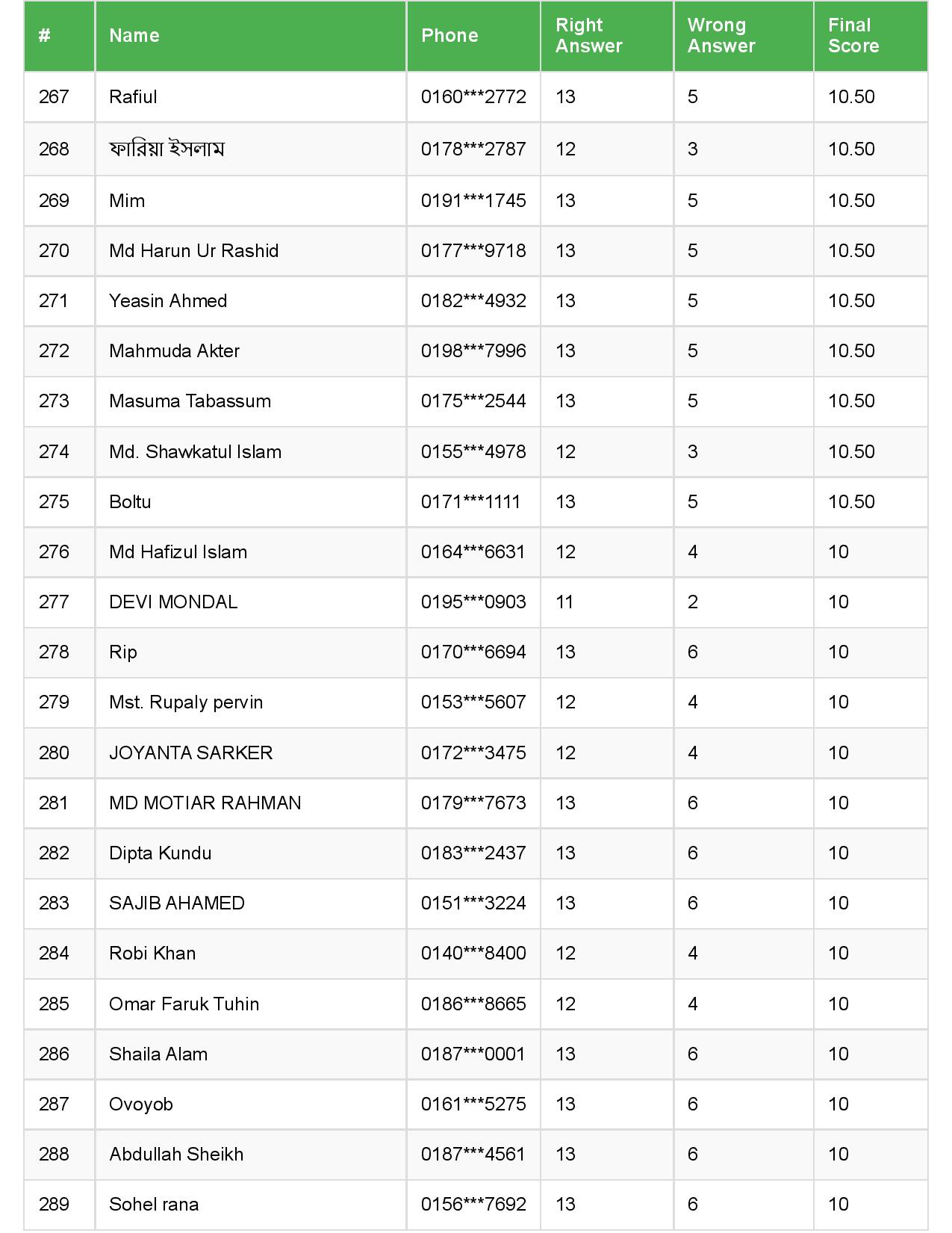 | 25 | Rabeya | 0130***3413 | 17 | 3 | 15.50 |