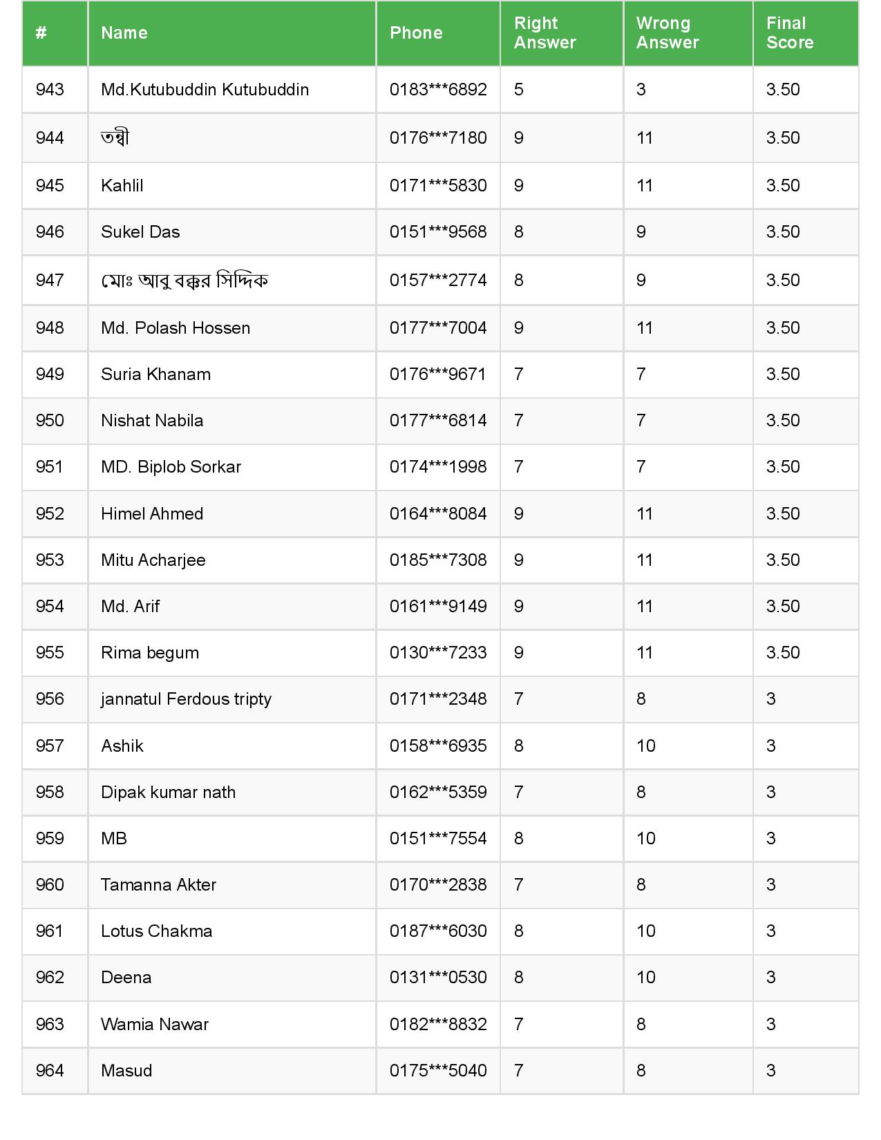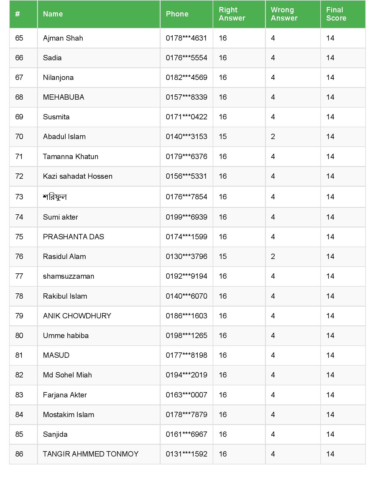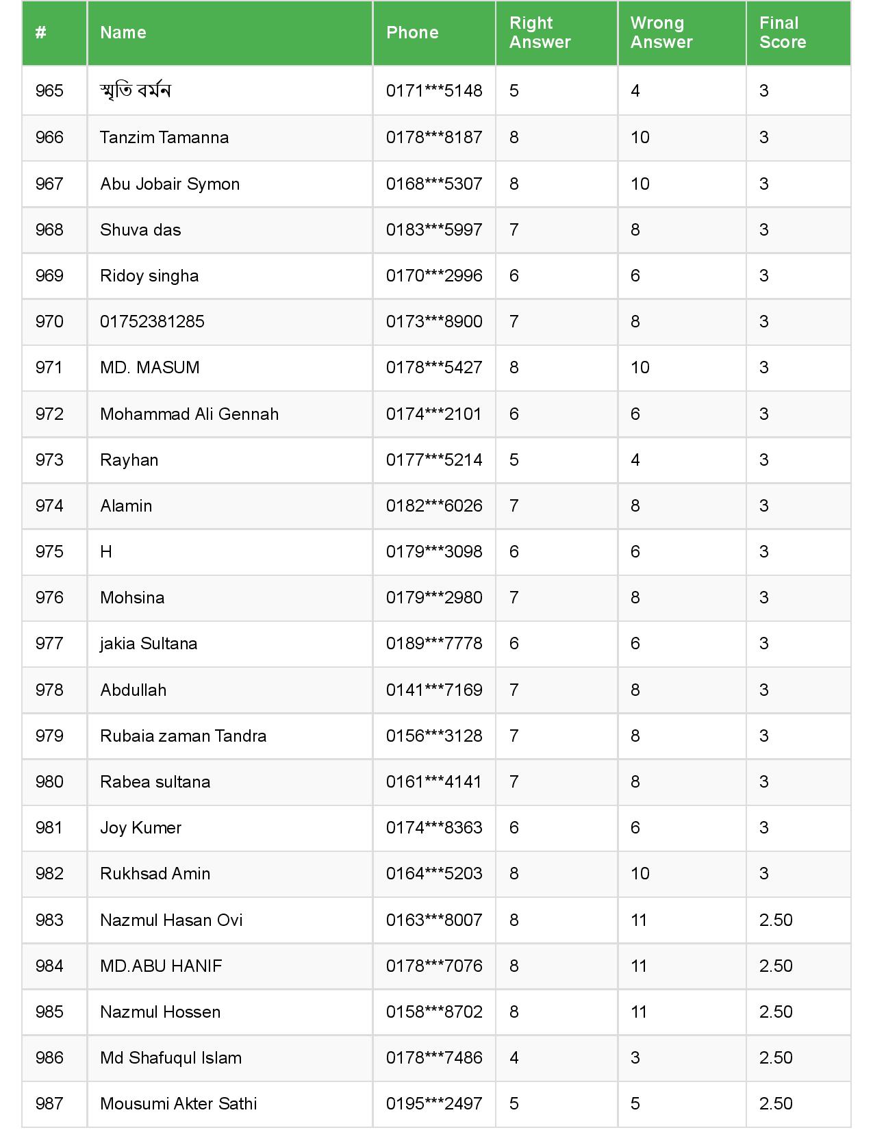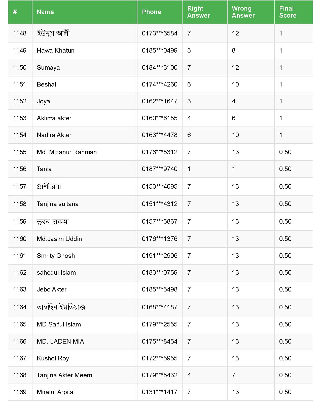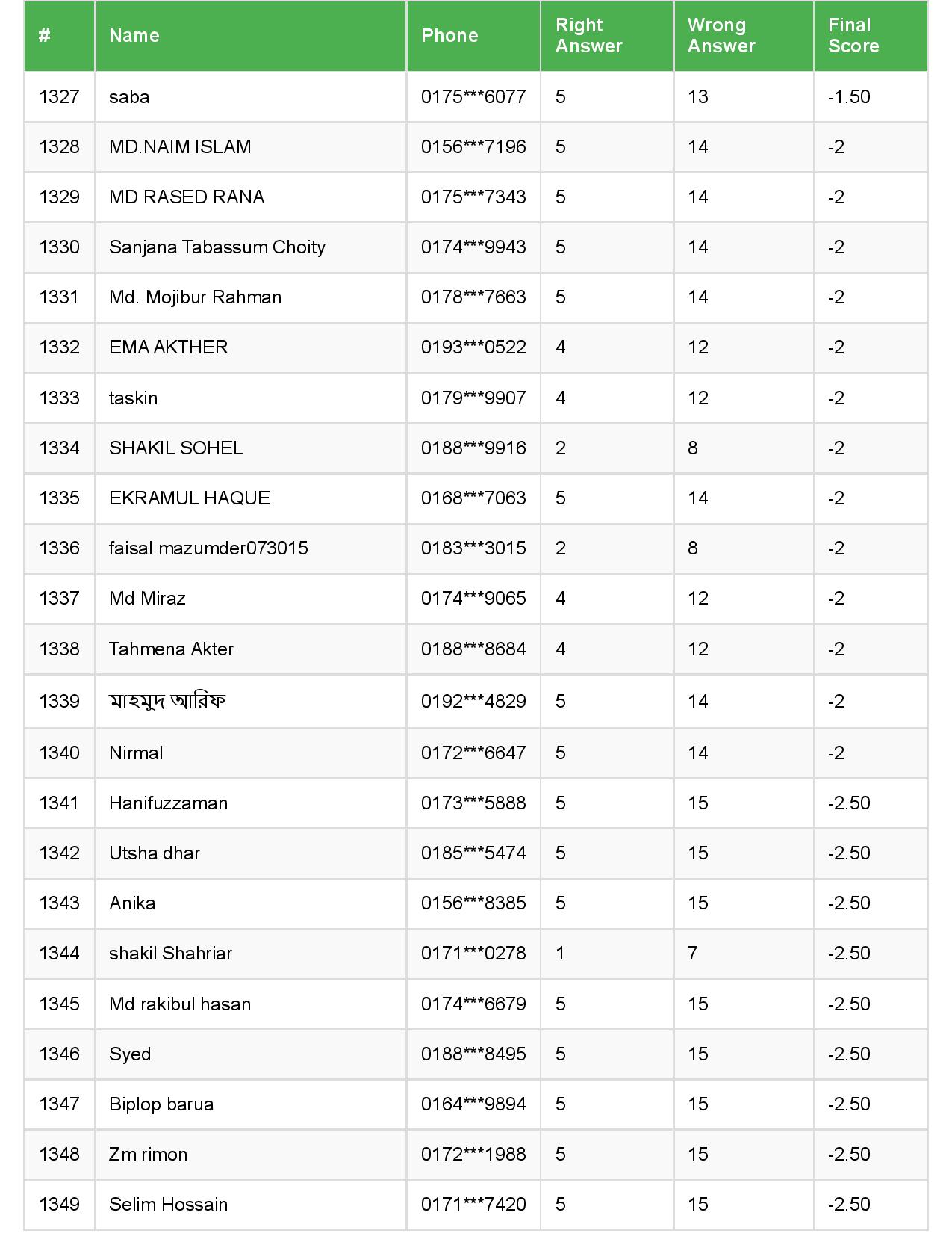 | 25 | Rabeya | 0130***3413 | 17 | 3 | 15.50 |