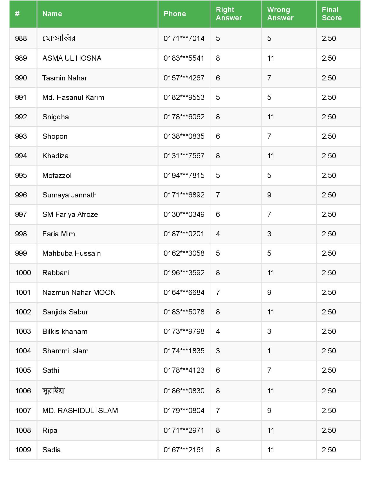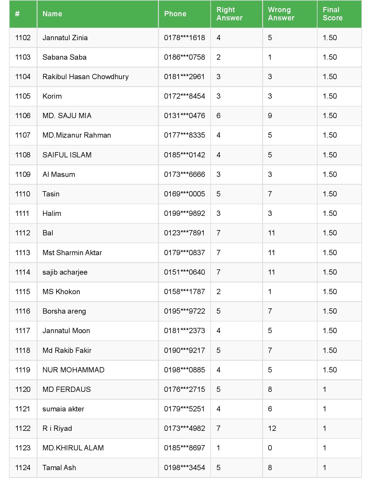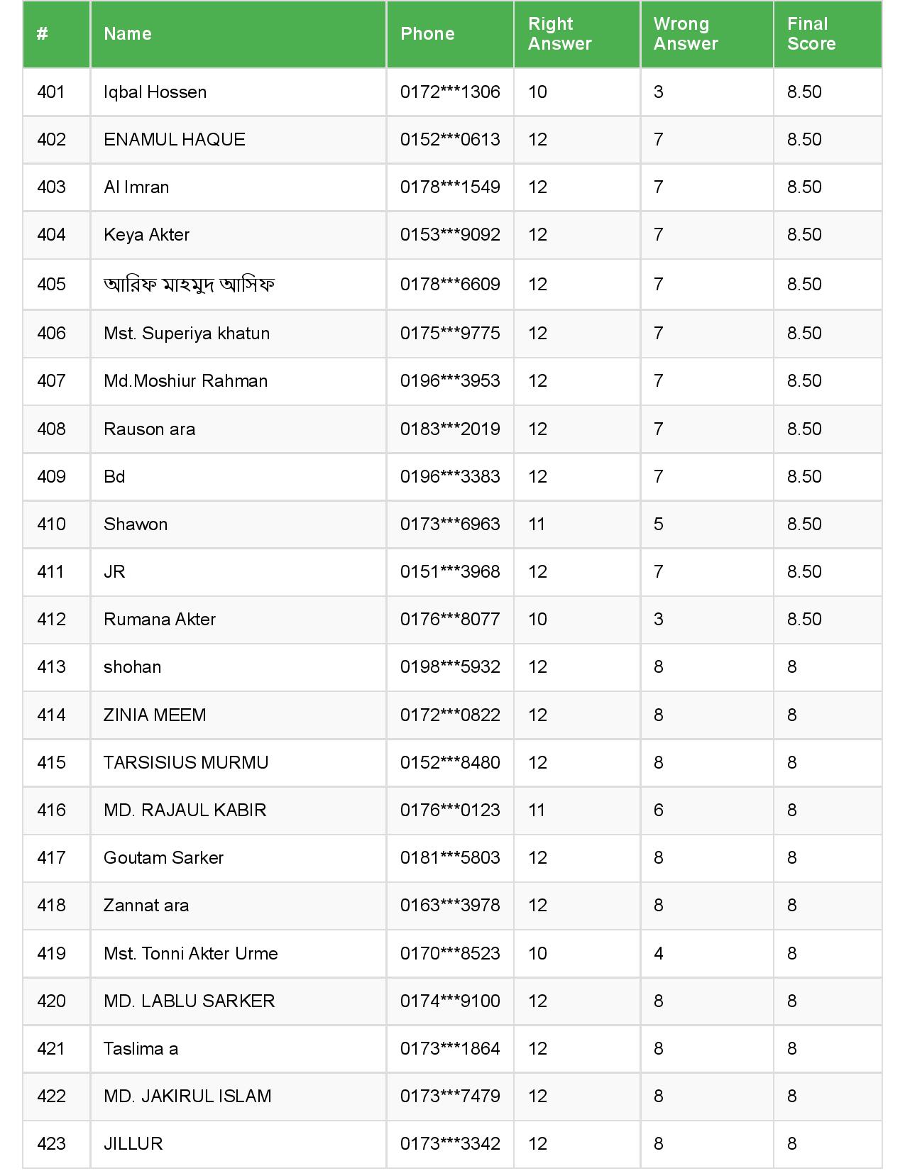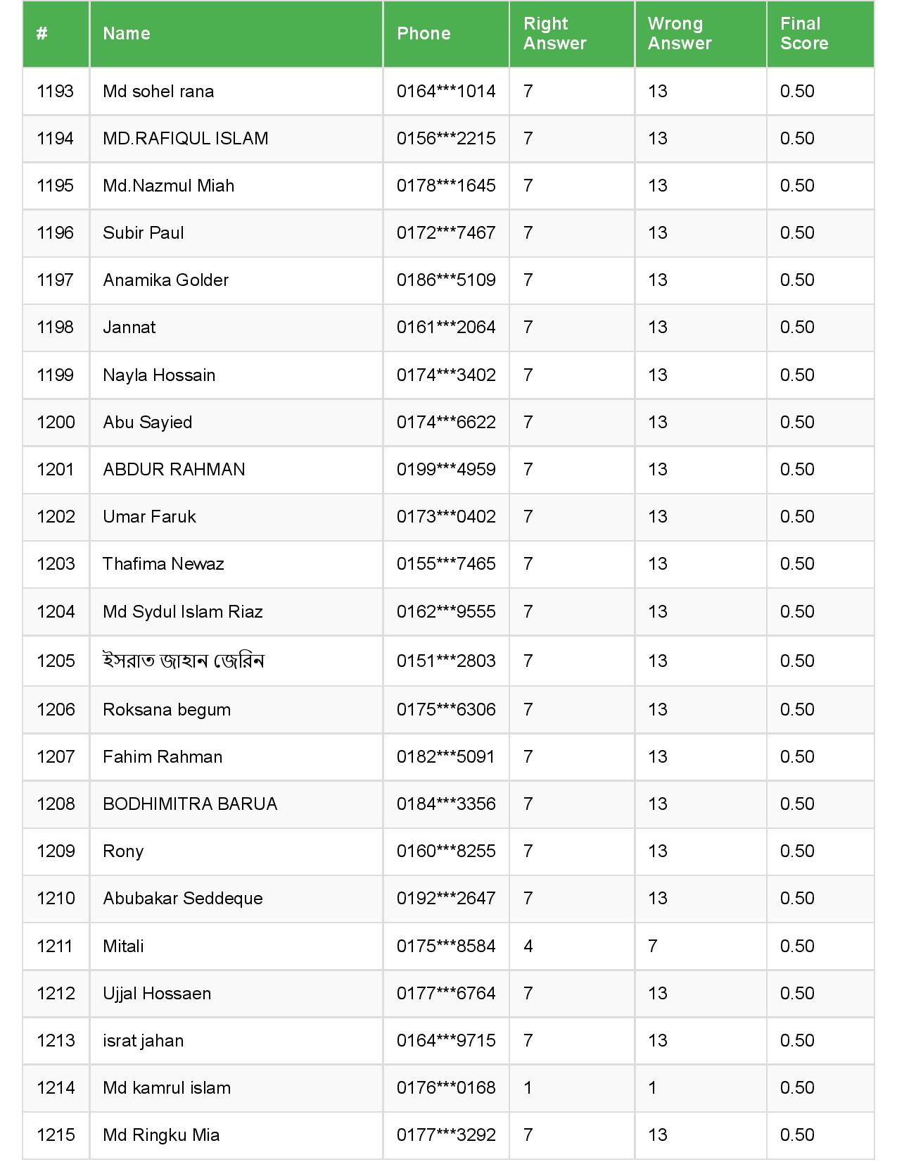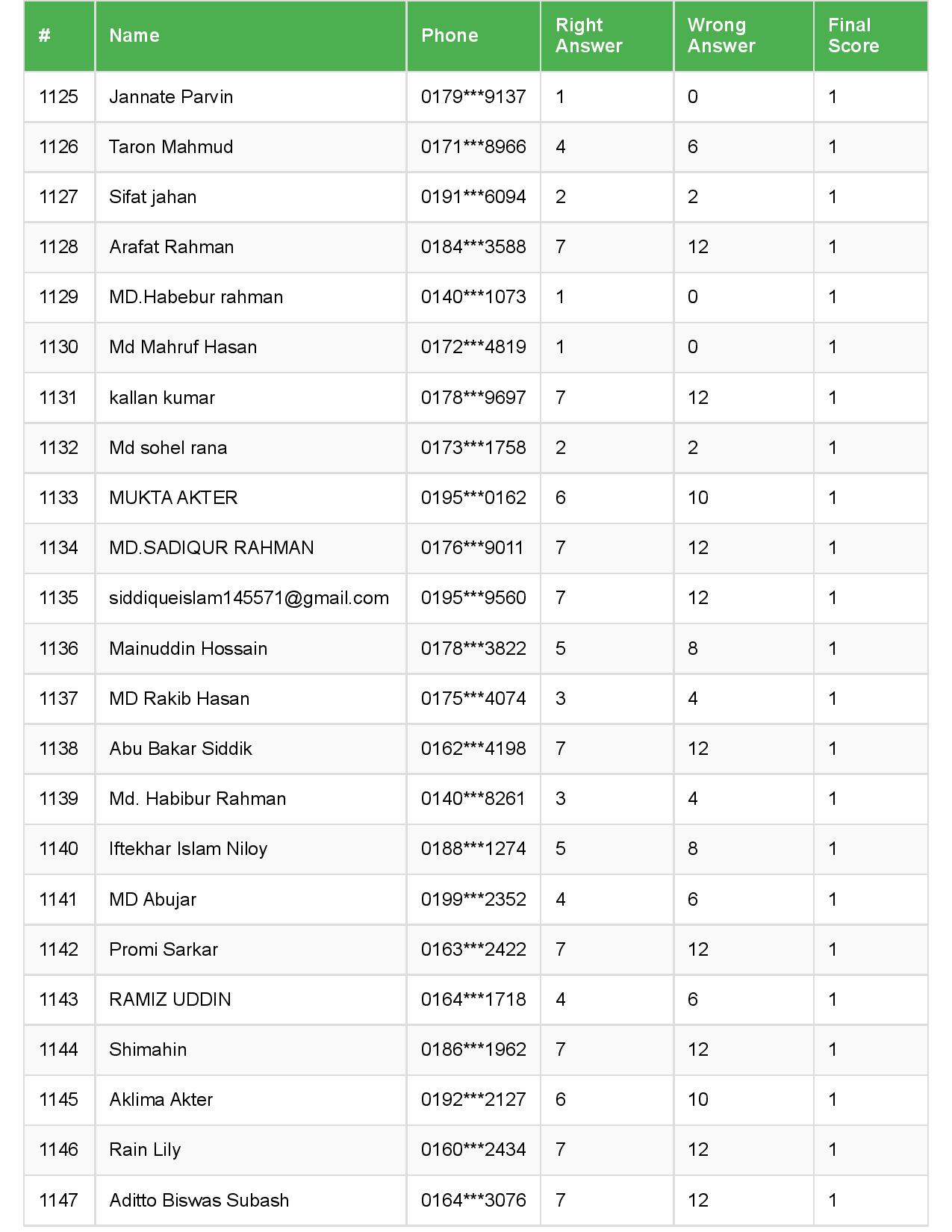 | 25 | Rabeya | 0130***3413 | 17 | 3 | 15.50 |