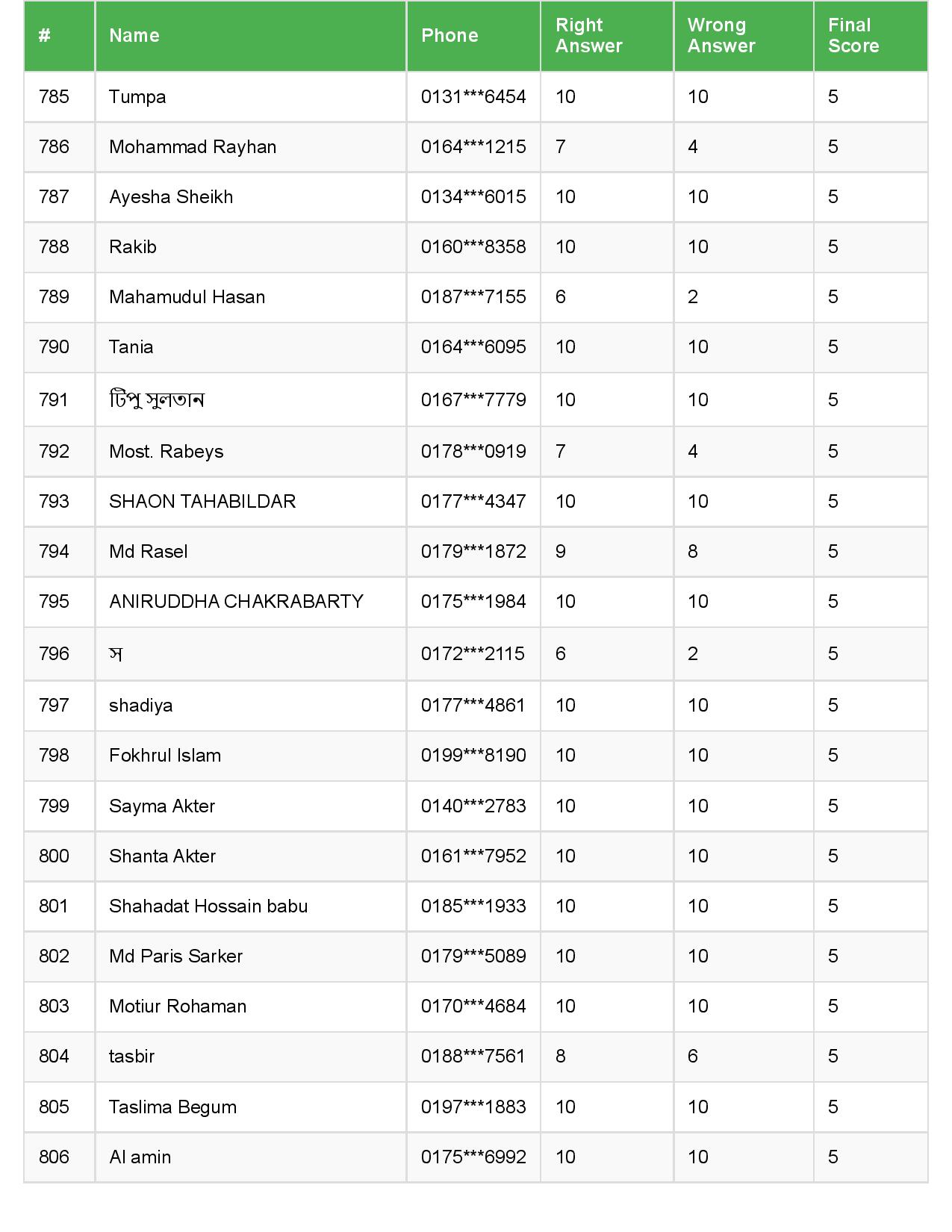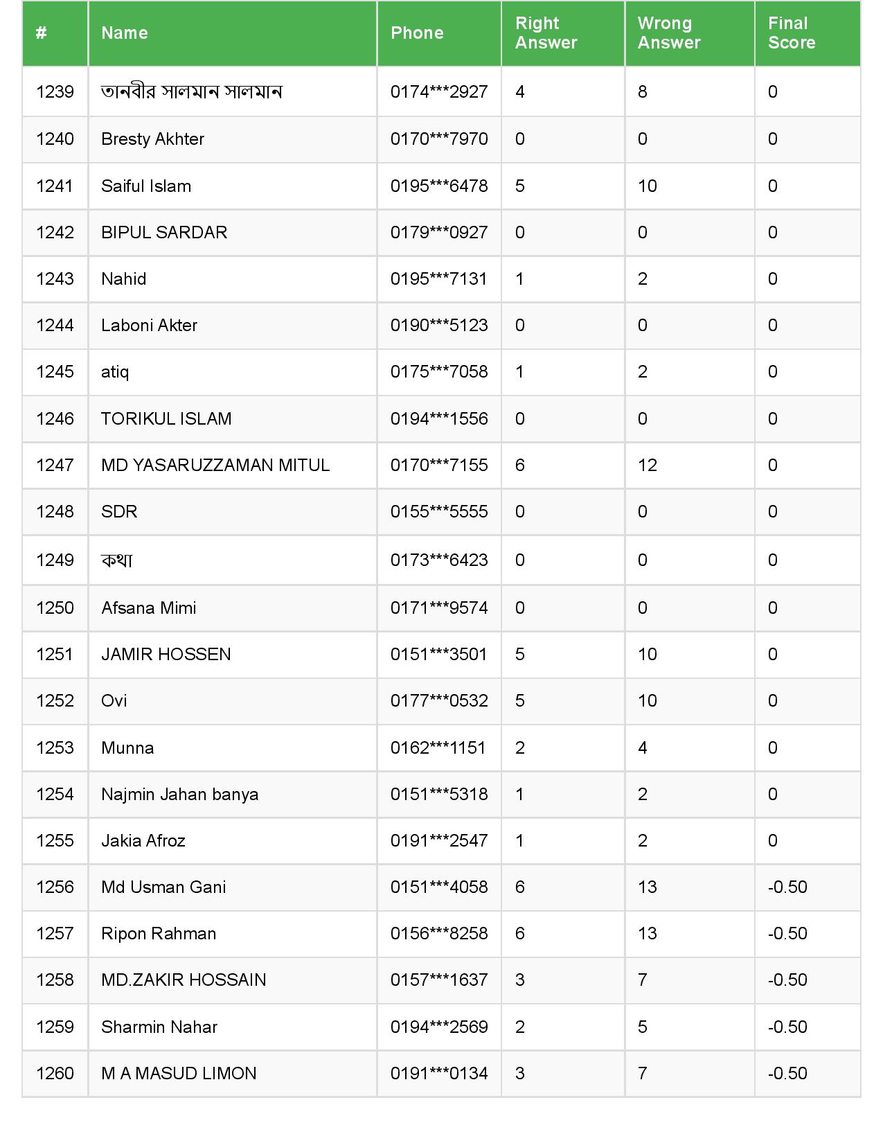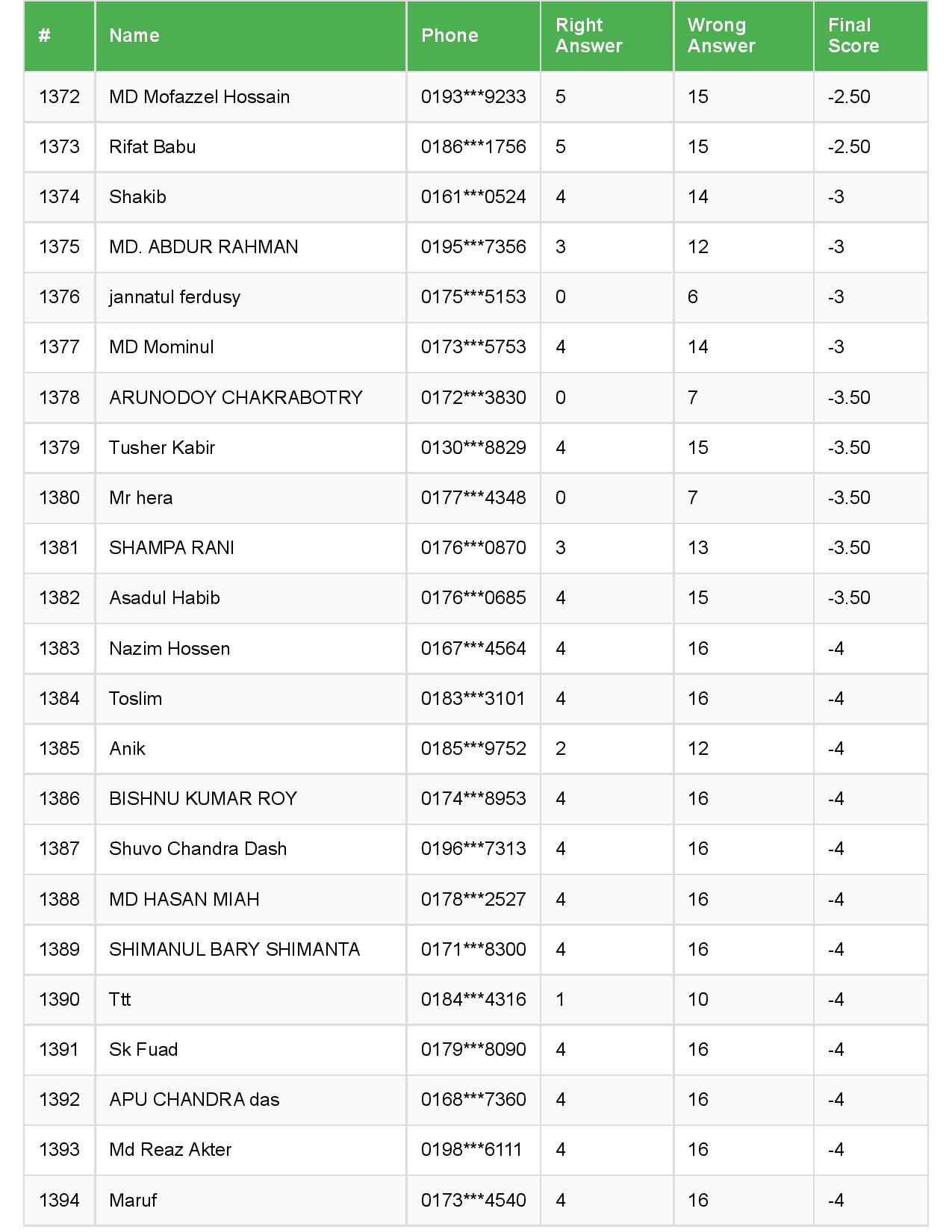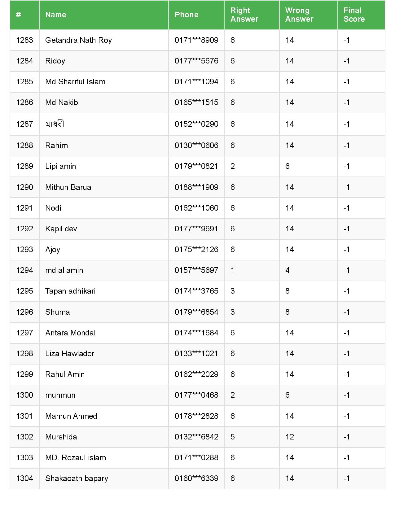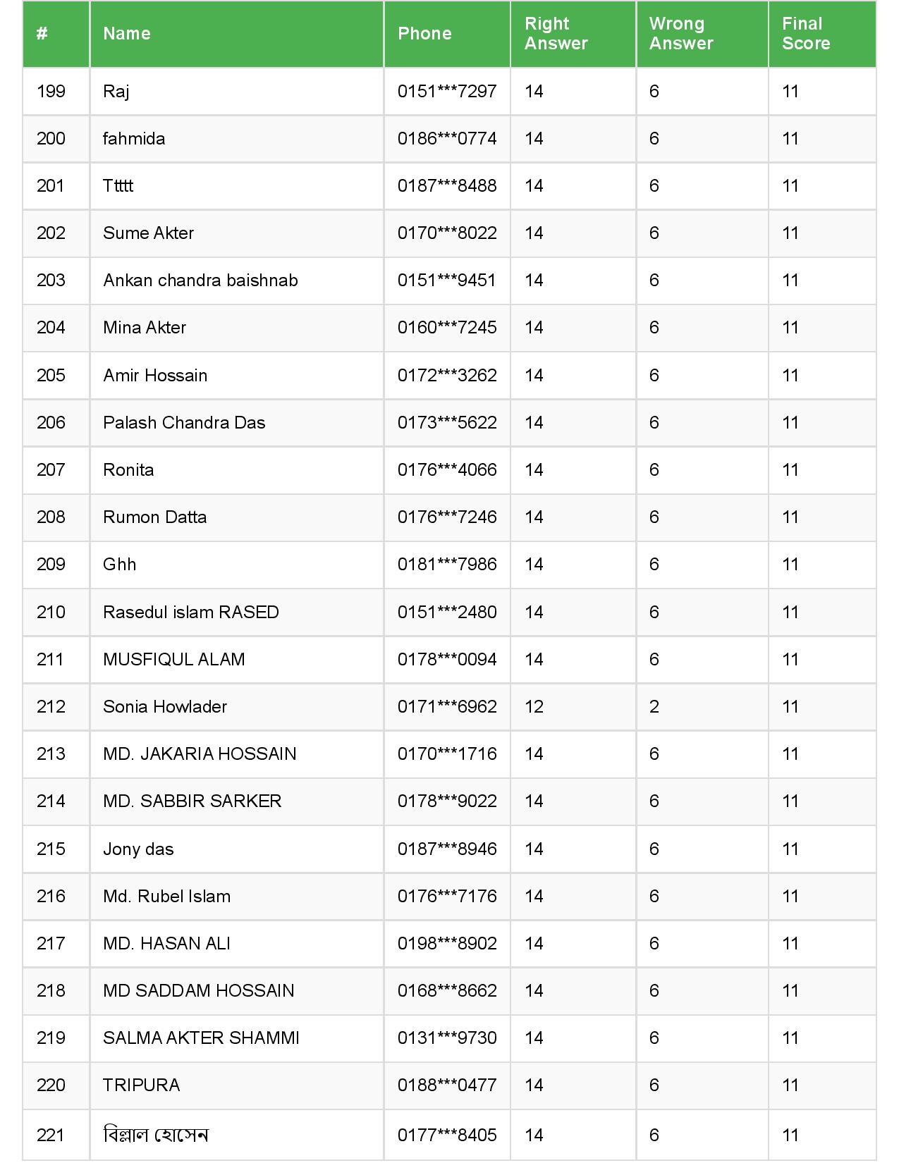 | 16 | Mukul | 0177***8789 | 18 | 2 | 17 |
