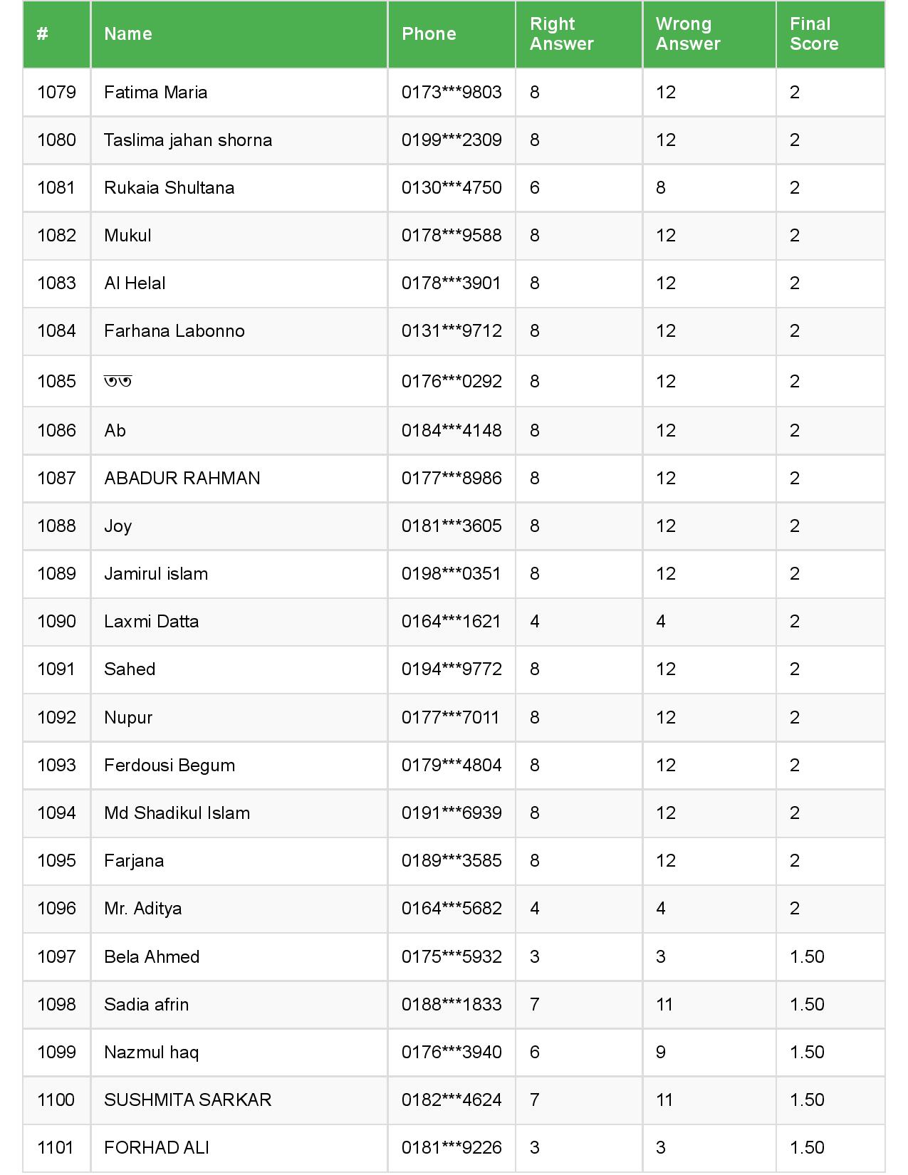 | 1 | Rubaiya | 0177***5262 | 20 | 0 | 20 |