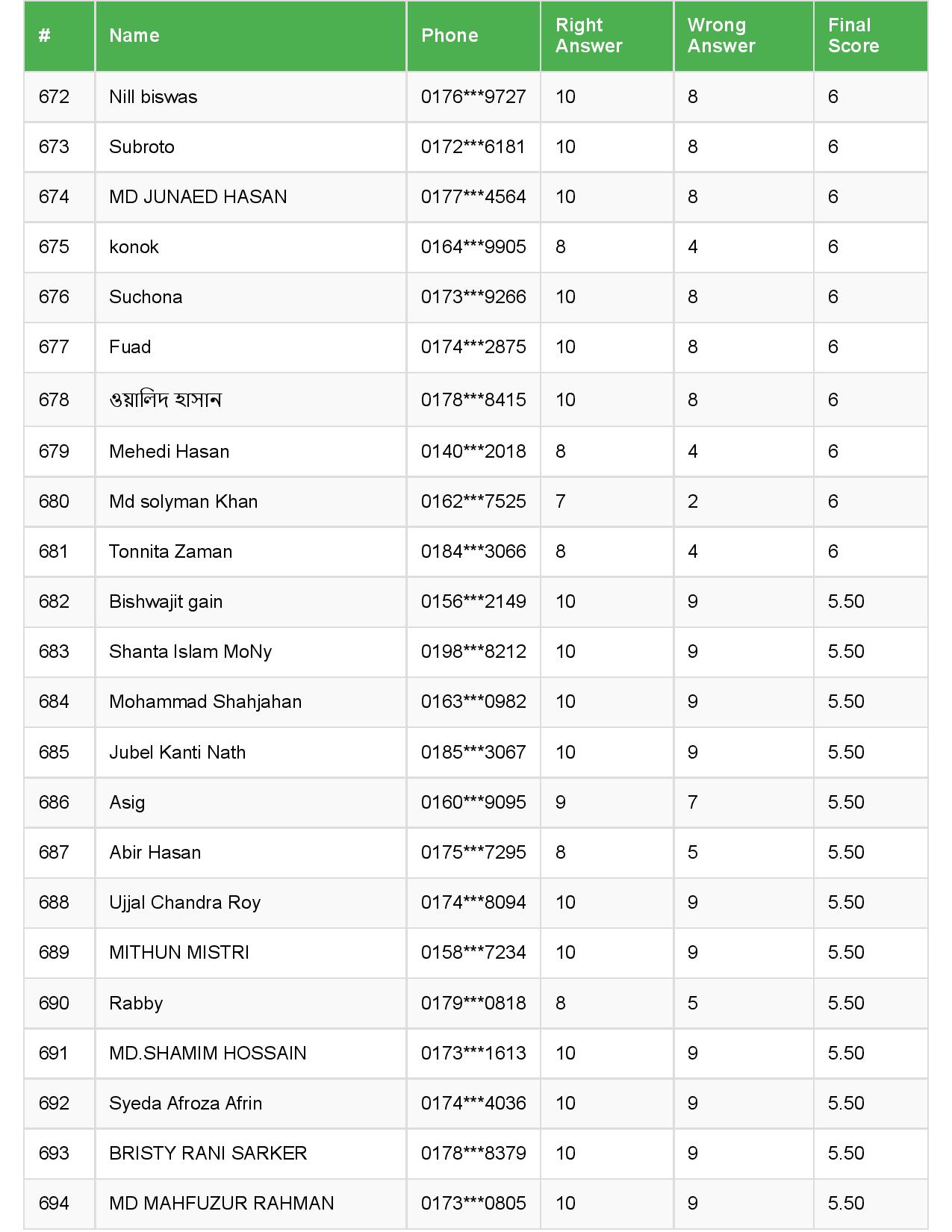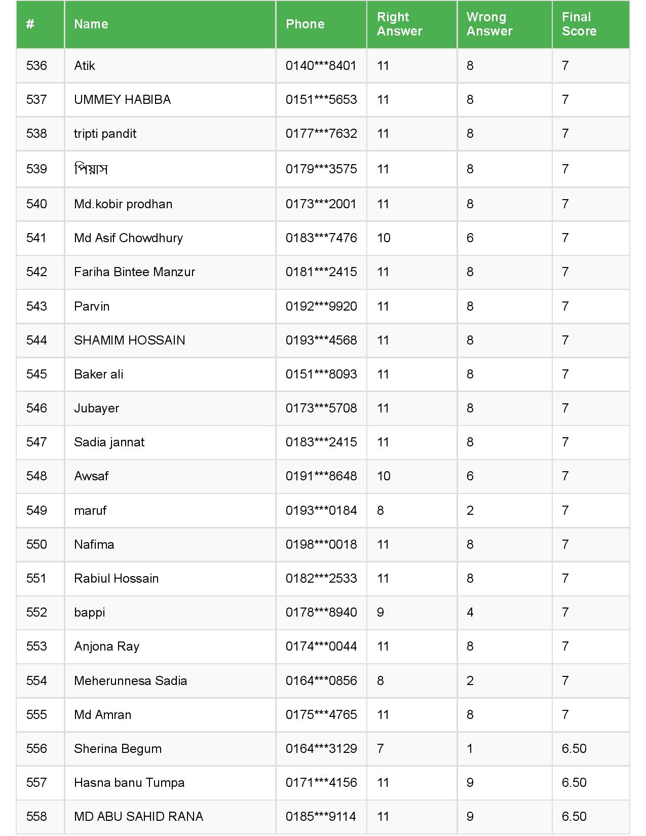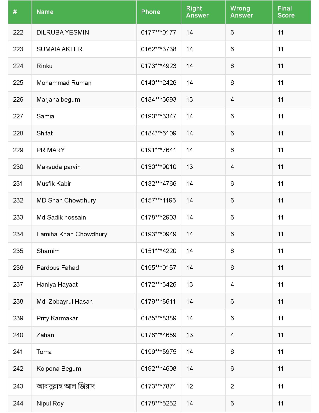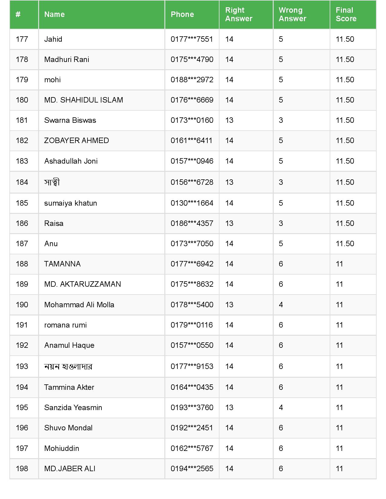 | 29 | Nasrin Aktar Anny | 0184***0605 | 17 | 3 | 15.50 |