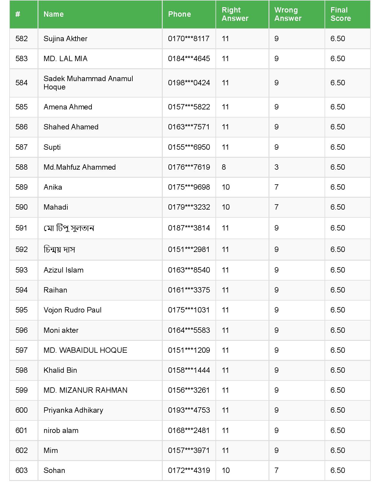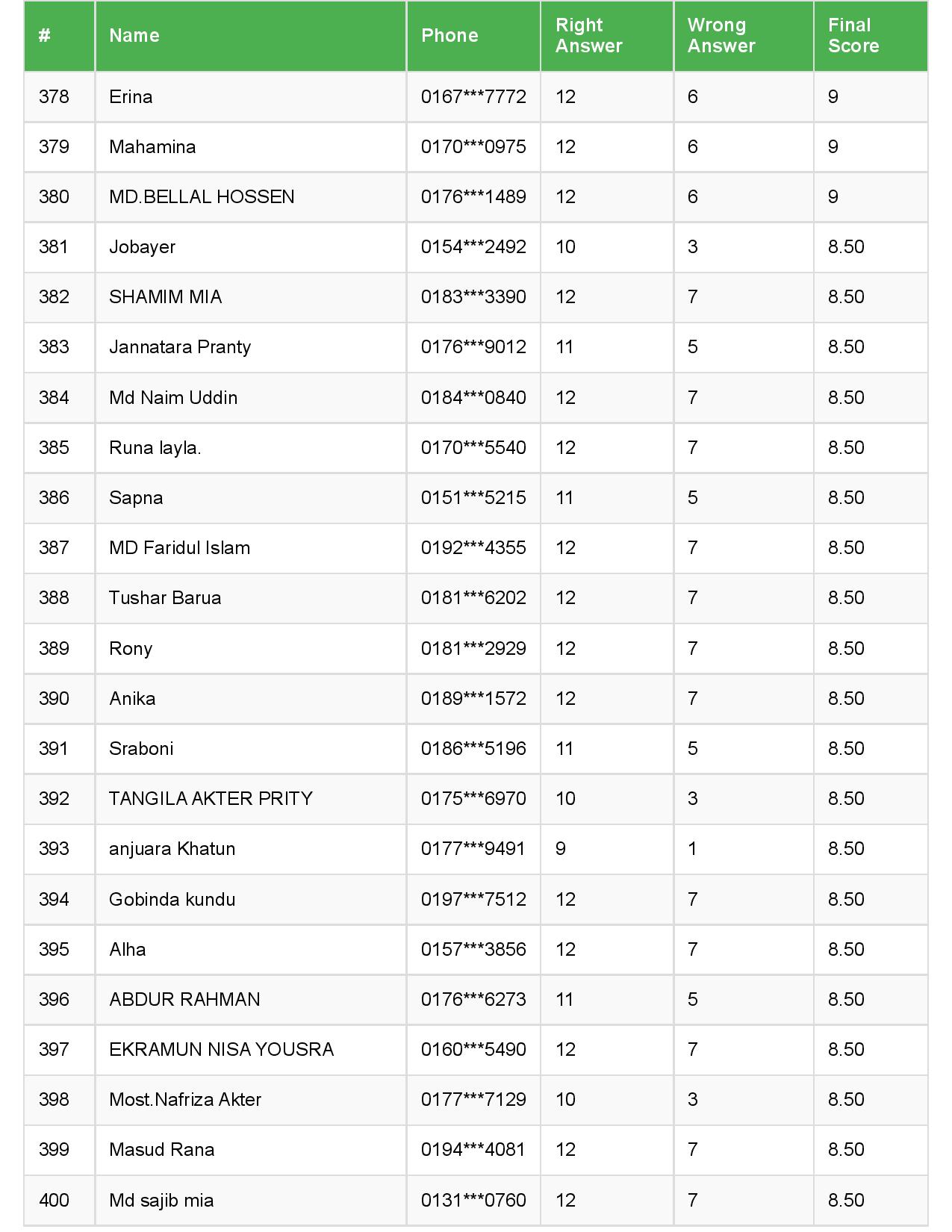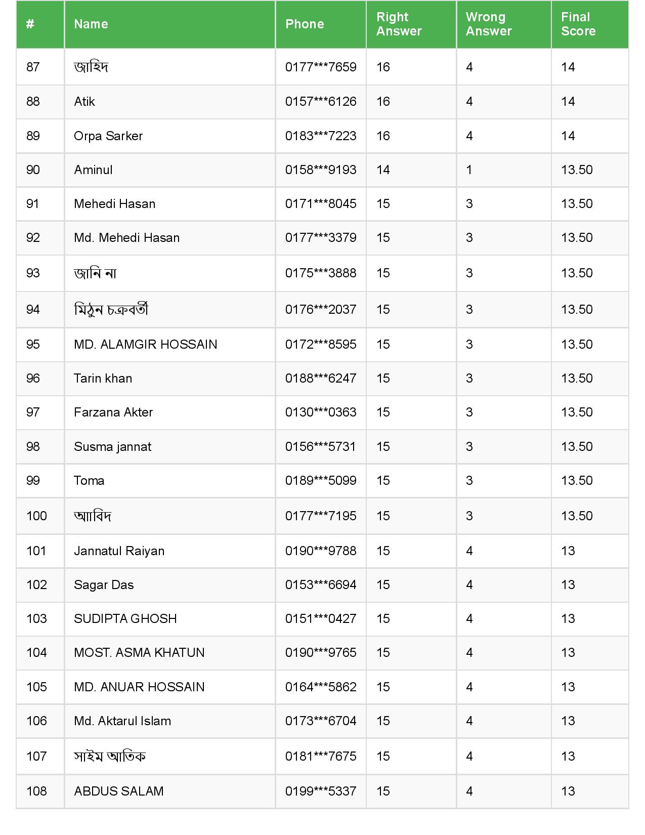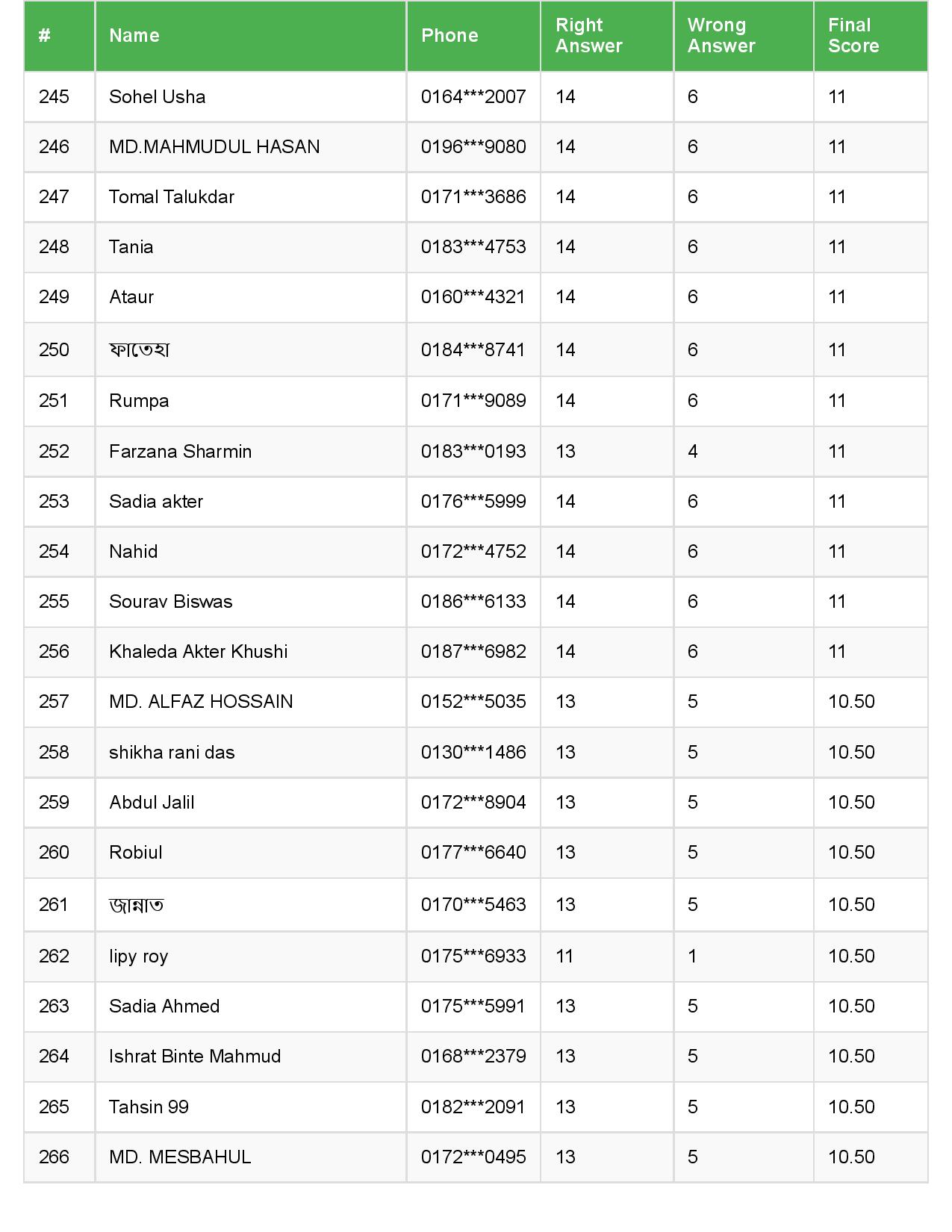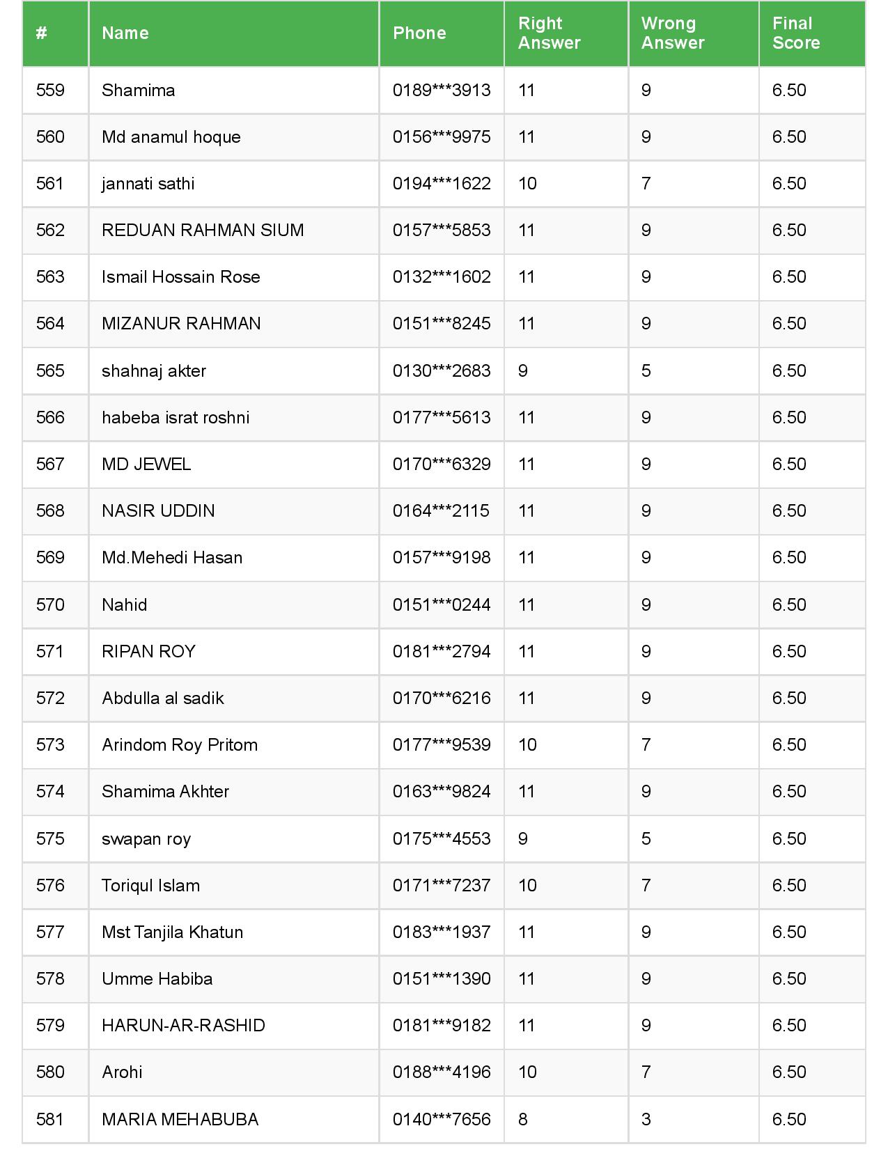 | 29 | Nasrin Aktar Anny | 0184***0605 | 17 | 3 | 15.50 |