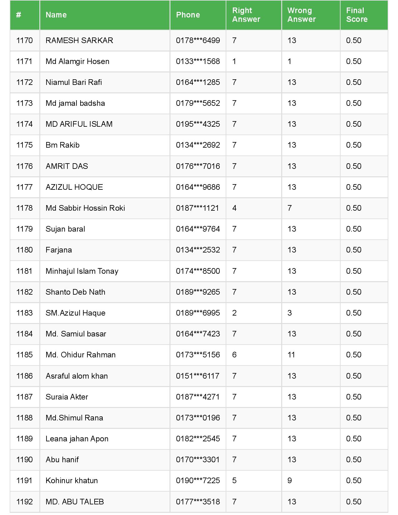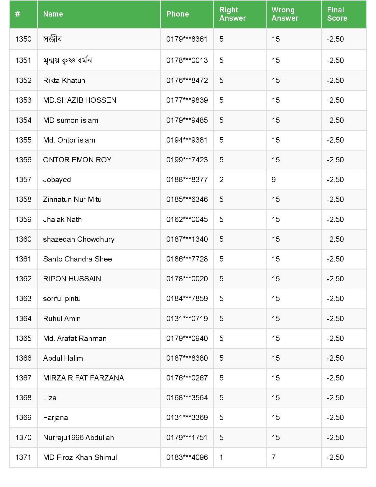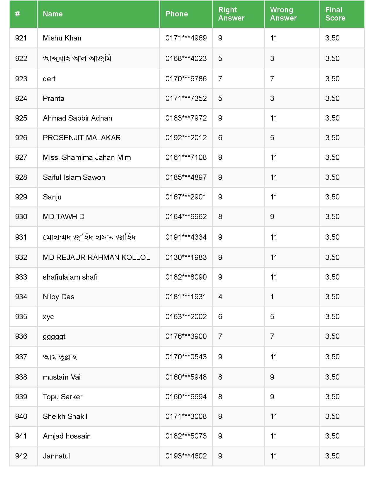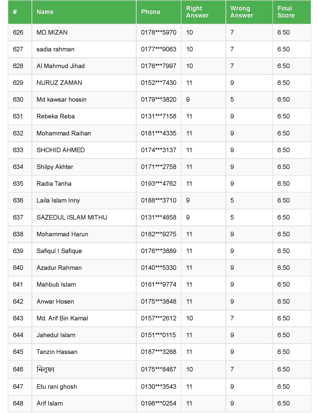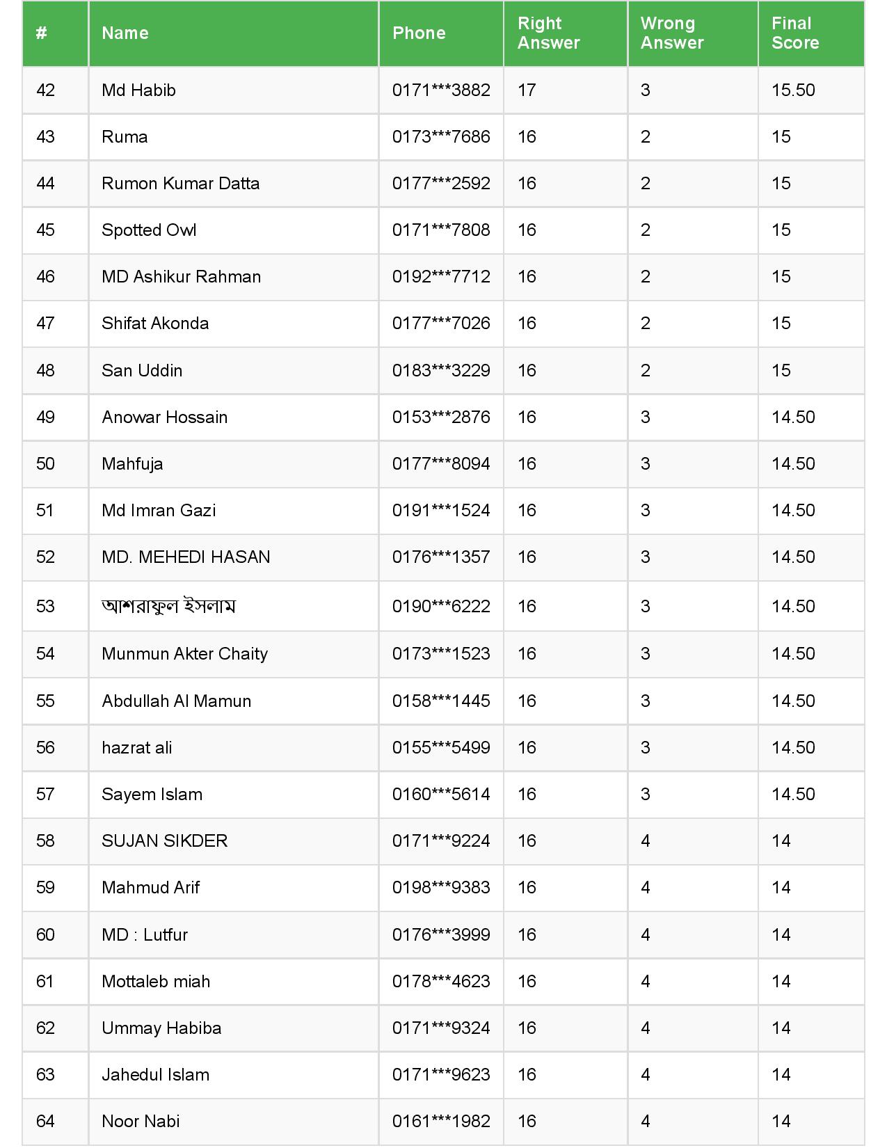 | 42 | Md Habib | 0171***3882 | 17 | 3 | 15.50 |