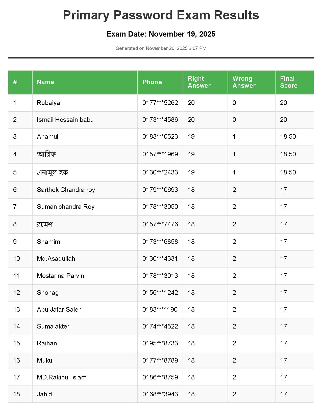 | 2 | Ismail Hossain babu | 0173***4586 | 20 | 0 | 20 |