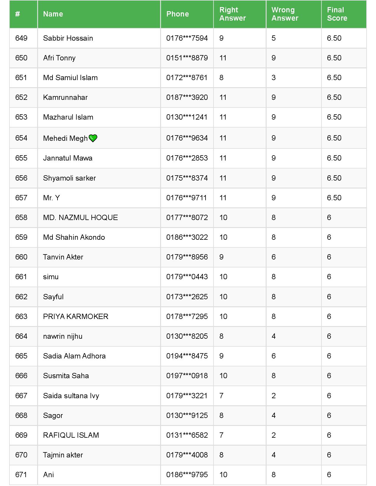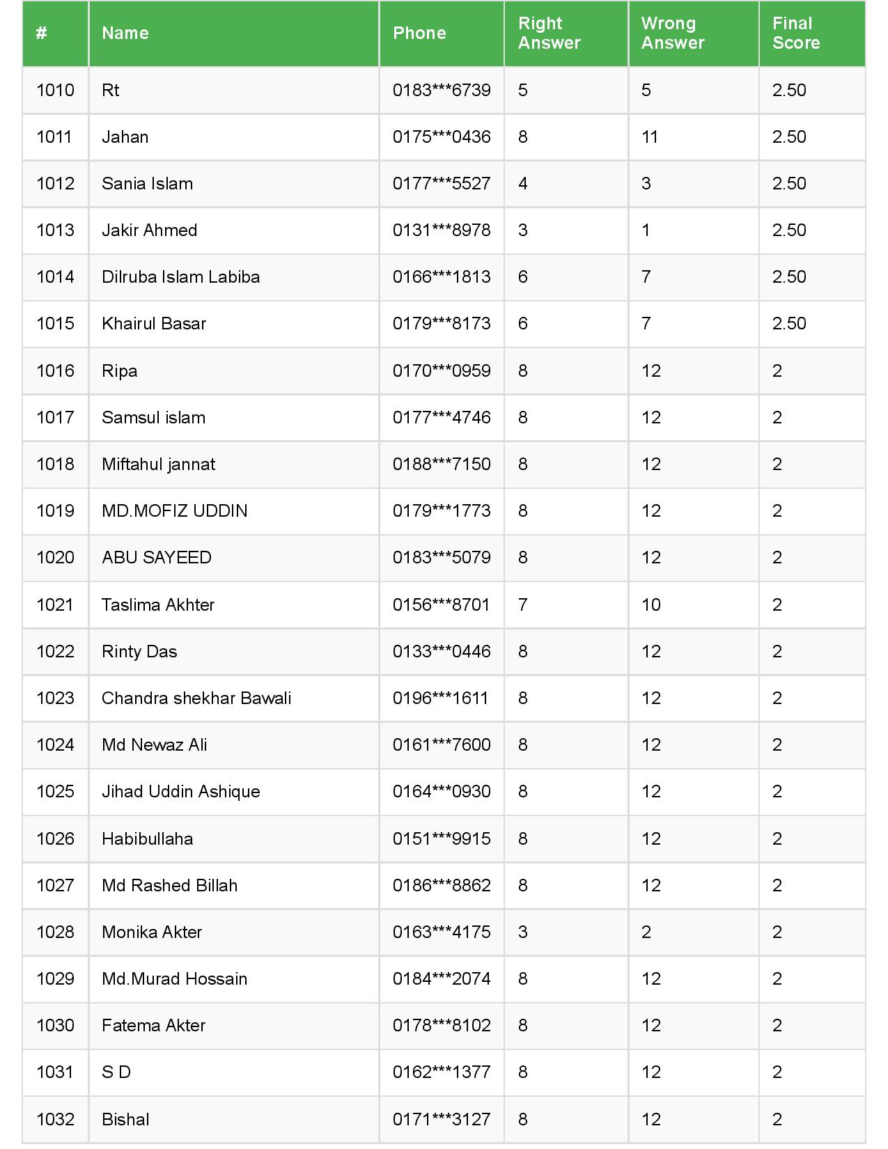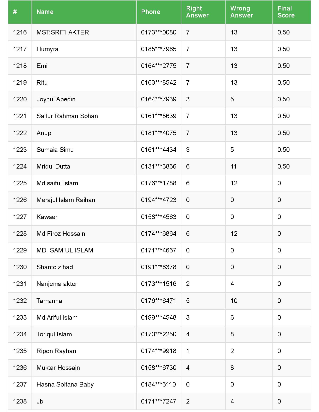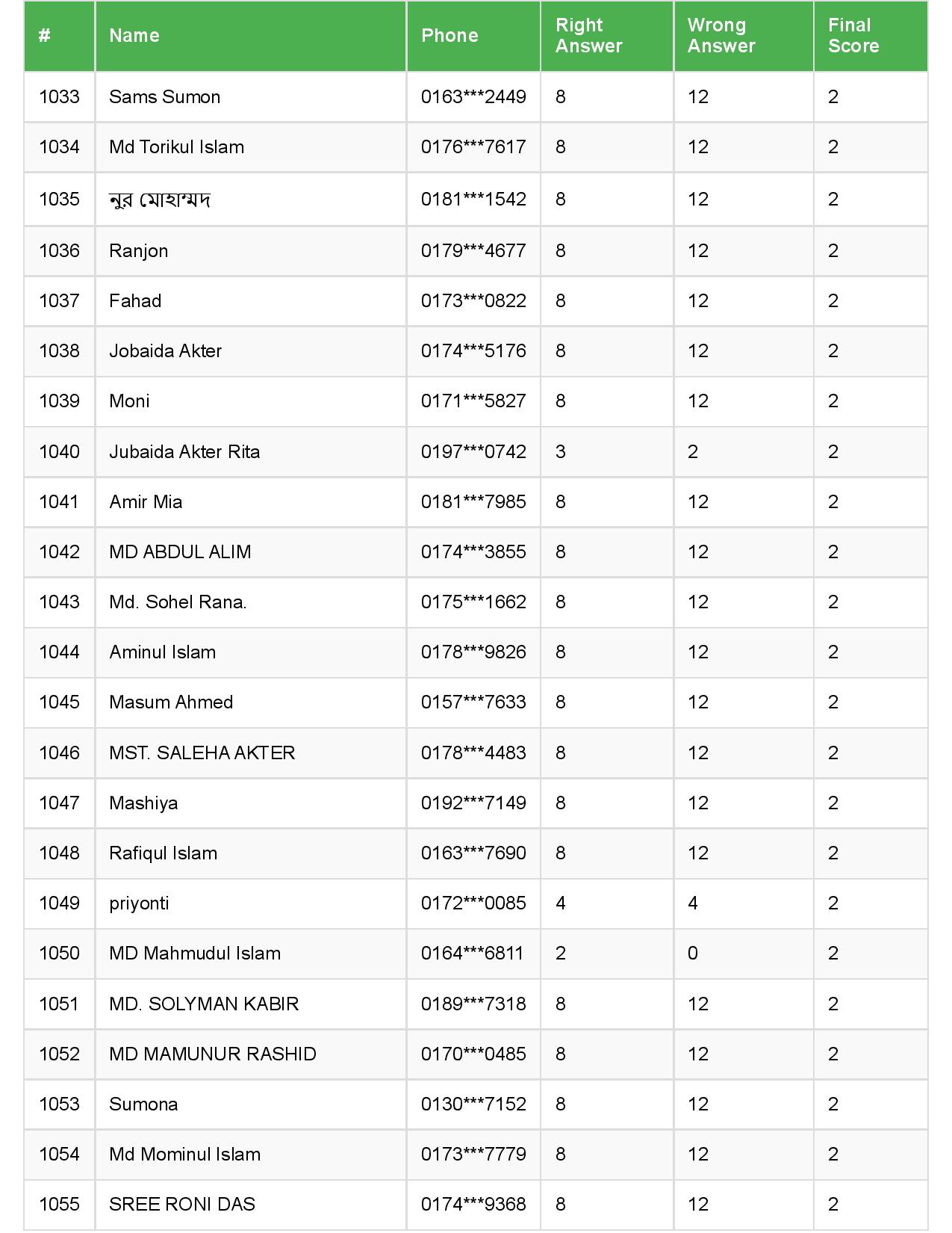 | # | Name | Phone | Right Answer | Wrong Answer | Final Score |