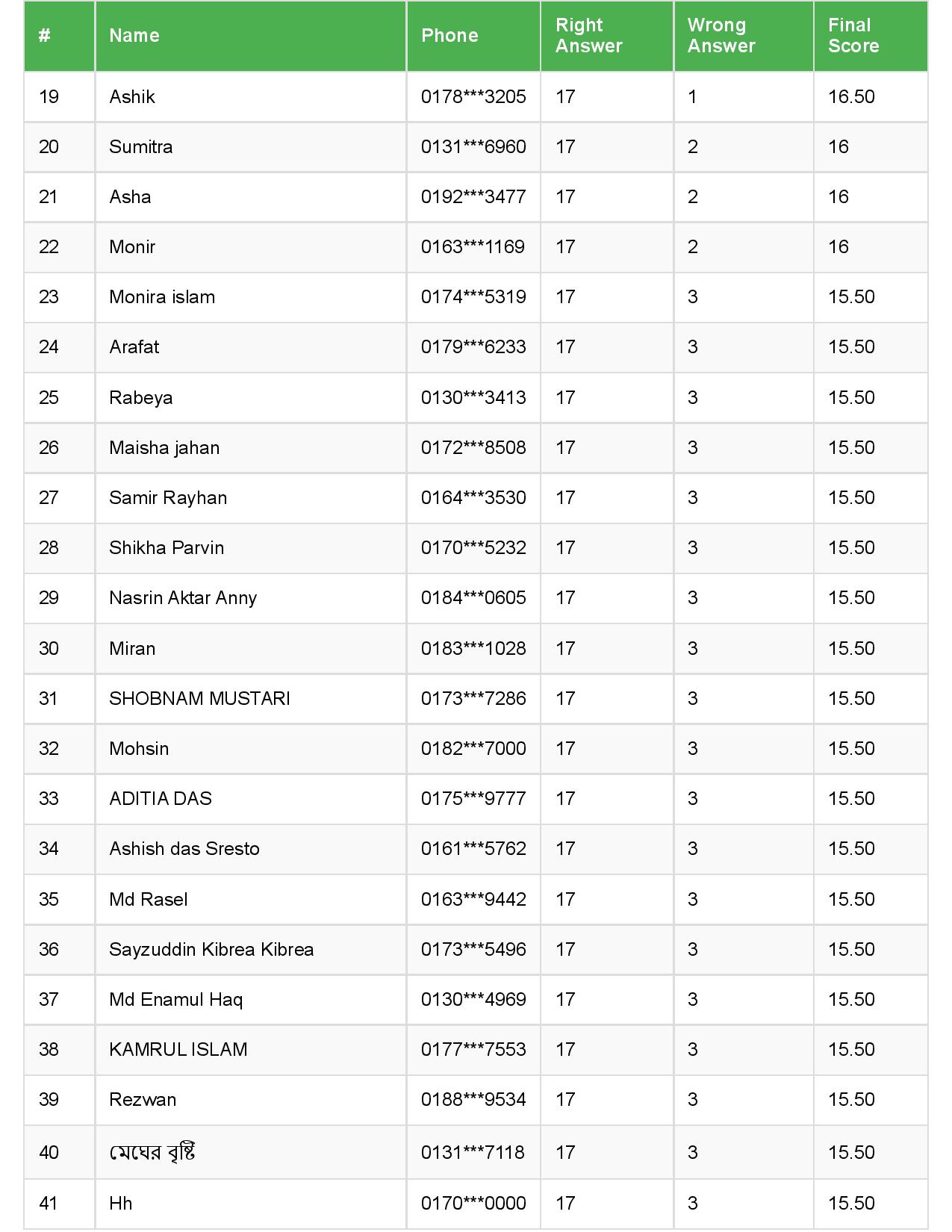 | 19 | Ashik | 0178***3205 | 17 | 1 | 16.50 |