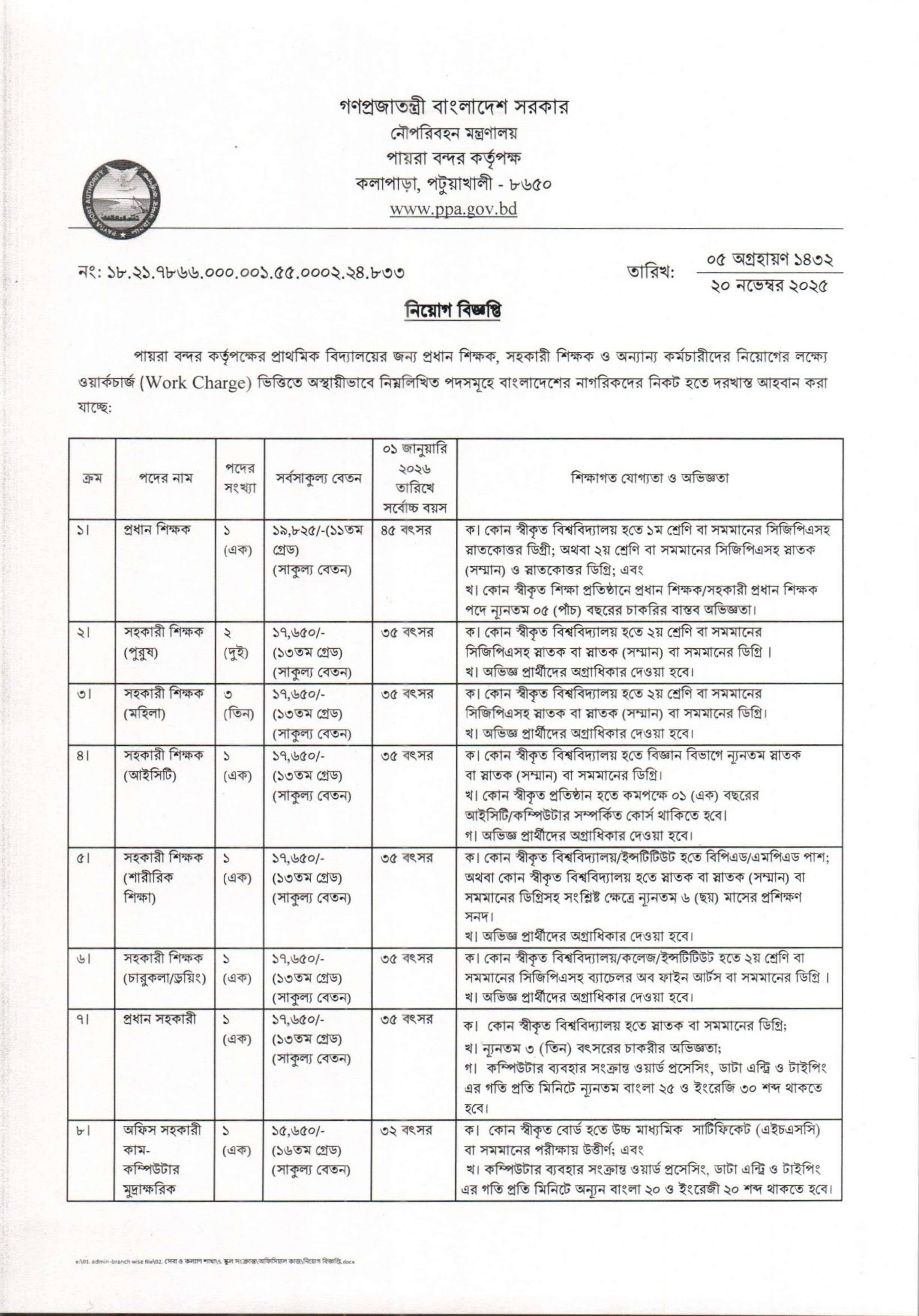 নৌপরিবহন মন্ত্রণালয়ের অধীন পায়রা বন্দর কর্তৃপক্ষ তাদের প্রাথমিক বিদ্যালয়ের জন্য ১৫টি অস্থায়ী পদে জনবল নিয়োগের বিজ্ঞপ্তি প্রকাশ করেছে। আগ্রহী ও যোগ্য প্রার্থীরা এই নিয়োগের জন্য আবেদন করতে পারবেন।