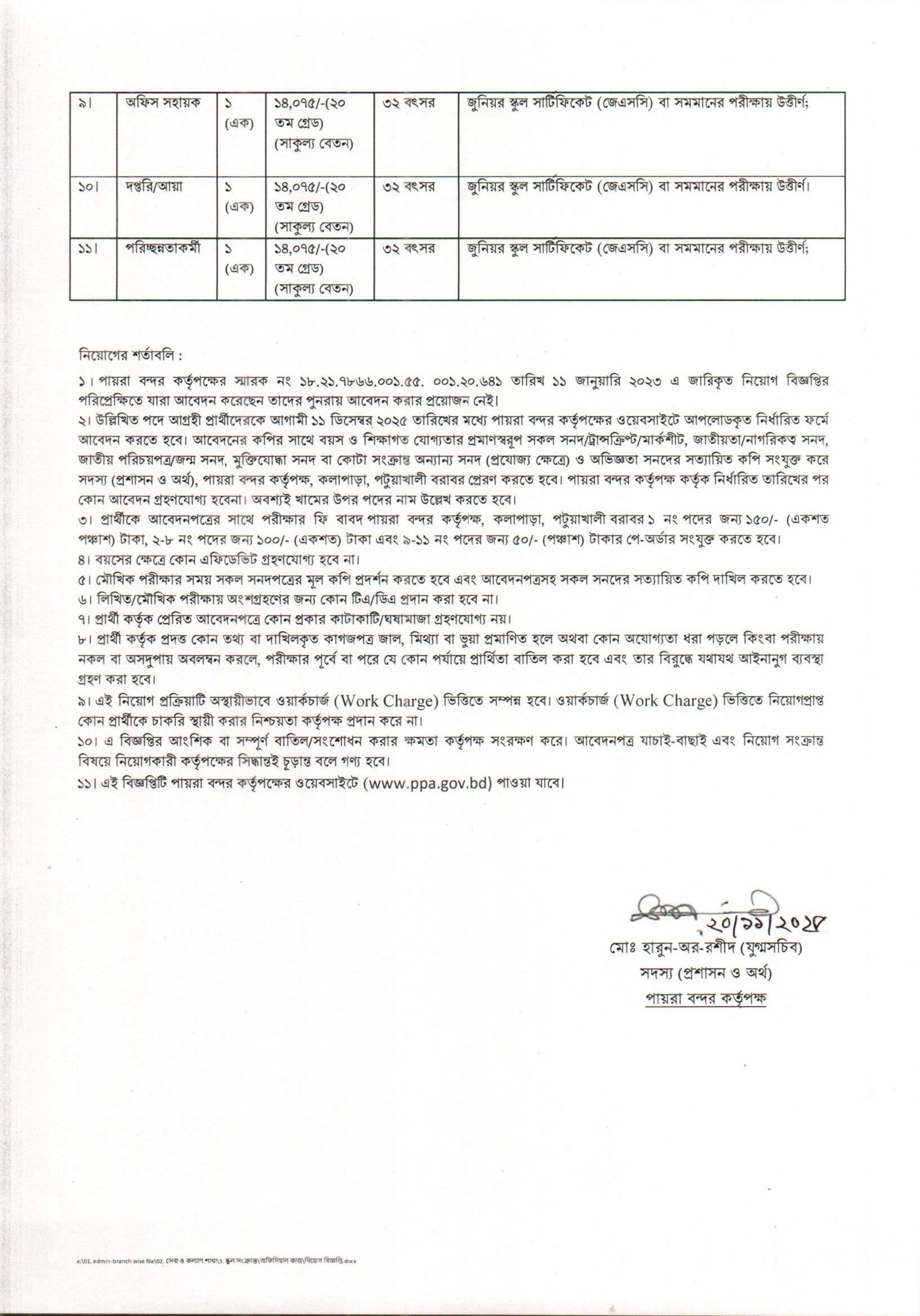 আবেদনের প্রক্রিয়া:আগ্রহী প্রার্থীদেরকে পায়রা বন্দর কর্তৃপক্ষের ওয়েবসাইটে আপলোডকৃত নির্ধারিত ফরমে আবেদন করতে হবে। আবেদনপত্রের কপির সাথে বয়স ও শিক্ষাগত যোগ্যতার প্রমাণস্বরূপ সকল সনদ/ট্রান্সক্রিপ্ট/মার্কশীট, জাতীয়তা/নাগরিকত্ব সনদ, জাতীয় পরিচয়পত্র/জন্ম সনদ, মুক্তিযোদ্ধা সনদ বা কোটা সংক্রান্ত অন্যান্য সনদ (প্রযোজ্য ক্ষেত্রে) ও অভিজ্ঞতা সনদের সত্যায়িত কপি সংযুক্ত করে সদস্য (প্রশাসন ও অর্থ), পায়রা বন্দর কর্তৃপক্ষ, কলাপাড়া, পটুয়াখালী বরাবর ডাকযোগে প্রেরণ করতে হবে। খামের উপর অবশ্যই পদের নাম উল্লেখ করতে হবে।