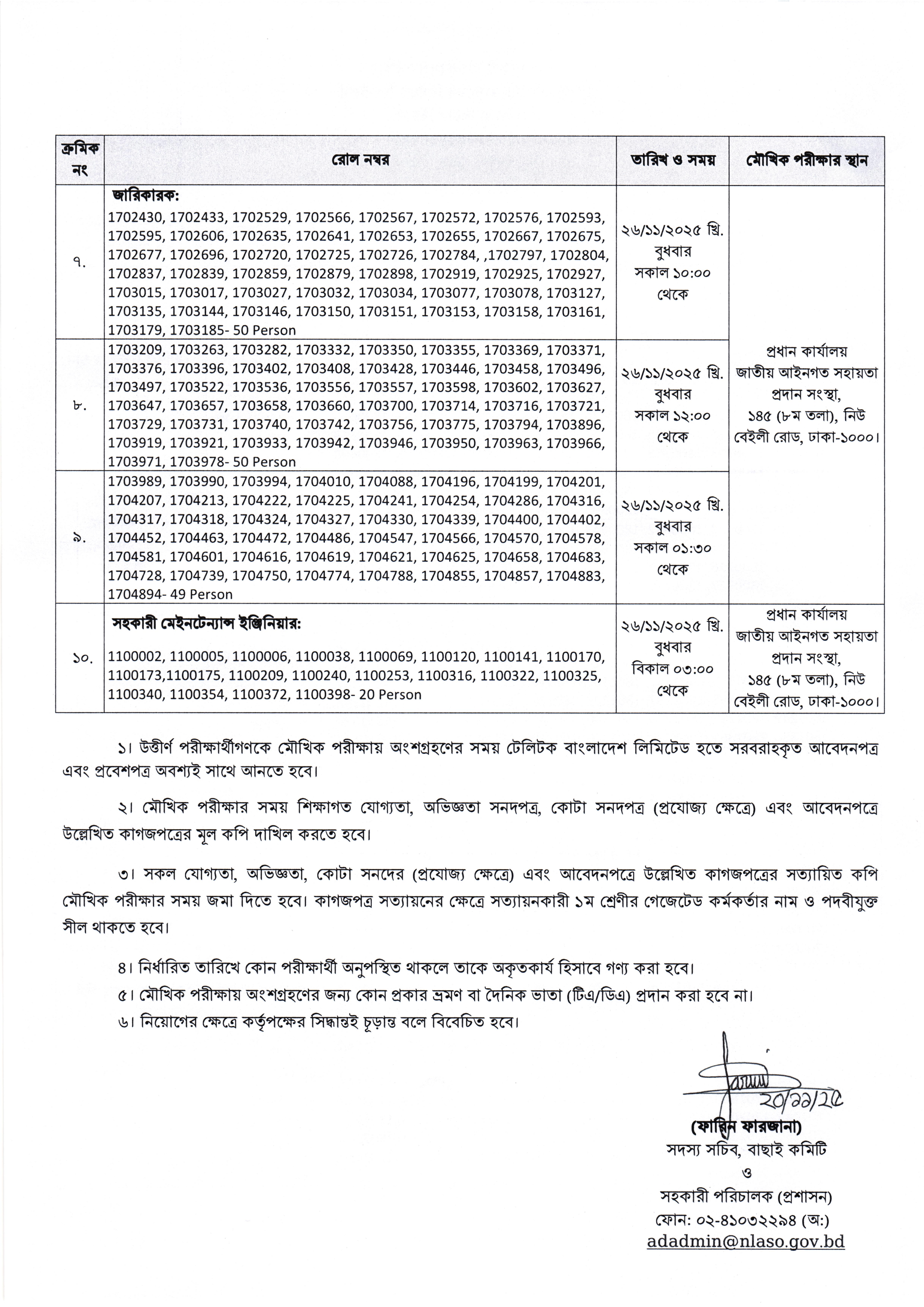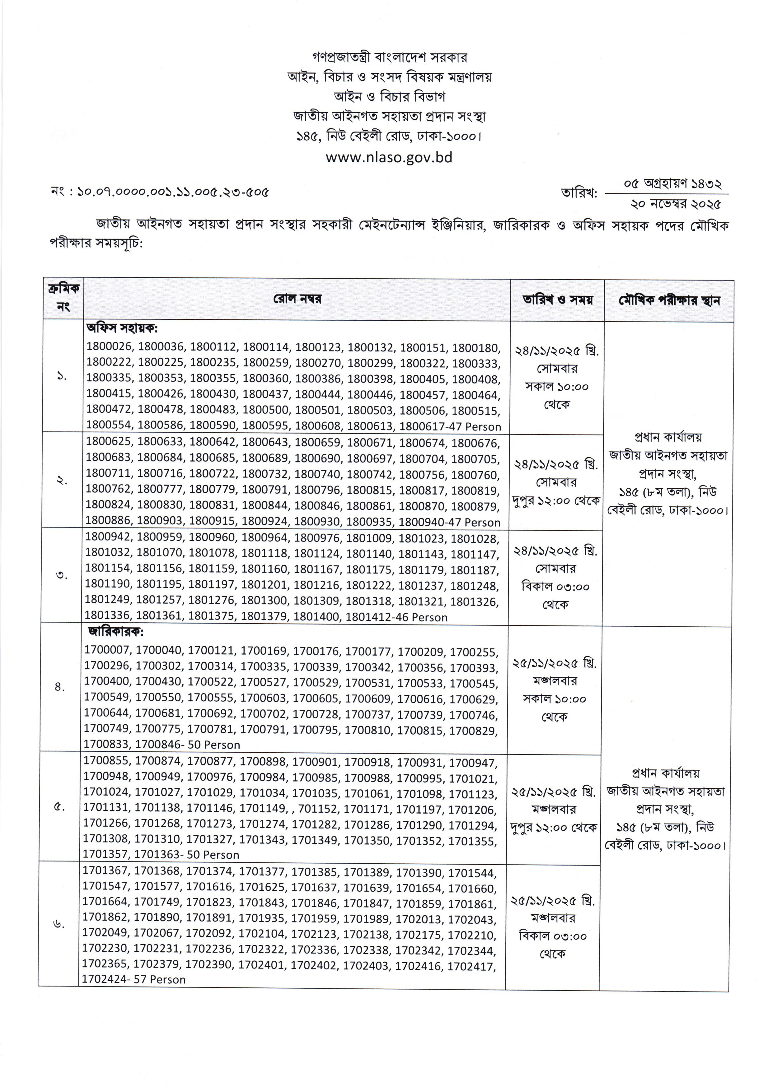 পরীক্ষার স্থান: জাতীয় আইনগত সহায়তা প্রদান সংস্থা, প্রধান কার্যালয়, ১৪৫ (৮ম তলা), নিউ বেইলী রোড, ঢাকা-১০০০।