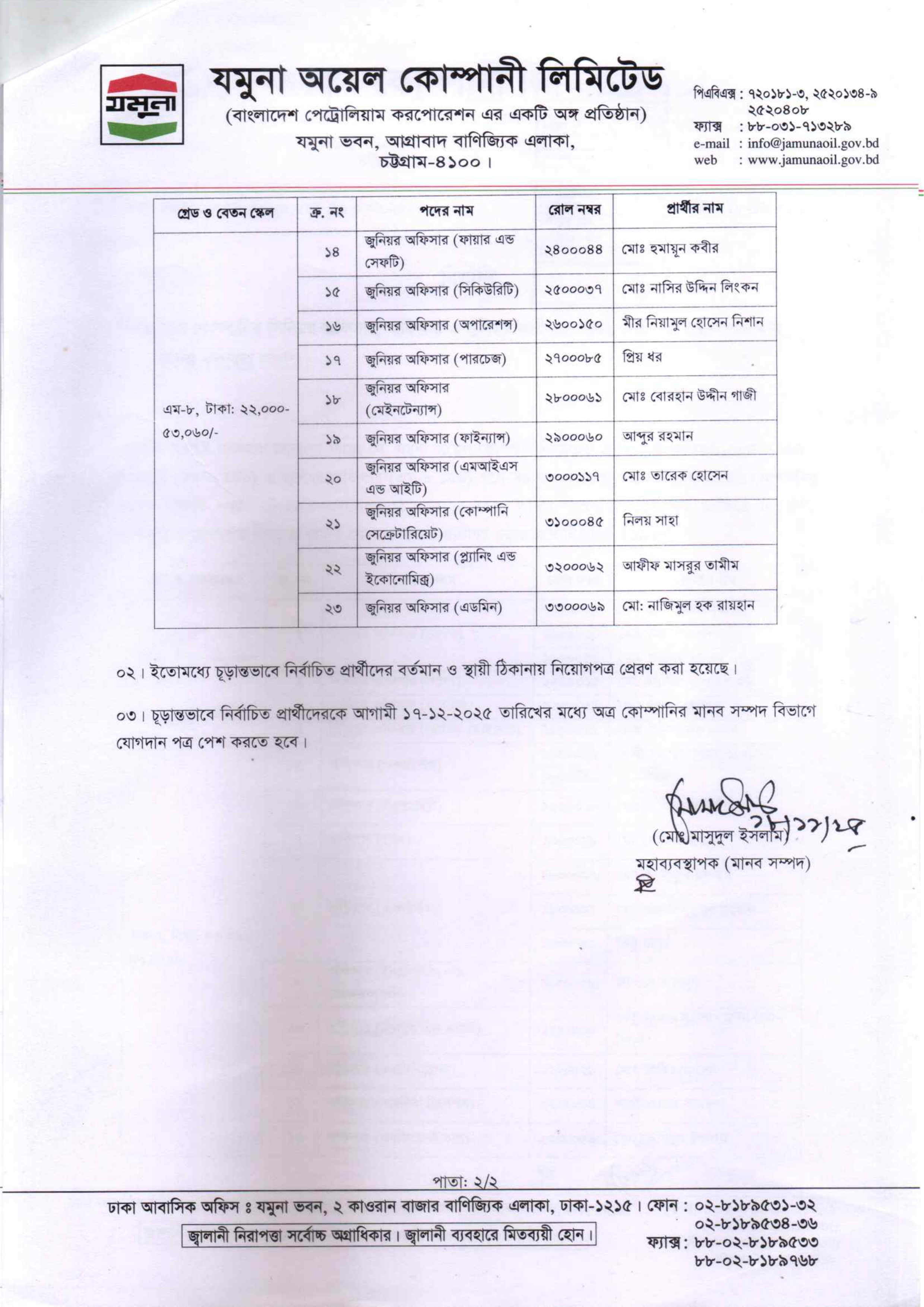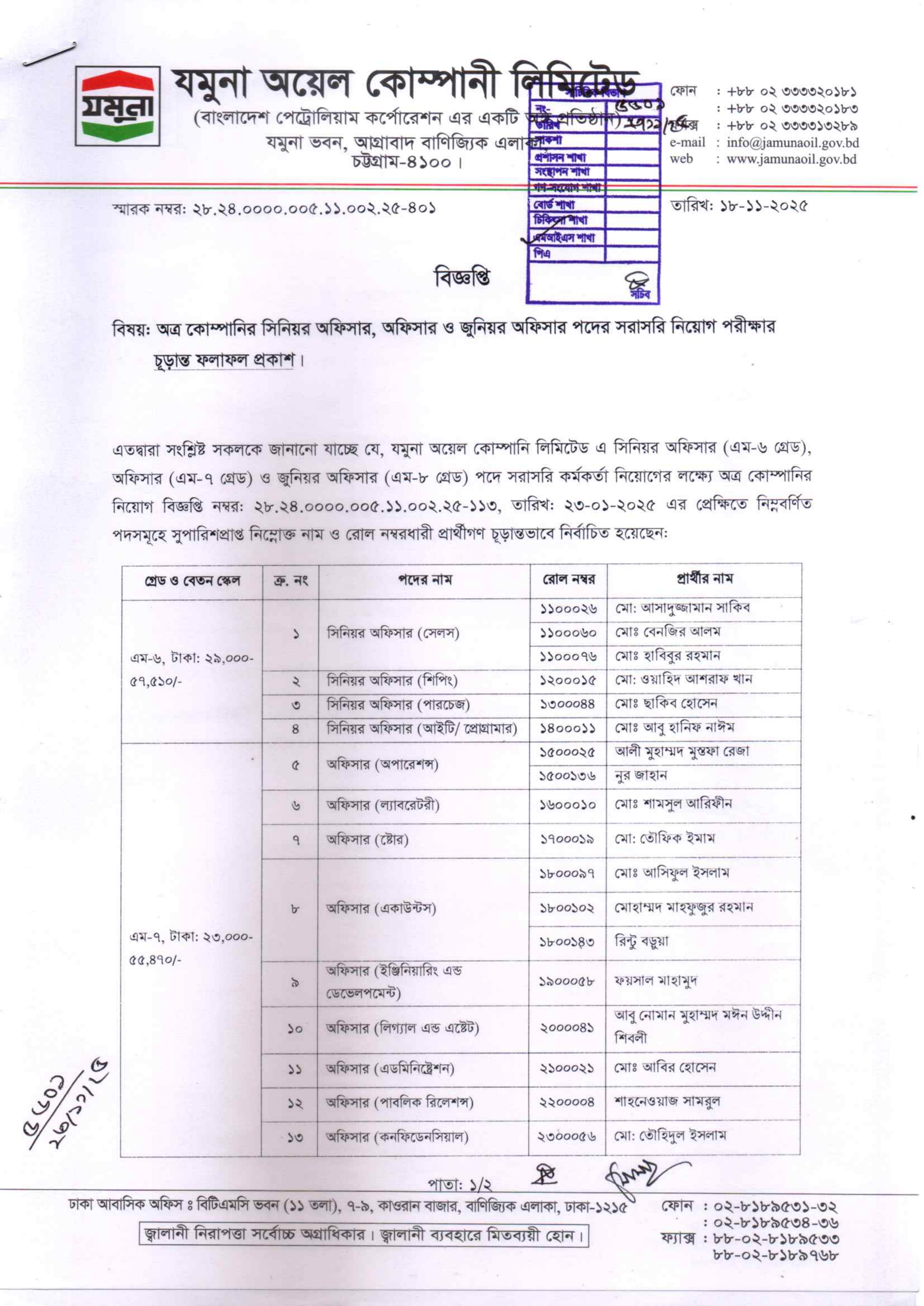 যমুনা অয়েল কোম্পানি লিমিটেড এর সিনিয়র অফিসার, অফিসার ও জুনিয়র অফিসার পদের সরাসরি নিয়োগ পরীক্ষার চূড়ান্ত ফলাফল প্রকাশিত হয়েছে।