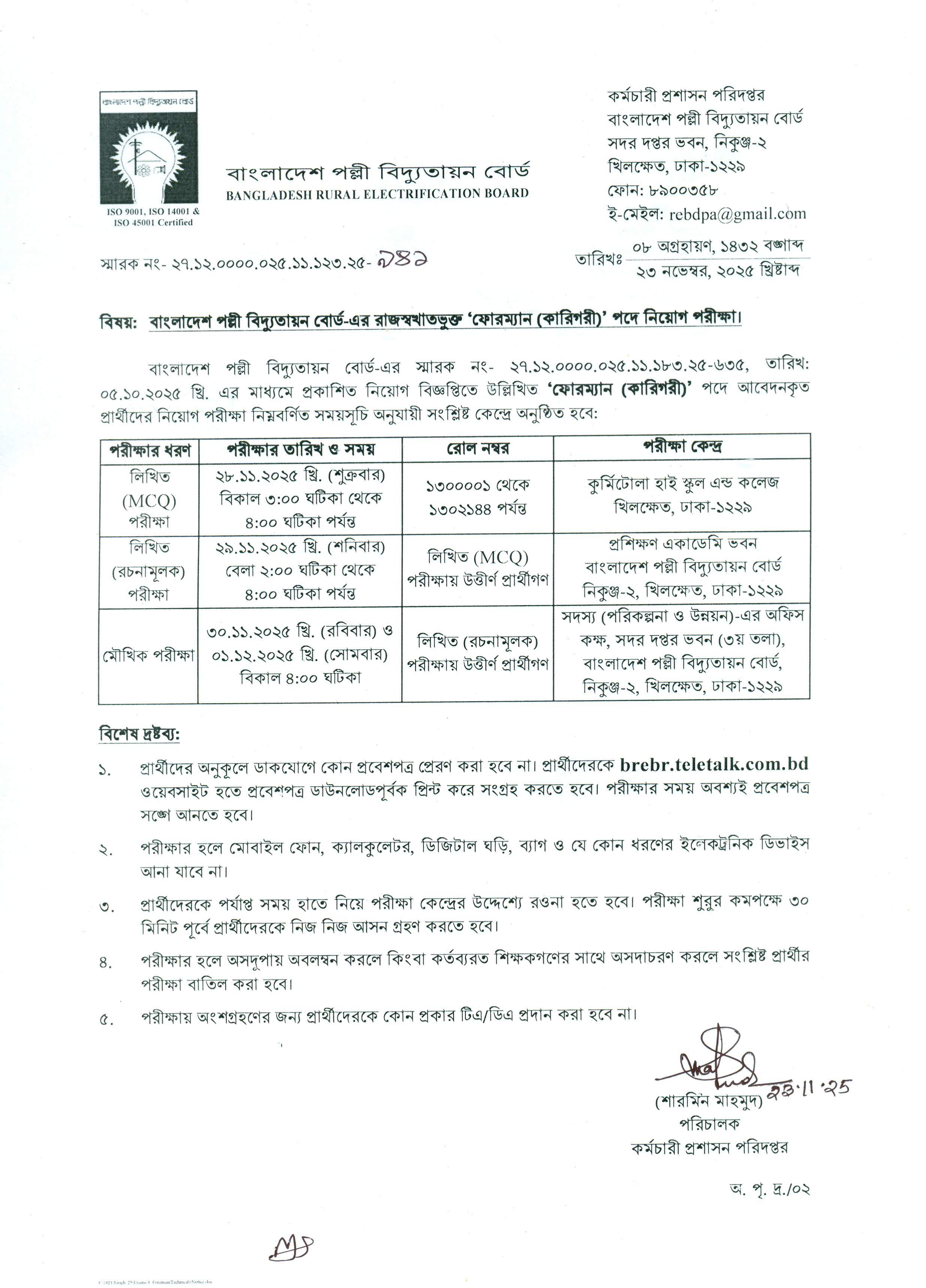 বাংলাদেশ পল্লী বিদ্যুতায়ন বোর্ড-এর রাজস্বখাতভুক্ত 'ফোরম্যান (কারিগরী)' পদে নিয়োগ পরীক্ষার সময়সূচি প্রকাশ করা হয়েছে। আবেদনকৃত প্রার্থীদের ব্যবহারিক ও মৌখিক পরীক্ষা নিম্নবর্ণিত সময়সূচি অনুযায়ী অনুষ্ঠিত হবে: