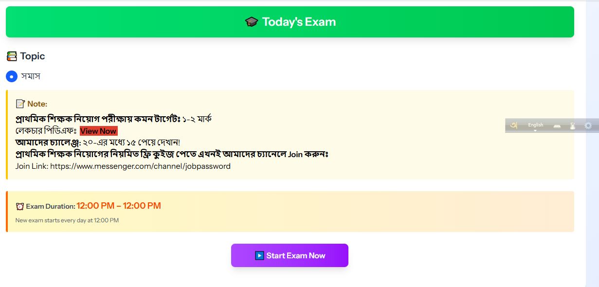 আপনার প্রাথমিক শিক্ষক নিয়োগ পরীক্ষার প্রস্তুতি কতটা শক্ত—তা যাচাই করুন একটি স্মার্ট কুইজে! পুরো কুইজ বিপরীত শব্দ অধ্যায়ের বাছাইকৃত ২০টি প্রশ্নে সাজানো ছিল। লক্ষ্য ছিল: ২০-এ ১৫ বা তার বেশি স্কোর করে দেখানো। আত্মবিশ্বাস, গতি আর নির্ভুলতা—সবকিছুরই পরীক্ষা হবে এখানে। এভাবেই সম্পূর্ণ সিলেবাস শেষ করা হবে।