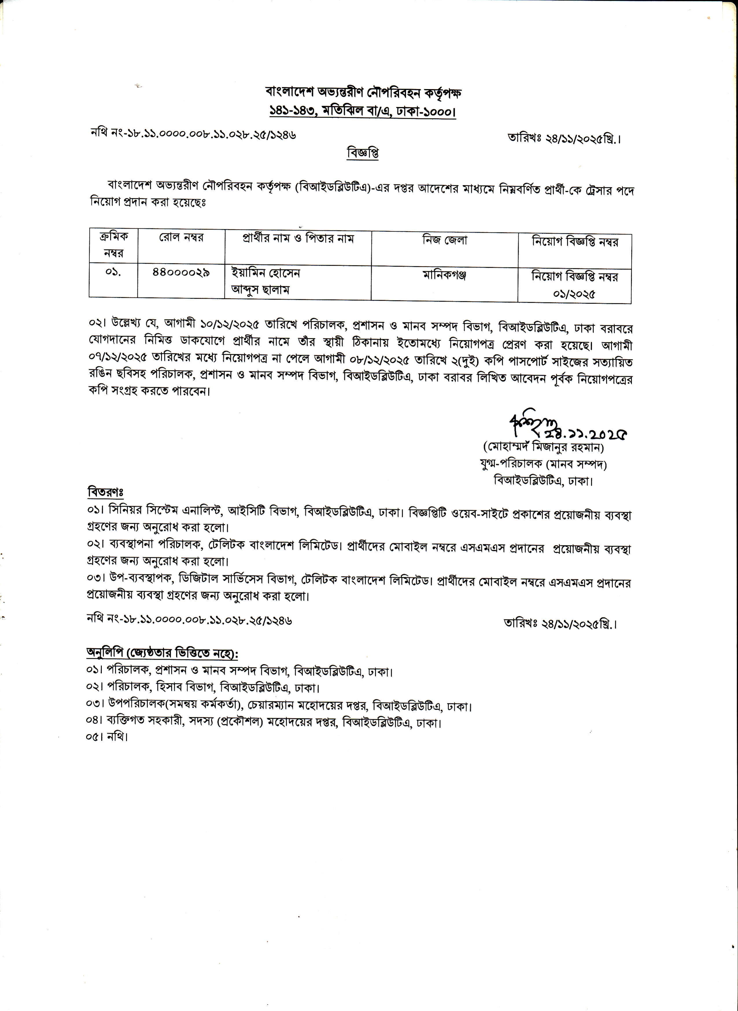 নিয়োগপ্রাপ্ত প্রার্থীকে আগামী ১০/১২/২০২৫ তারিখে পরিচালক, প্রশাসন ও মানব সম্পদ বিভাগ, বিআইডব্লিউটিএ, ঢাকা বরাবর যোগদানের জন্য নির্দেশ দেওয়া হয়েছে।