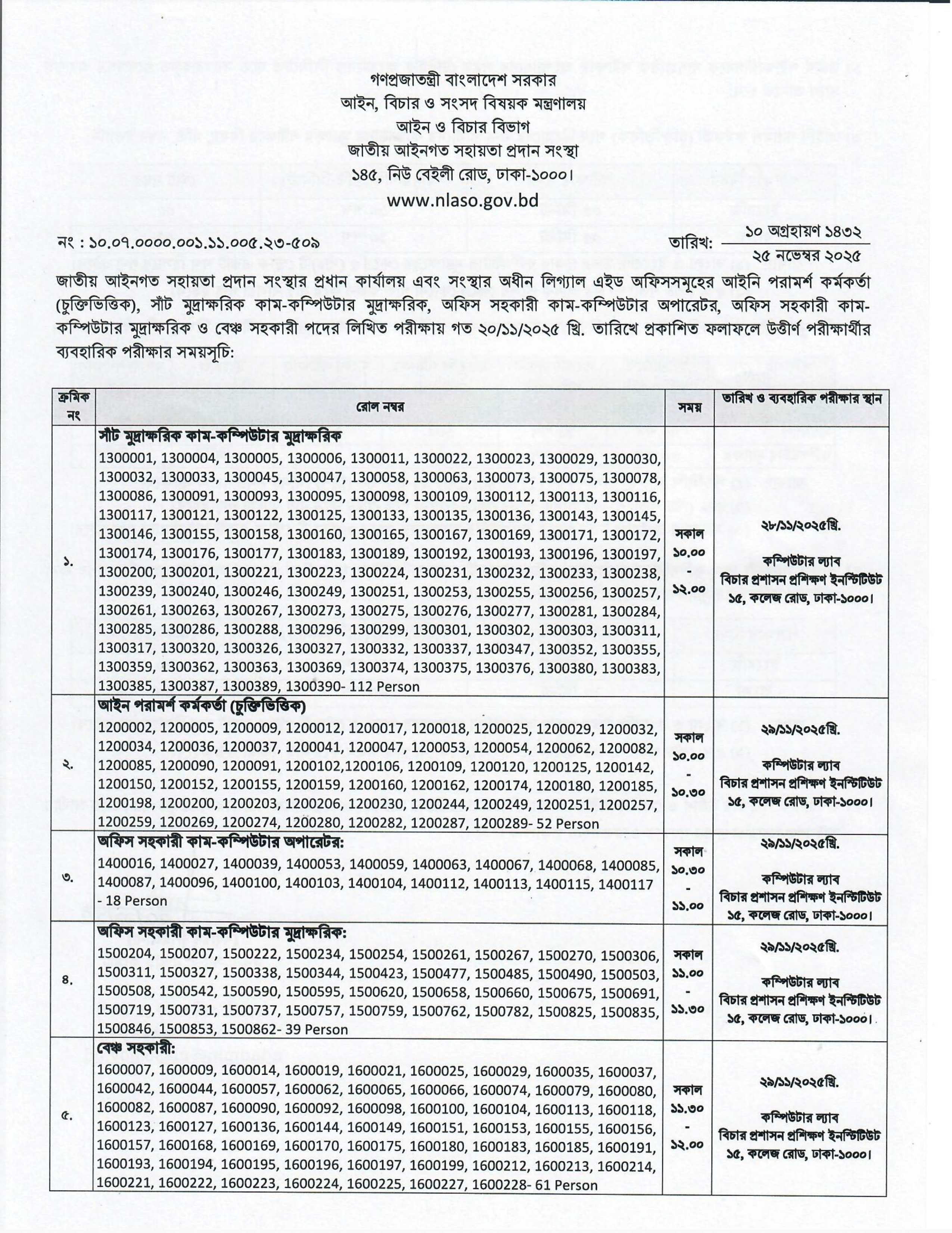 জাতীয় আইনগত সহায়তা প্রদান সংস্থার প্রধান কার্যালয় এবং অধীন লিগ্যাল এইড অফিসসমূহের বিভিন্ন পদে লিখিত পরীক্ষায় উত্তীর্ণ পরীক্ষার্থীদের ব্যবহারিক পরীক্ষার সময়সূচি প্রকাশ করা হয়েছে।