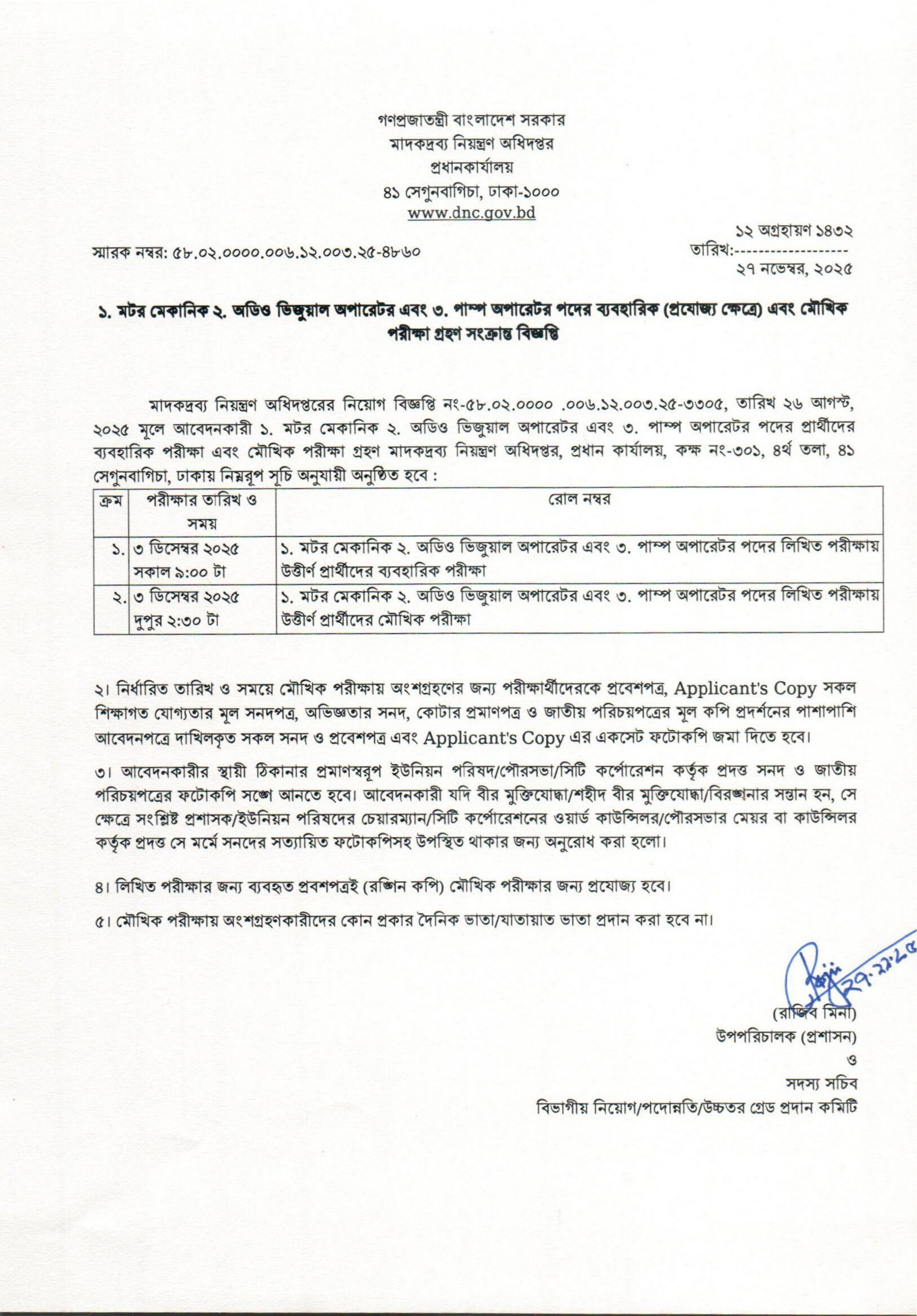 মাদকদ্রব্য নিয়ন্ত্রণ অধিদপ্তর কর্তৃক মটর মেকানিক, অডিও ভিজুয়াল অপারেটর এবং পাম্প অপারেটর পদের ব্যবহারিক (প্রযোজ্য ক্ষেত্রে) ও মৌখিক পরীক্ষার তারিখ ঘোষণা করা হয়েছে।
