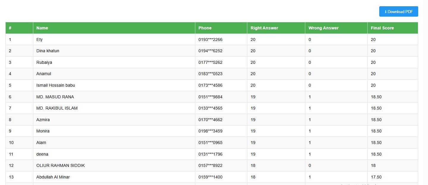 | # | Name | Phone | Right Answer | Wrong Answer | Final Score |