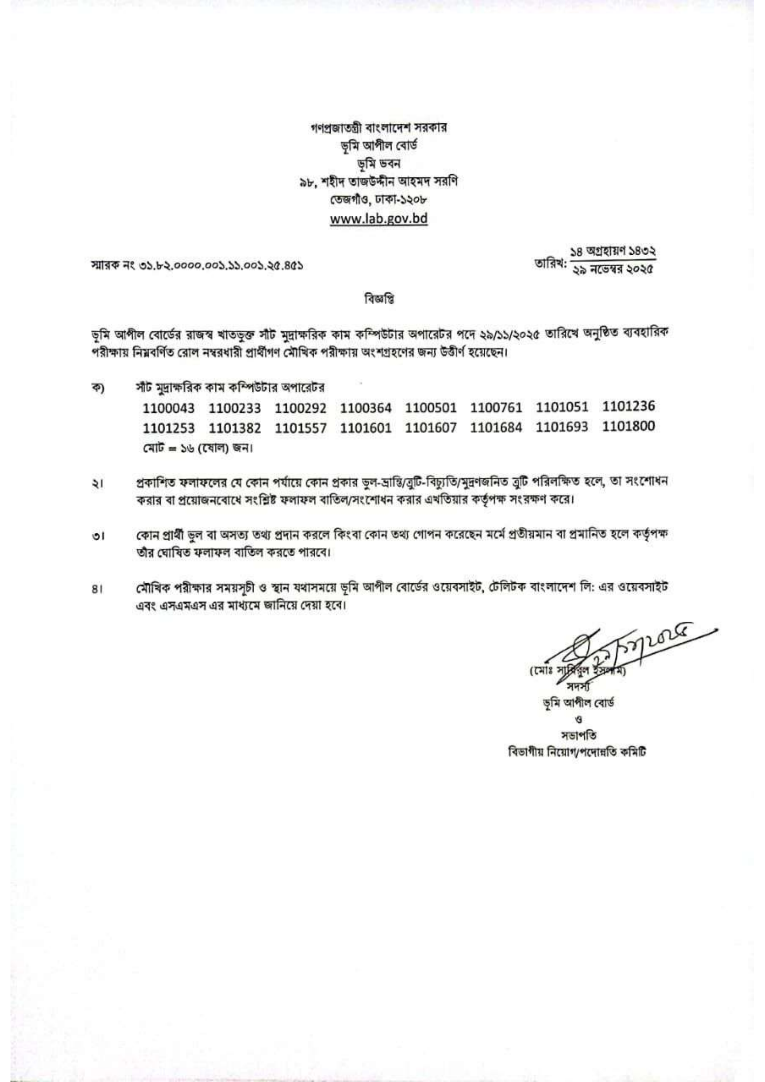 মৌখিক পরীক্ষার সময়সূচী ও স্থান যথাসময়ে ভূমি আপীল বোর্ডের ওয়েবসাইট, টেলিটক বাংলাদেশ লি: এর ওয়েবসাইট এবং এসএমএস এর মাধ্যমে জানিয়ে দেওয়া হবে।