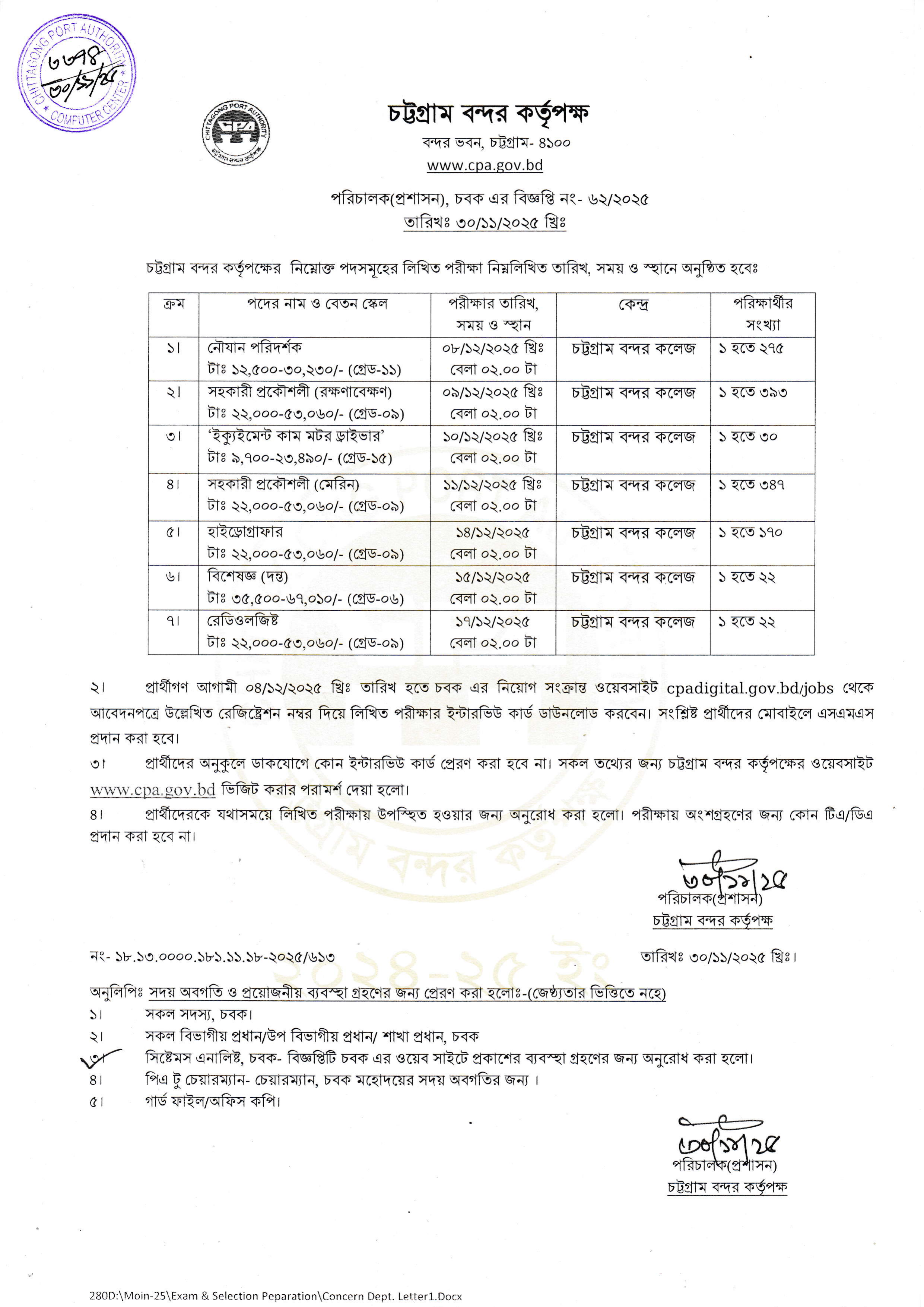প্রার্থীগণ আগামী ০৪/১২/২০২৫ খ্রিঃ তারিখ হতে চট্টগ্রাম বন্দর কর্তৃপক্ষের নিয়োগ সংক্রান্ত ওয়েবসাইট থেকে আবেদনপত্রে উল্লেখিত রেজিস্ট্রেশন নম্বর দিয়ে লিখিত পরীক্ষার প্রবেশপত্র (ইন্টারভিউ কার্ড) ডাউনলোড করতে পারবেন। সংশ্লিষ্ট প্রার্থীদের মোবাইলে এসএমএস-এর মাধ্যমেও জানানো হবে। ডাকযোগে কোনো প্রবেশপত্র প্রেরণ করা হবে না।
