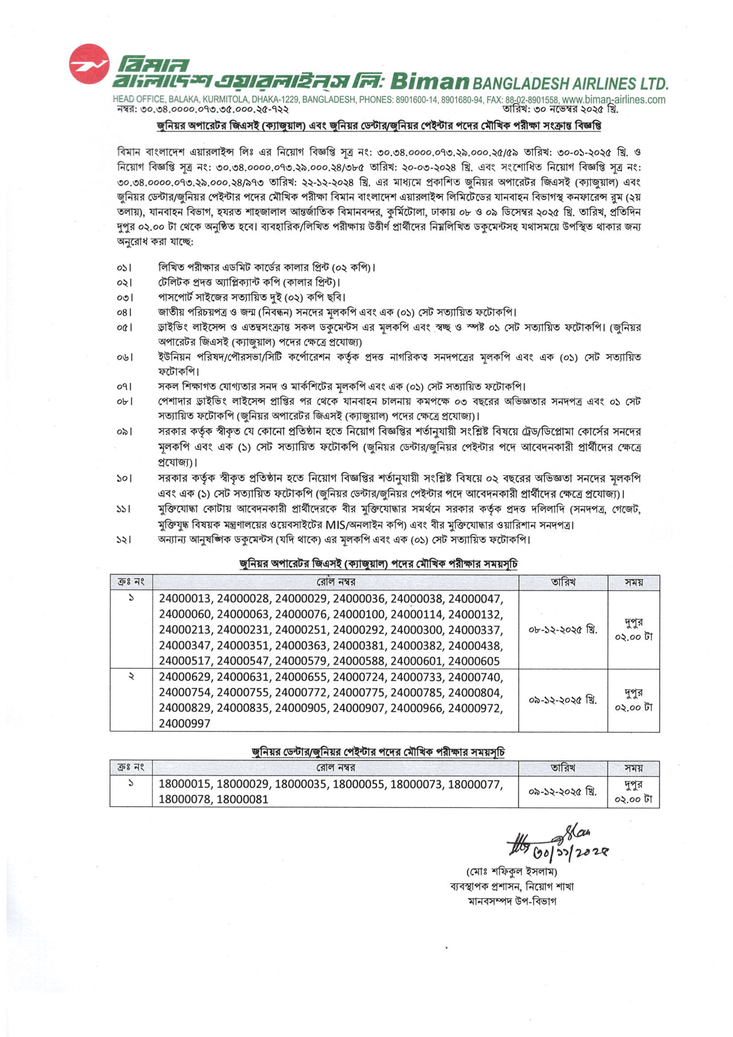 বিমান বাংলাদেশ এয়ারলাইন্স লিমিটেডের জুনিয়র অপারেটর জিএসই (ক্যাজুয়াল) এবং জুনিয়র ডেন্টার/জুনিয়র পেইন্টার পদের মৌখিক পরীক্ষার সময়সূচি প্রকাশিত হয়েছে।